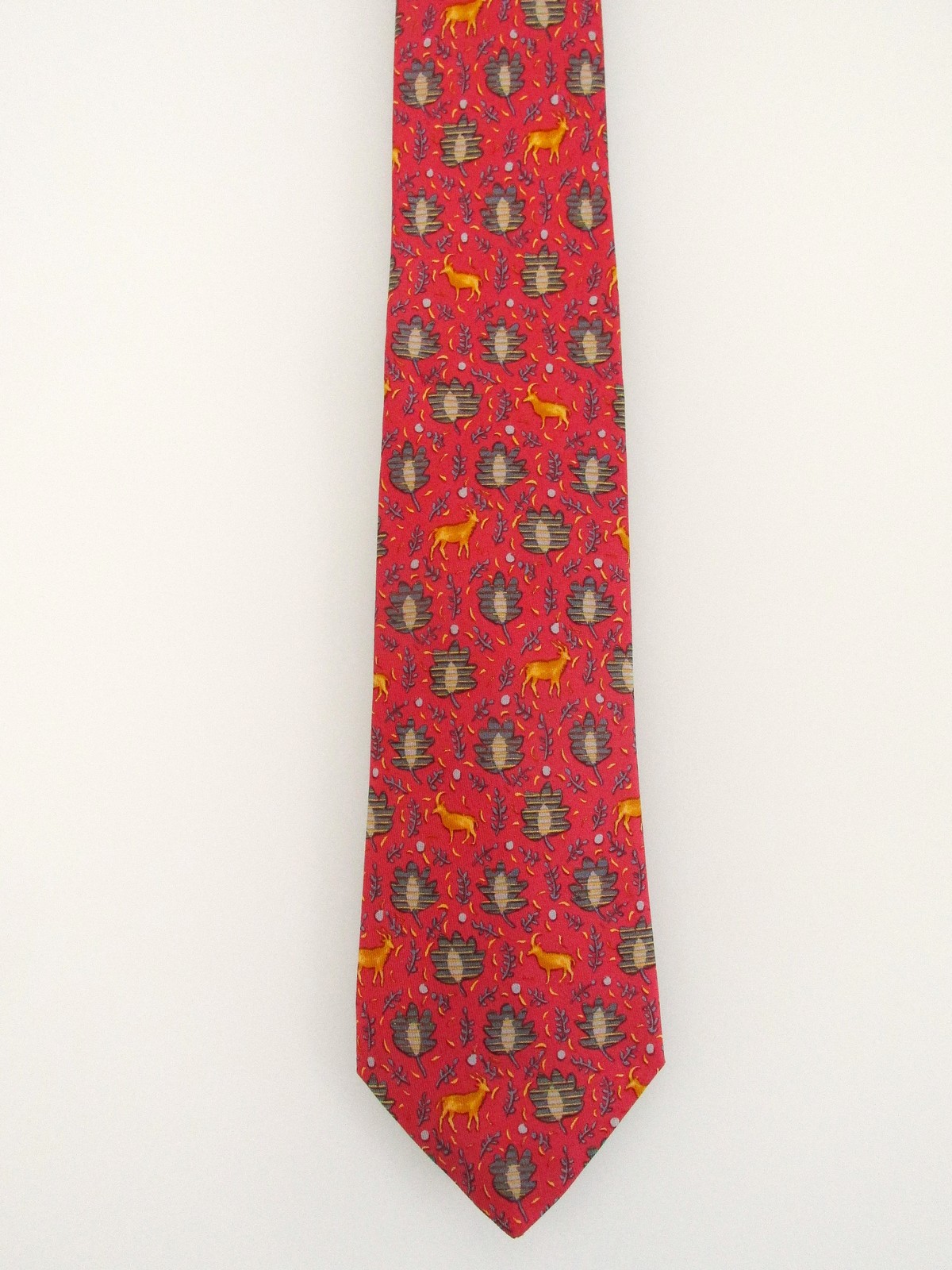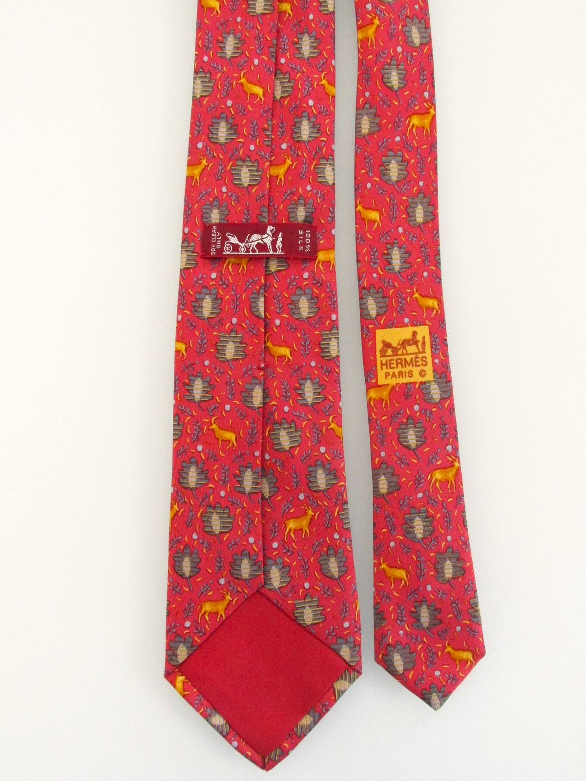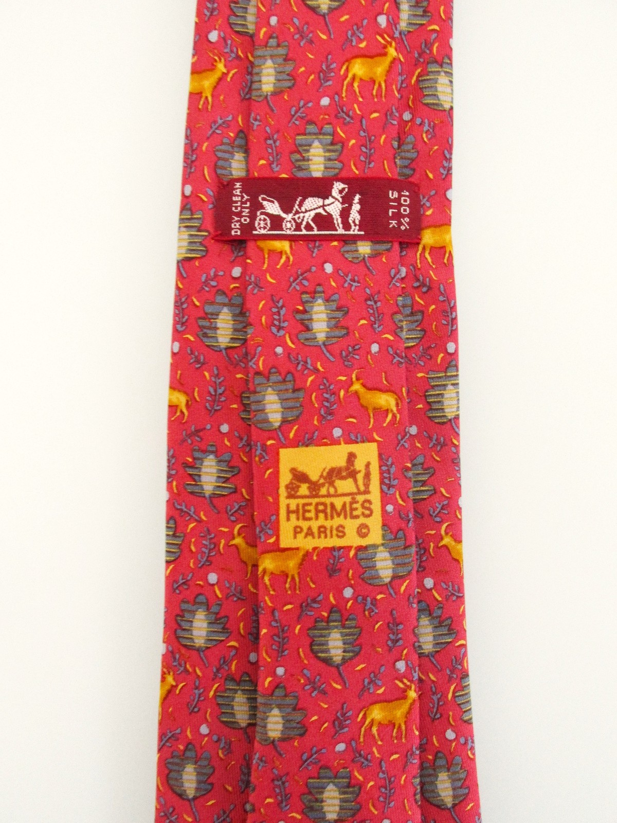 Description: Up for sale is a Hermes vintage men's silk tie. The print # is 7069TA. Hermes ties are handmade and hand-finished in France of the finest silk. Dimensions are approximately 54" long x 3.00" wide. The tie has a multicolored animal leaf motif in gold, green, blue gray on a pale red background.