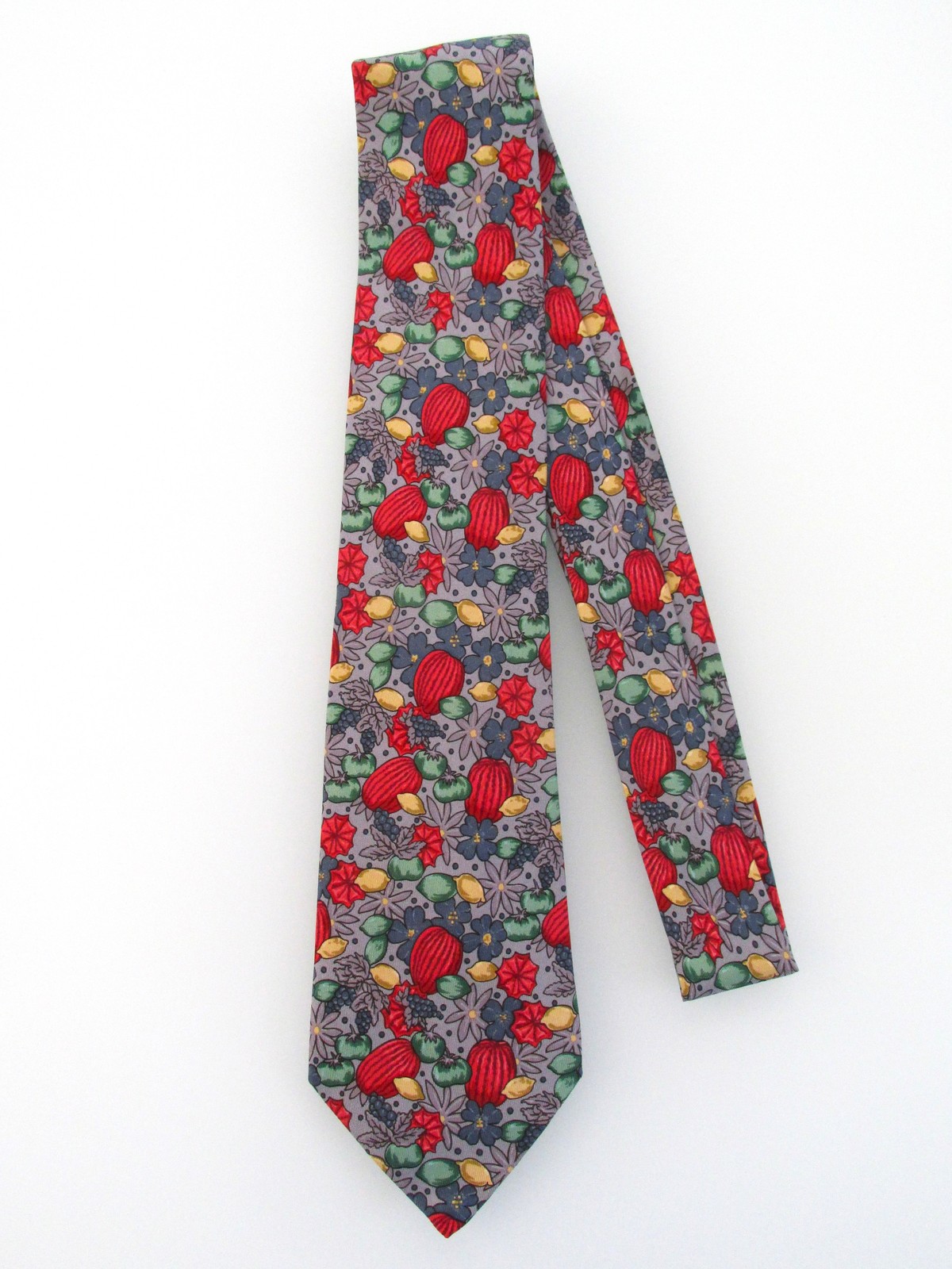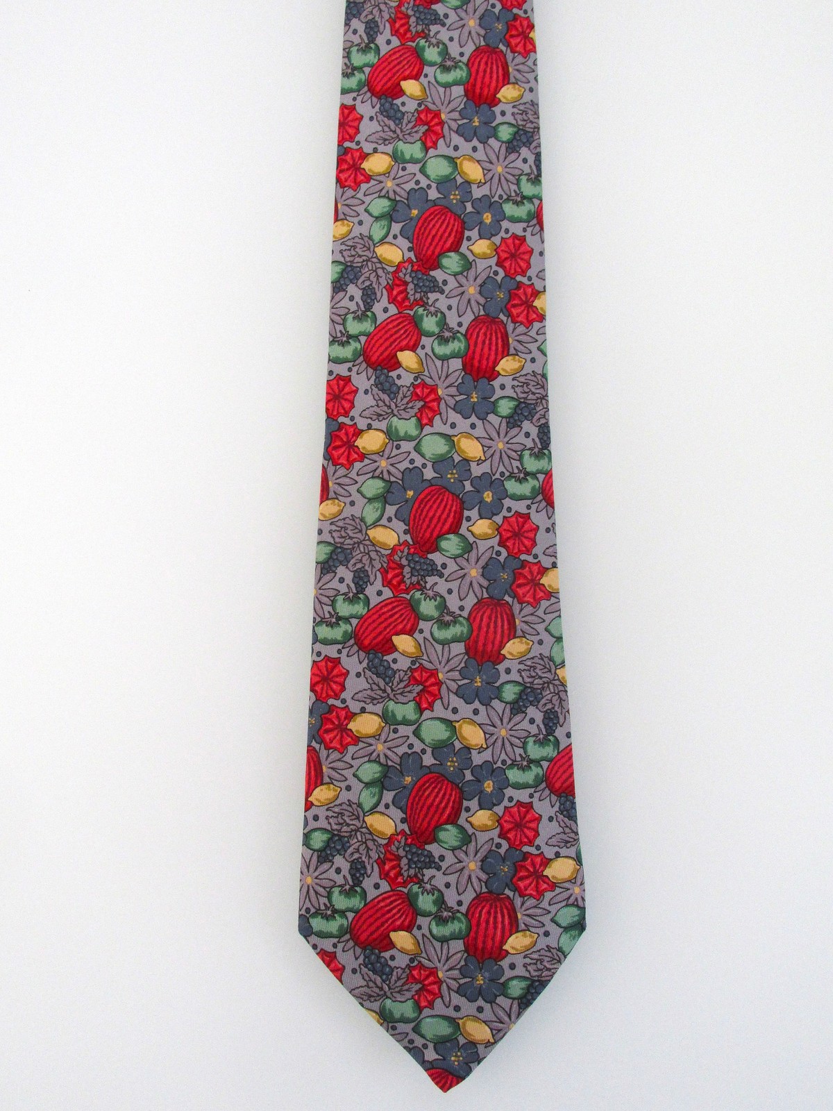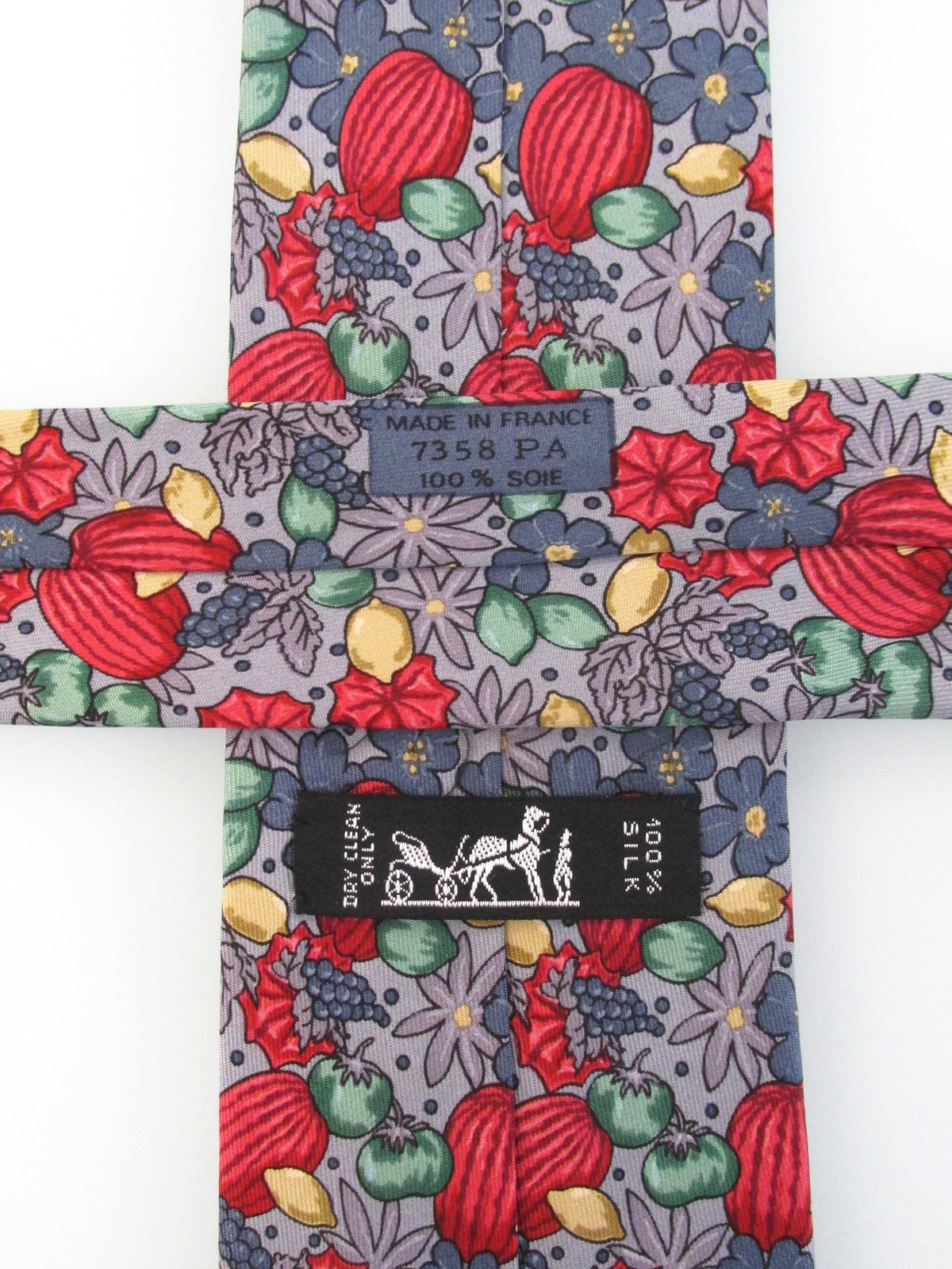 Description: Up for sale is a Hermes men's silk tie. The print number is 7358 PA. Hermes ties are handmade hand-finished in France of the finest silk. Dimensions are approximately 56" long x 3 3/8" wide. It has a multicolored fruit floral motif in yellow, green, blue red on a light gray background. This tie is in excellent condition.