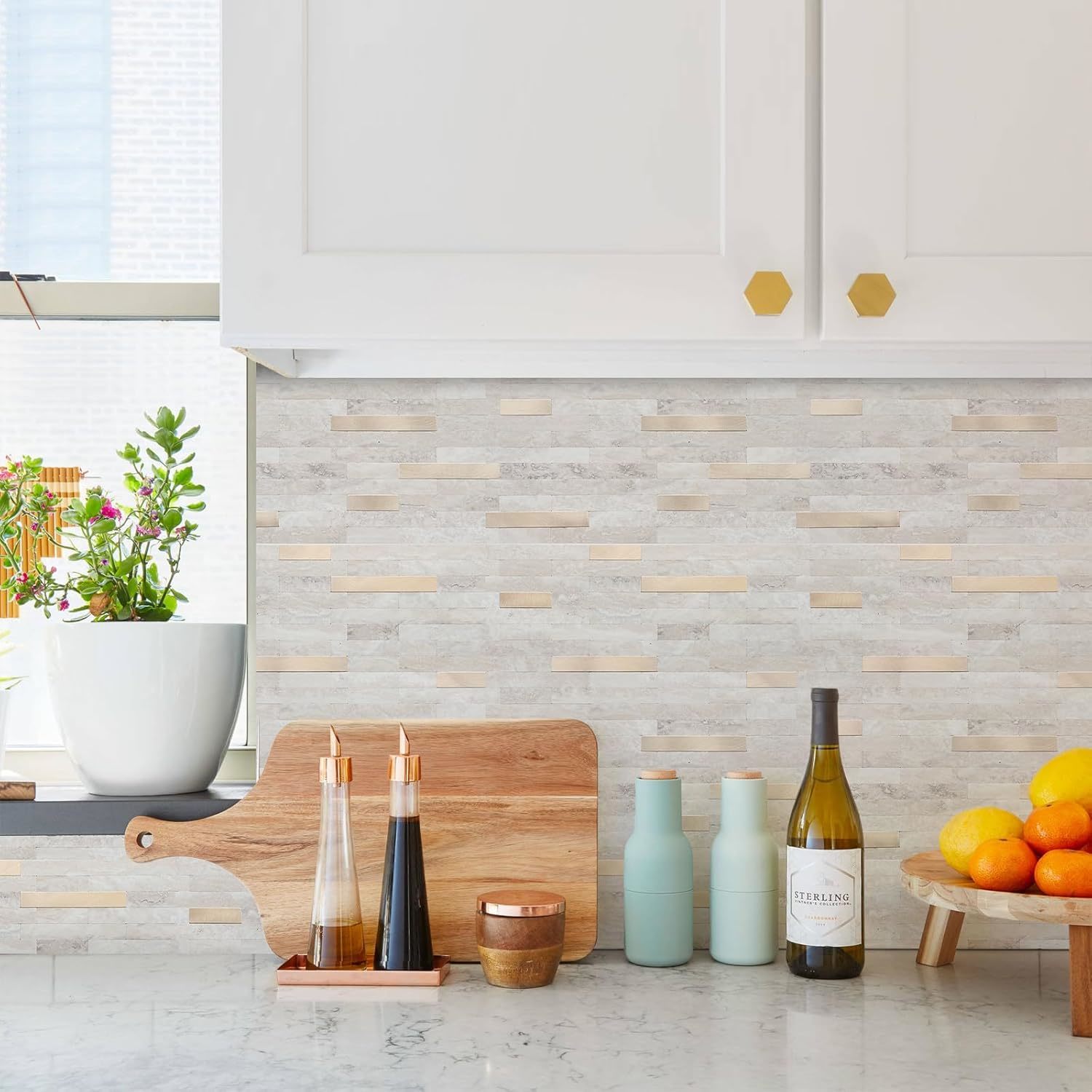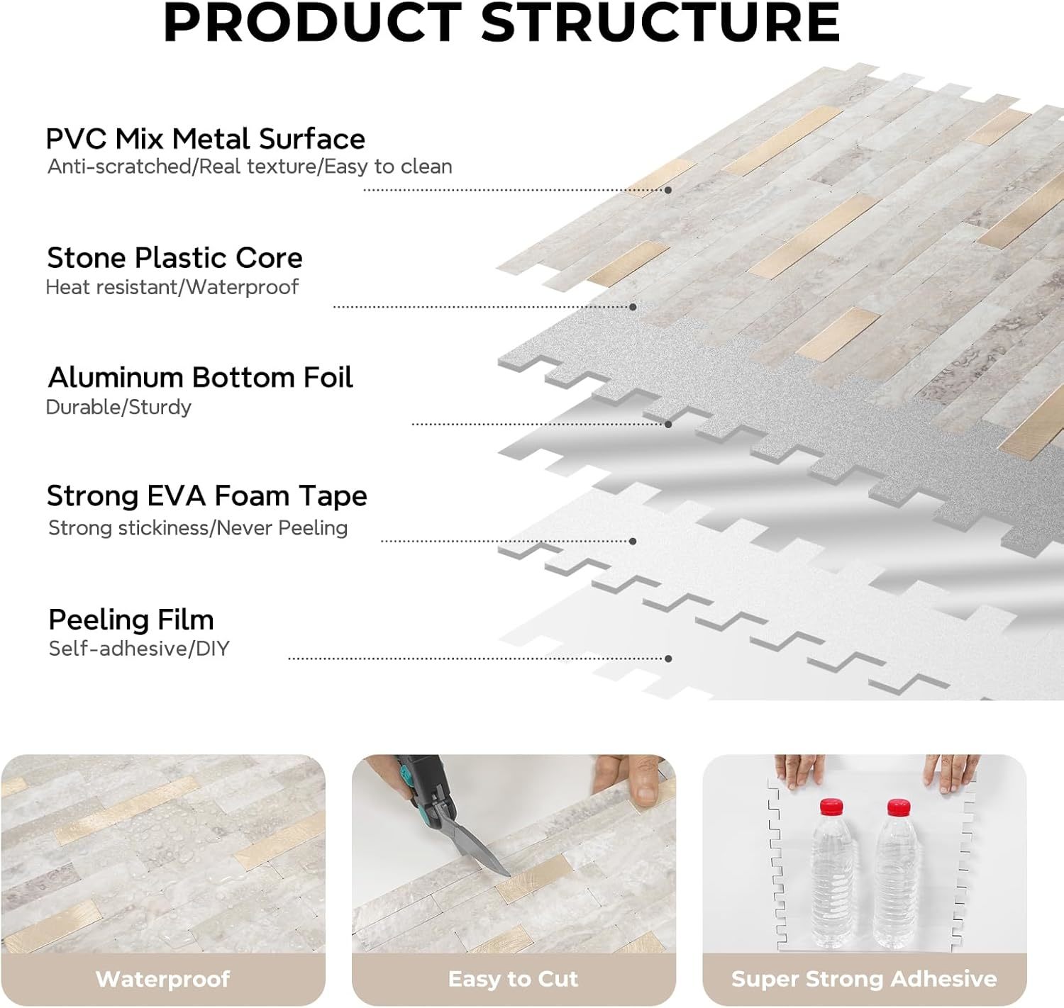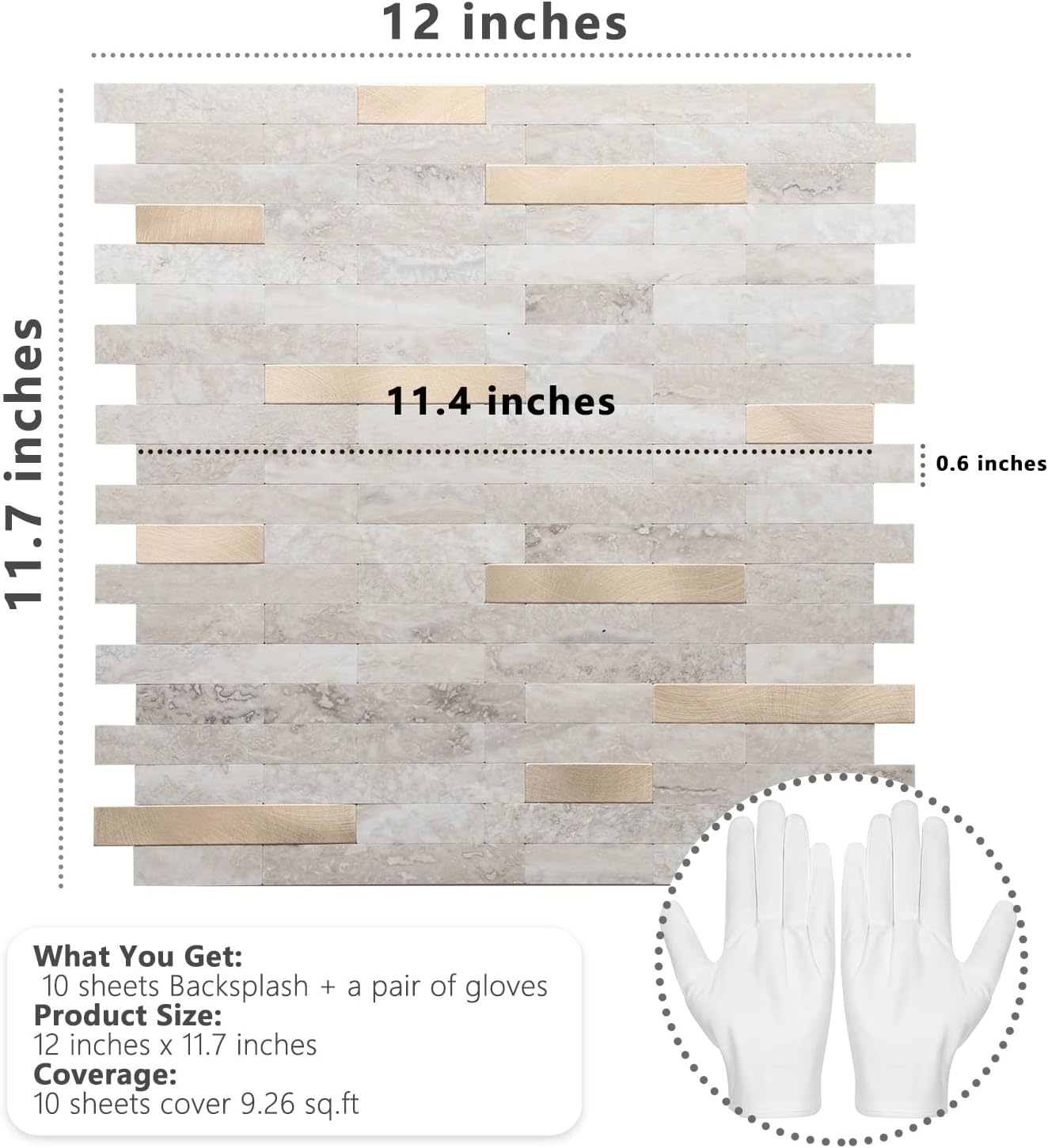 Brand: STICKGOO Material: PVC mixed metal Size: 12 inch x 11.7 inch Color: Beige with Metal Gold Finish Type: Laminate Style: Modern Installation Type: Peel and Stick Product Dimensions: 12"L x 11.7"W Pattern: Geometric, Marble Shape: Rectangular Edge Style: Square Edge Unit Count: 9.75 Square Feet Recommended Uses For Product: Kitchen, Bathroom Coverage: 9.75 Sq Ft Form Factor: Oblong Special Feature: Waterproof, Heat Resistant, Easy DIY Installation, Scratch Stain Resistant Manufacturer: STICKGOO Direct Item Weight: 6.91 pounds Finish: Laminate Item Package Quantity: 10 Number Of Pieces: 10 Special Features: Waterproof, Heat Resistant, Easy DIY Installation, Scratch Stain Resistant Batteries Included?: No Batteries Required?: No Brand: STICKGOO Material: PVC mixed metal Size: 12 inch x 11.7 inch Color: Beige with Metal Gold Finish Type: Laminate Style: Modern Installation Type: Peel and Stick Product Dimensions: 12"L x 11.7"W Pattern: Geometric, Marble Shape: Rectangular