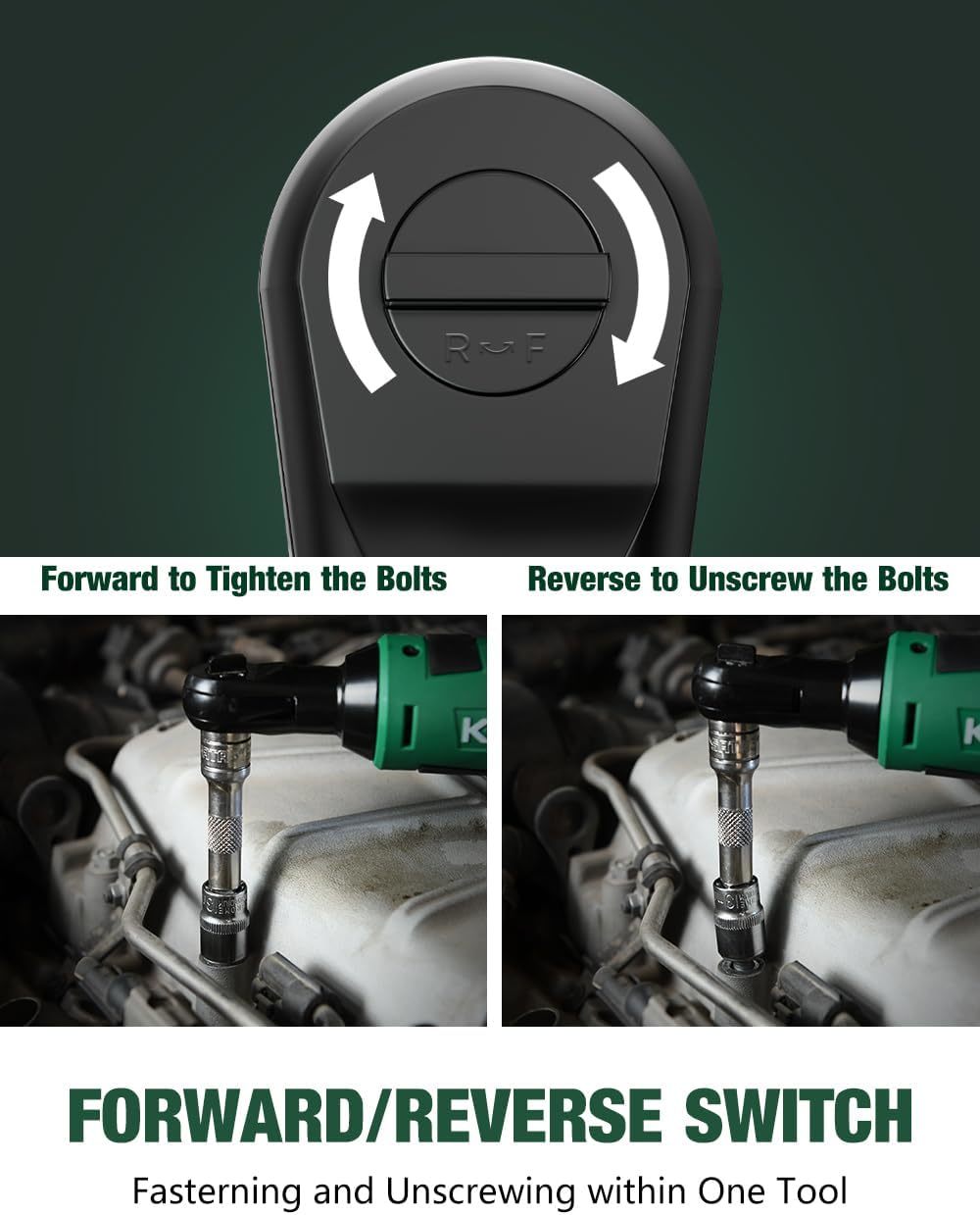 ?Eliminate Cords Loud Air Hose?With a max torque of 40 ft-lbs at 400 RPM and a variable speed trigger, KIMO cordless ratchet performs just like your air ratchet but without the annoying cords and the constant loud noise from the air hose. ?2 Backup Batteries Extend 40 Mins Running Time?Comed with 2 Packs of li-ion batteries, you can enjoy uninterrupted power by alternating between them, doubling the operating time. This backup battery ensures that while one battery is in use, the other can be charged, providing seamless power without downtime. This is an advantage for those who need continuous operation, not only reducing the wear on each battery, but also ensuring that the cordless wrench can be used longer. ?Recessed Head Design for Tight Spaces? The unique recessed head profile is designed for working in tight spaces. The compact head design of KIMO battery ratchet wrench greatly reduces physical obstacles, allowing users to easily enter and handle narrow or hard-to-reach areas. The strategically recessed design not only allows easy access, but also improves precision and control during use, making it a valuable tool for professionals who often encounter space constraints on the job. ?Variable Speed for Precise Control?KIMO cordless wrench ratchet is equipped with a 0-400RPM variable speed trigger, which allows the speed to be precisely adjusted to your exact needs. Allowing the speed of the wrench to be fine-tuned to meet the specific requirements of various jobs, ensuring optimal performance and precision. Especially in tasks that require delicate manipulation or precise control. Variable speed of the wrench helps create a more controlled and safer working environment. ?KIMO Complete Electric Wrench Ratchet Set?KIMO electric wrench comes with 2 X 1000-Charge Cycle 12V 2.0Ah KIMO Power Batteries, 1 X 60-minute Fast Charge, 1 X KIMO BMC Case, 7 X Standard Sockets(10mm, 11mm, 12mm, 13mm, 14mm, 15mm, 17mm) , 1 X 3/8-Inch to 1/4-Inch drive adapter. KIMO has provided you with an all-you-need Ratchet Wrench Work Kit. ?Forward / Reverse Switch, Effortless Bolts Adjustment? Electric ratchet wrenches can easily adjust bolts / nuts and are a high-quality alternative to manual wrenches. By automating the tightening and loosening process with Forward / Reverse Switch, the physical effort required for manual operation is minimized, making it an ideal choice for tasks that need to be completed accurately and quickly without the use of hand tools. ?Industrial-Grade Chrome Head for Heavy-Duty Use? The head of KIMO ratchet 3/8 is made from Industrial-Grade chrome vanadium steel, a material known for its superior strength and durability. This premium material has a high corrosion resistance, allowing it to work reliably in wet and acidic environments without rusting, ensuring that the wrench head can be used up to tens of thousands of times, providing a long service life and reducing the need for frequent tool changes. ?Multiple Sockets for Various Purposes?Equipped with a 3/8" drive head and 8 Packs of sockets, allowing you to seamlessly transition between different bolt and nut sizes without the need for additional tools. It provides users with the flexibility to handle a range of fastening tasks, whether involving common home repairs or specialized industrial applications. This ratchet wrenches set can easily complete a variety of fastening tasks, improving convenience and efficiency. ?Compact Lightweight? Weighs merely 2.2 lbs (w/ battery) plus its ultra-slim head design, KIMO electric ratchet can reach any tight spots to ratchet nuts and bolts effortlessly, making it perfect for any auto maintenance, construction or home repair work. ?Built-in LED Smart Power Indicator? Equipped with LED, the KIMO 3/8" impact ratchet can illuminate the work area on a dark night. A unique onboard fuel gauge will remind you remaining run time while working. Need not worry the cordless ratchet wrench set will stop suddenly when working.