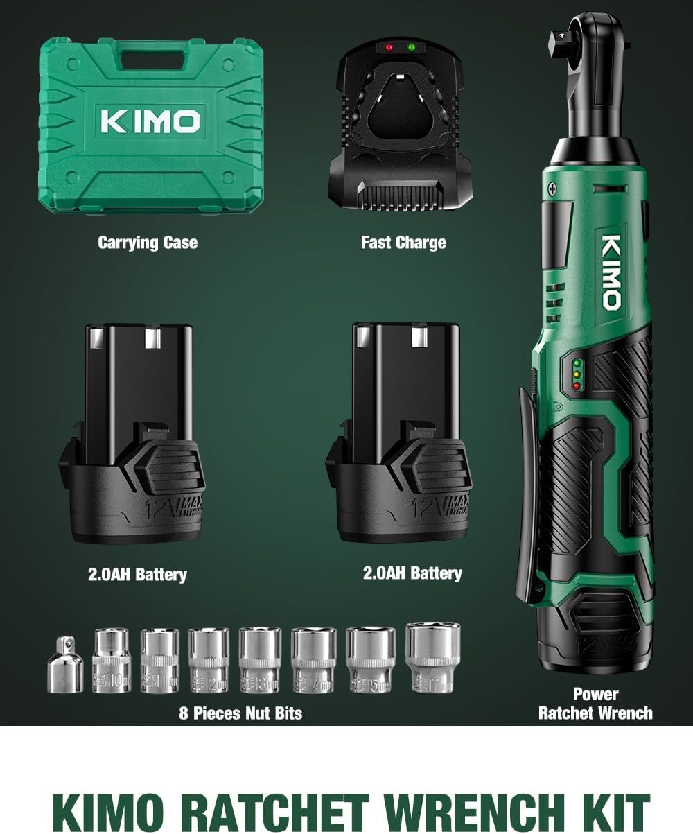 KIMO Cordless Electric Ratchet Wrench Set, 40 Ft-lbs, 400 RPM, 12V Green