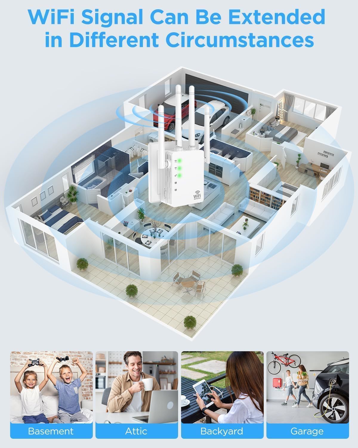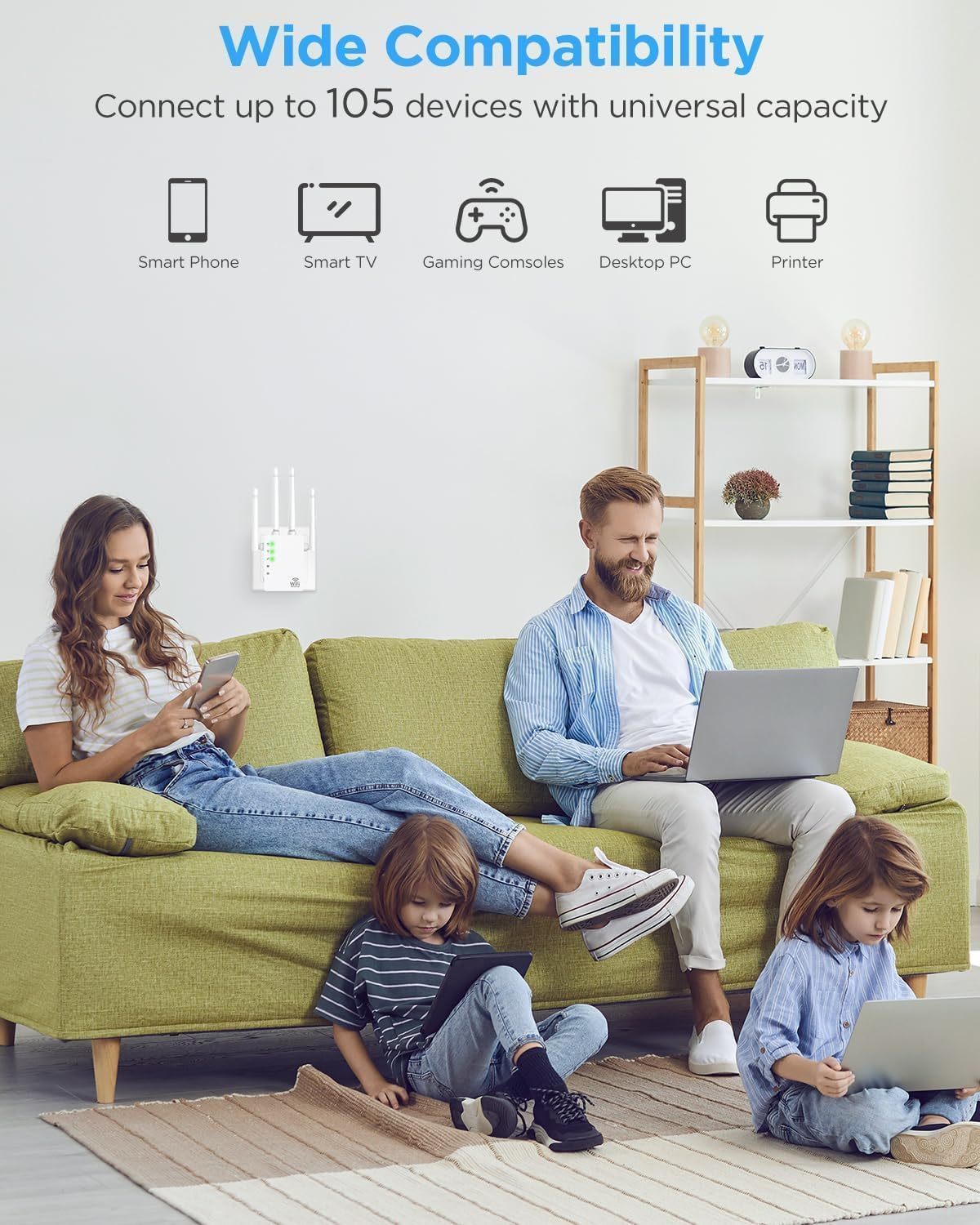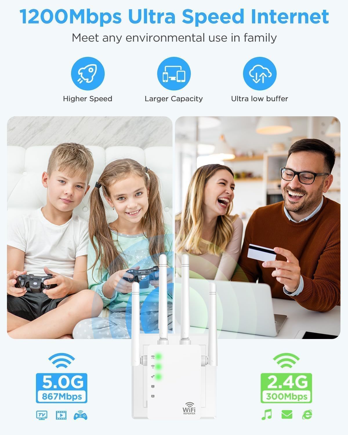 3 Modes To Meet Any Challenge: The wifi repeater has three modes: AP Mode/Repeater/2 Ethernet Port. Whether you're working online, studying online, or simply streaming media, this 3-mode wifi extender can help you do it all. This wifi repeater is compatible with most routers and 105 devices on the market, such as smart TVs, desktops and more. Meet your different needs. Best Wifi Extender Signal Enhancer: You can find the best location for your wifi repeater by following the signal indicator light (the better the signal is about the more lights are on). WiFi Enhancer extends your Internet wireless network to every corner of the house, eliminating frustrating dead zones, buffering, and dropped video calls. Even front porches, backyards and garages maintain a stable signal. State of The Art Security: This wifi range extender has an embedded security encryption module that works with our 2.4/5GHz dual-band processor to maximize network security and make your WiFi more secure. It creates a strong wall of defense for business and privacy protection to safeguard your important data. Perfect for home, business and traveling. Easy And Friendly Setup: Press the WPS button to connect to your device in seconds and easily extend your wireless coverage. Plug in, tap the button to connect to wifi, and enter your password to complete the setup. The setup process is simple and straightforward. The user manual make it easier for you to understand and get started. Easy to set up 1200Mbps wifi extender signal booster. Superior Network Signal: The wifi booster extender provides a stable, strong signal. This wifi extender come with dual band technology and 4 high-gain antennas, provide up to 300Mbps for 2.4GHz, up to 867-1200Mbps for 5Ghz. Enjoy smoother and more reliable streaming, gaming, downloading and more.
