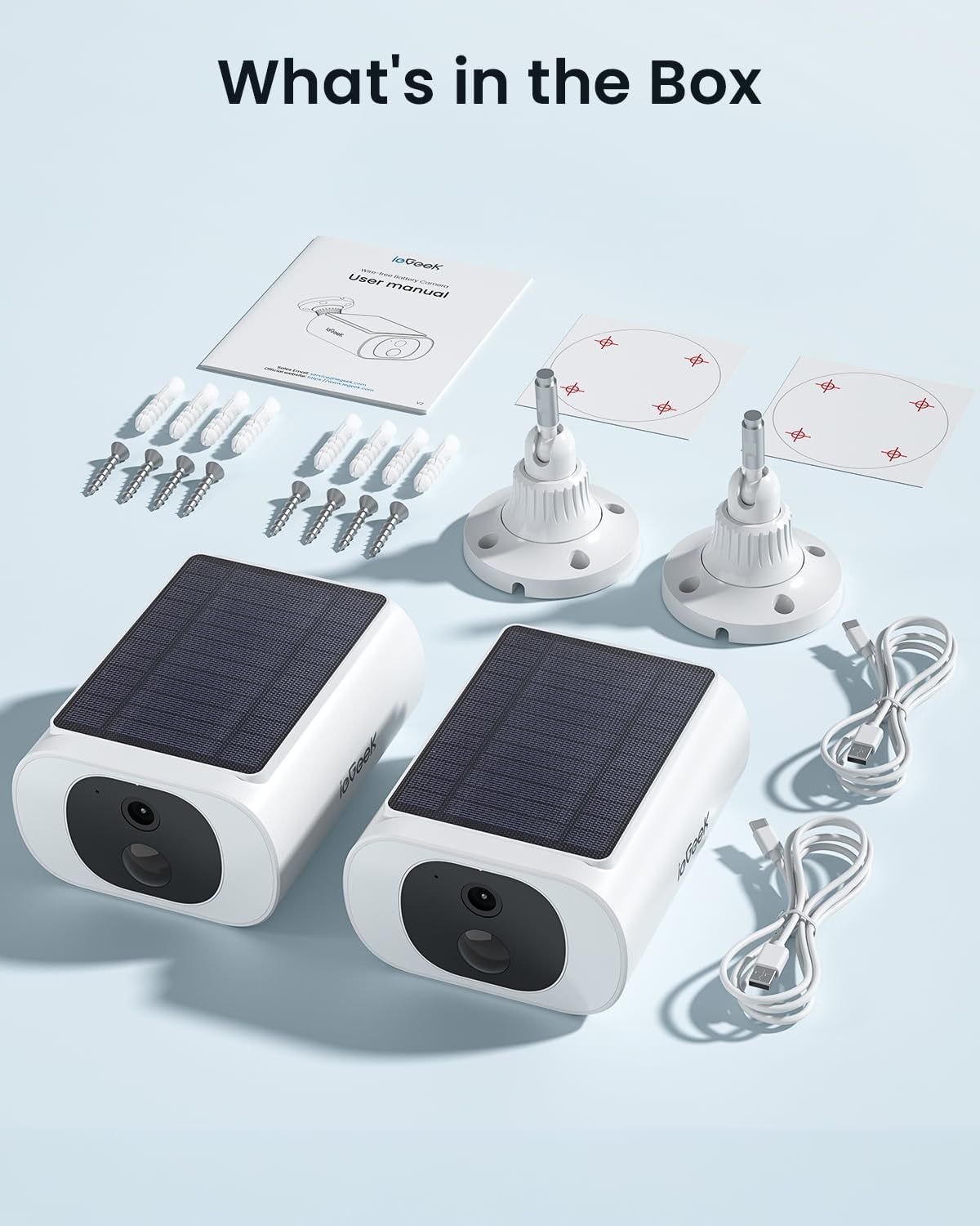 ? , ?Introducing the new all-in-one ieGeek Solar Cam S1 that eliminates the need for a power cable and separate solar cable, drill one hole, once. This seamless design offers flexible installation for effortless setup, Tiny but mighty. ? , ?This solar camera outdoor allows for local footage storage via a micro memory card (up to 128GB, not included) or offers complimentary lifetime access to the ieGeek cloud storage basic service (records 6 seconds with a 7-day looping coverage). There are no hidden fees associated with storage. ?- , ?These security cameras wireless outdoor features a 1/2.9" 2K 3Mega color CMOS sensor, brings enhanced resolution as well as good dynamic range. As night falls, this home security camera with keen sharp eyes can still see in total darkness and capture crystal clear image. Bright spotlights on camera will reveal details in color, and evidence has nowhere to hide. ? , ?This wifi smart camera is equipped with advanced PIR motion sensor and has a powerful human shape database, can accurately distinguishes people from other objects. Once motion is detected, you will get instant notifications on ieGeek Cam, then you can hear and speak to visitors or activate siren and bright spotlights to deter intruders. It also supports AI analysis(paid feature), which can discern people, pets, vehicles and packages. ? ?ieGeek security cameras uses the advanced encryption standard technology AES128, a comprehensive data defense system, and more to ensure your privacy data never leaves the safty of your home, and is accessible by you alone. Your privacy is our top priority.