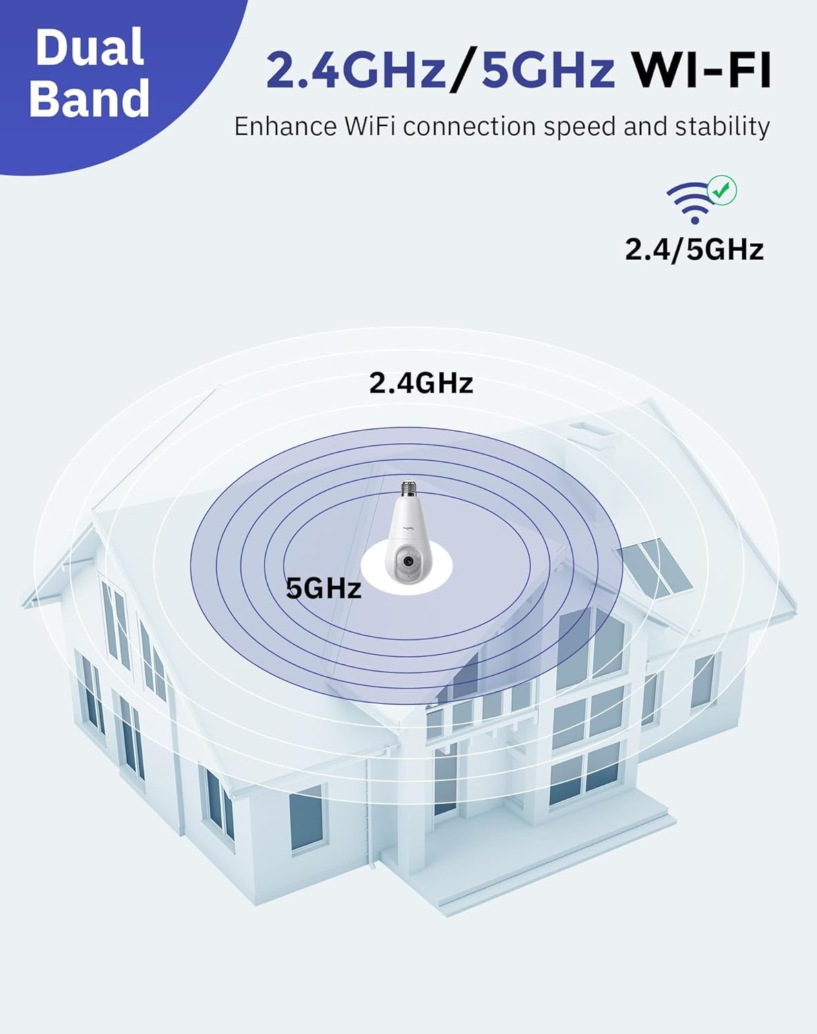 5GHz 2.4GHz Dual Band Connectivity: Enjoy uninterrupted real-time video streaming with the 2K 3MP lightbulb camera; dual-band Wi-Fi ensures strong signal and extended range for seamless indoor and outdoor surveillance Effortless Installation with Easy-Pair Technology: Install the camera by screwing it into a standard E27 socket; the app detects and connects automatically via Bluetooth; eliminating the need for extra wiring or power for a simple home security setup 2K Starlight Night Vision: Capture sharp, full-color 2K images in low light with the advanced starlight sensor; the camera provides clear visibility up to 40X darker than traditional cameras for continuous 24/7 surveillance Advanced AI Detection Alerts: The camera's AI accurately identifies humans/pets/flames/packages and vehicles; it reduces false alarms and sends instant notifications for important events; enhancing home safety and security Secure Storage Multi-User Sharing: Choose between secure cloud storage and micro SD card for recording options; encrypted US-based servers protect your data; multi-user sharing can up to 20 people to access live streams; promoting shared home monitoring