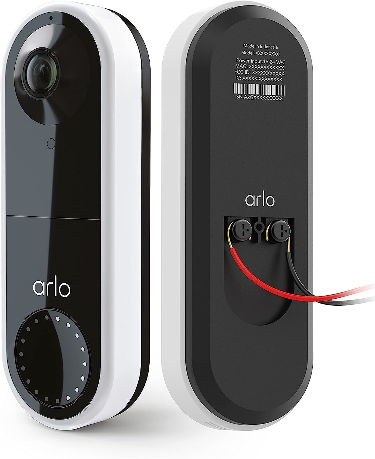 Indoor/Outdoor Usage: Outdoor Compatible Devices: Alexa Power Source: Corded Electric Connectivity Protocol: Wi-Fi Mounting Type: Wall Mount Video Capture Resolution: 1536x1536 Color: White Number of Items: 1 Included Components: Arlo Video Doorbell Wire-Free (1) Battery Charging Cable (1) Rechargeable Battery (1) Wire Extension (1) Flat Mounting Plate (1) Angled Mounting Plate (1) Wall Mount Screw Kit (1) Security Latch Release Pin (1) Quick Start Guide (1) Number of Channels: 2 Wireless Communication Technology: Wi-Fi Installation Type: Screw In Upper Temperature Rating: 45 Degrees Celsius Voltage: 24 Volts Wattage: 24 watts Item dimensions L x W x H: 1.77 x 0.98 x 5.11 inches Water Resistance Level: Water Resistant Batteries Required?: No Item Weight: 4 ounces Focus Type: Fixed Field Of View: 180 Degrees Low light technology: Night Color Zoom Type: Digital Zoom Zoom Ratio: 12x Alert Type: Audio and Motion Room Type: Office, Kitchen, Living Room, Classroom Light Source Type: Infrared Video Capture Format: ASF Unit Count: 1.0 Count Photo Sensor Technology: CMOS International Protection Rating: IP54 Maximum Webcam Image Resolution: 3840 Pixels Control Method: Voice Product Dimensions: 1.77 x 0.98 x 5.11 inches Item model number: AVD1001-100NAS Batteries: 1 Lithium Ion batteries required. Is Discontinued By Manufacturer: No Manufacturer: Arlo Recommended Uses For Product: Outdoor Security,Doorbell Brand: Arlo Model Name: Essential Wired Video Doorbell Connectivity Technology: Wi-Fi Special Feature: 2 Way Audio,HD Resolution,Night Vision,Motion Sensor