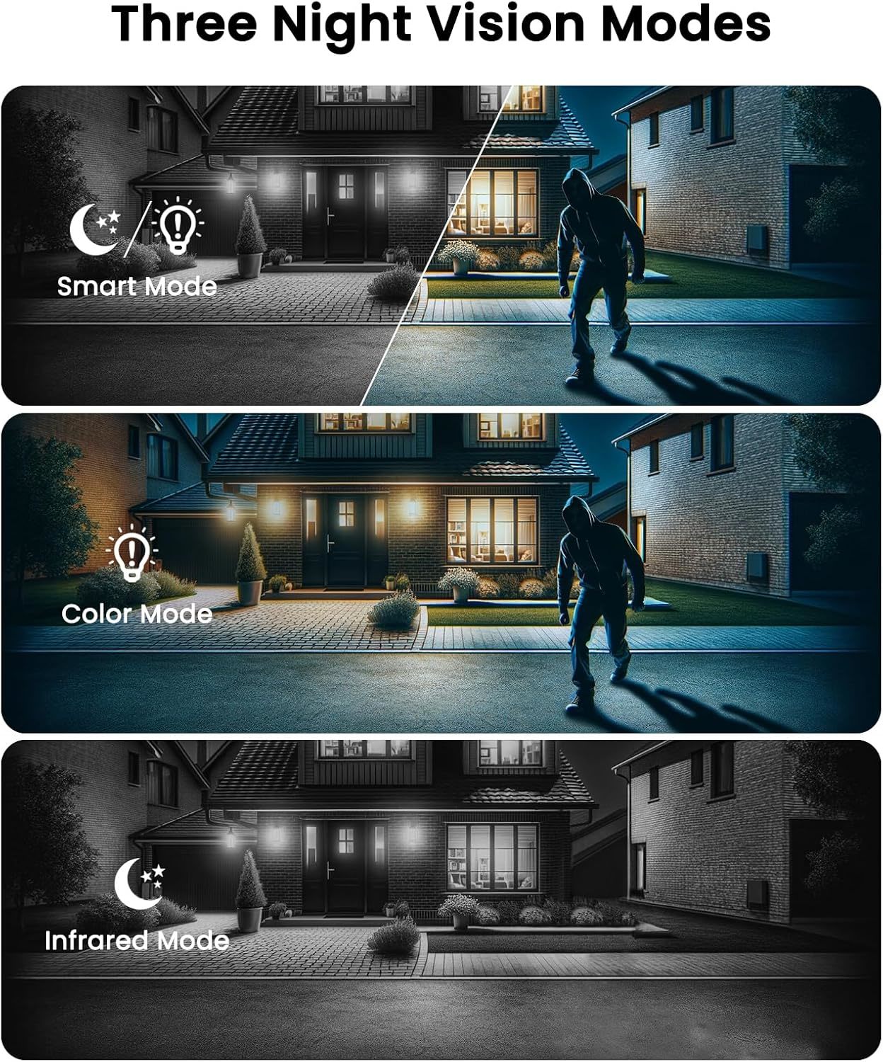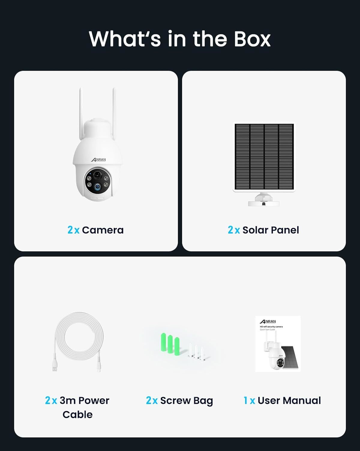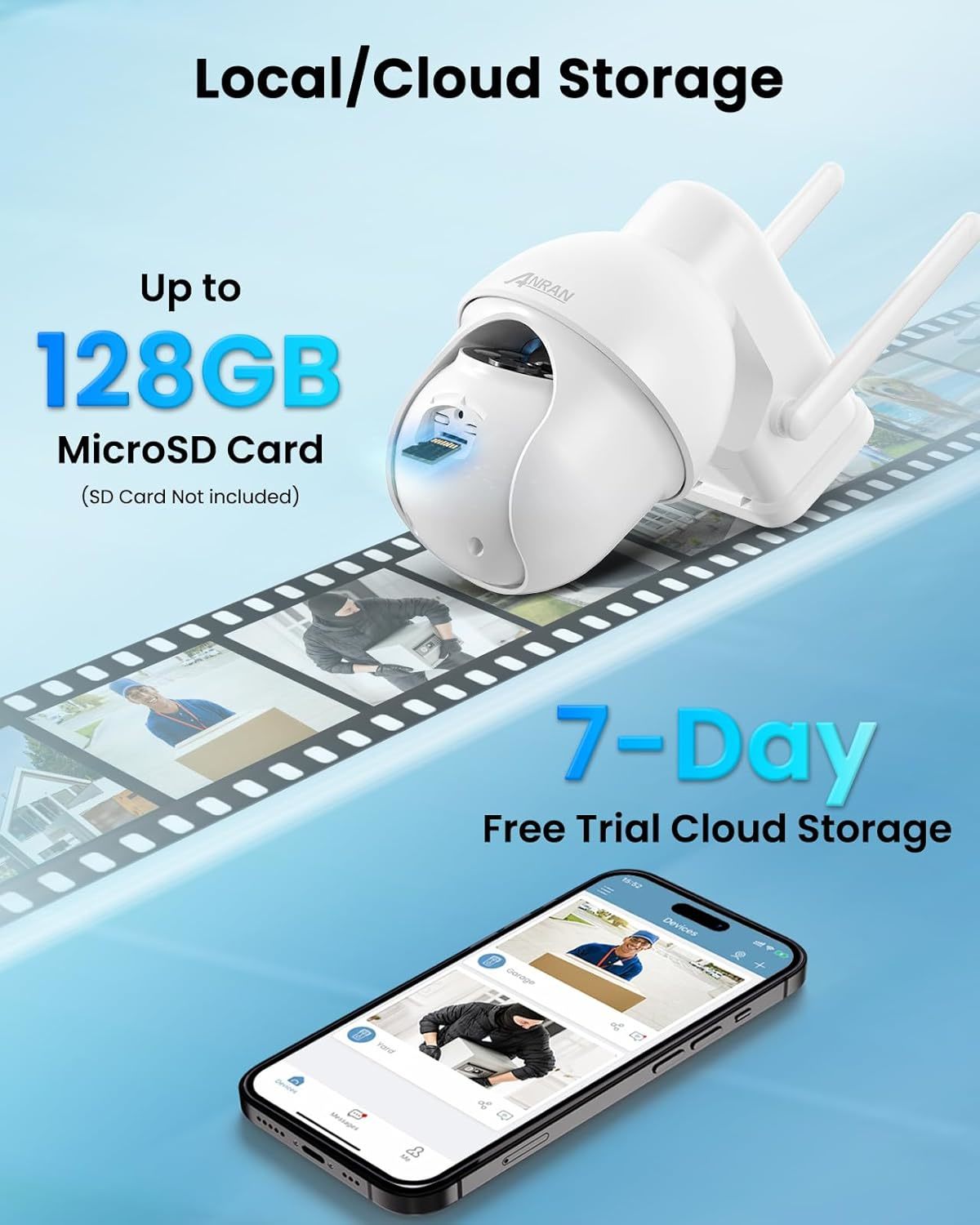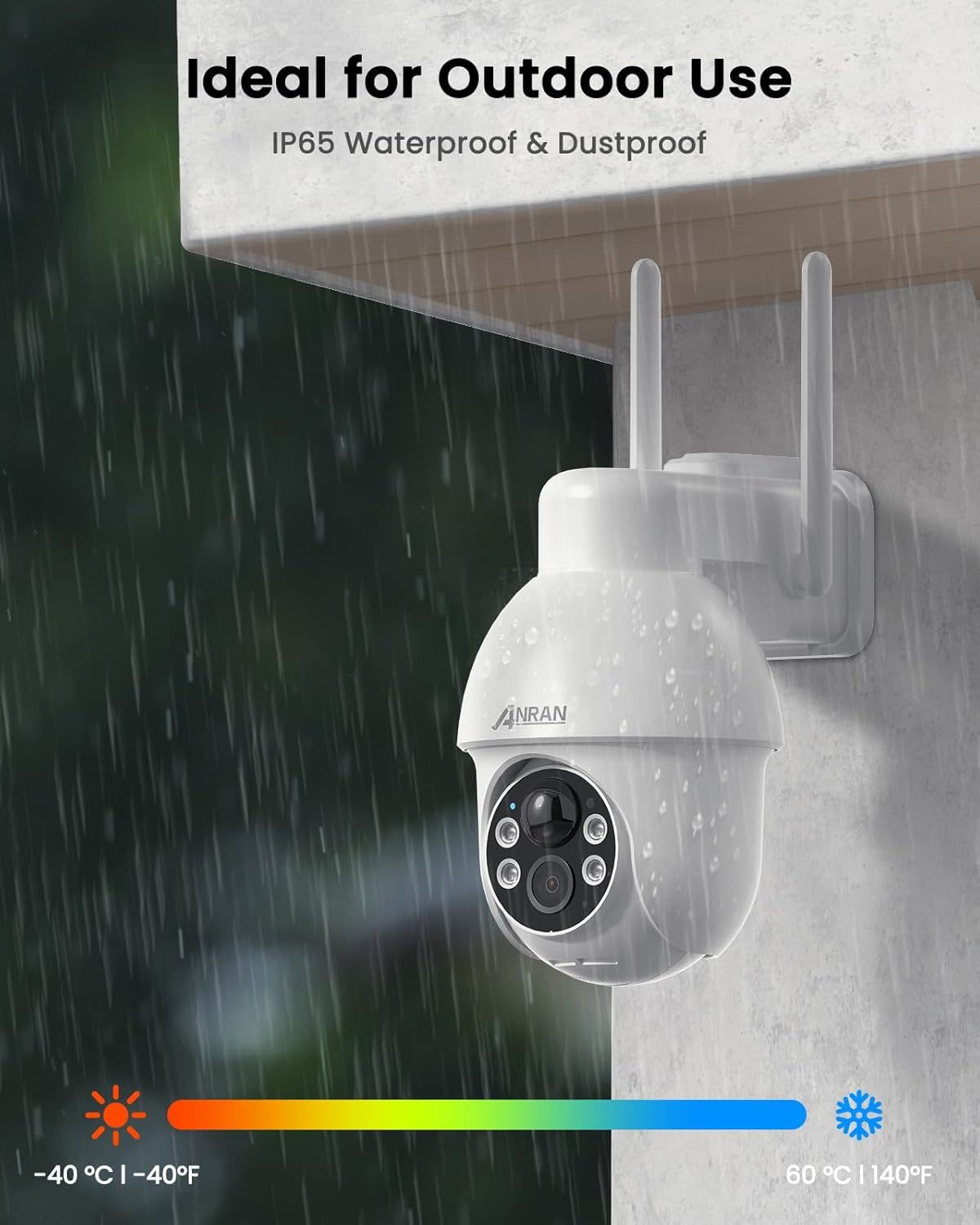 [2K Full HD with 360 PTZ View] The wireless camera features 2K resolution, delivering exceptionally clear and sharp images or videos both day and night. With its PTZ capabilities, including 355 pan, 90 tilt and 4X digital zoom, it provides a full 360 view, ensuring complete coverage and keeping your home fully protected. [Truly Wireless with Solar/Battery Power] ANRAN wireless solar outdoor camera uses a solar panel (included) to power the camera, eliminating the need for wiring. The backup battery ensures uninterrupted footage, even in bad weather or low light. Always ready to capture, providing reliable protection for your home. Notice: this outdoor camera only support 2.4G WiFi, 5G WiFi is not supported. [Color Night Vision Two-Way Audio] This ANRAN solar camera offers full color night, intelligent light and auto Infrared (up to 50ft) night vision modes. The camera?s built-in microphone and speaker enable clear two-way audio. When it detects a person, you can interact in real time with visitors or potential intruders via your mobile device, allowing you to monitor and communicate from anywhere. [Advanced PIR Motion Detection Real-Time Alerts] The spotlight security camera illuminates the surrounding area when motion is detected. With advanced motion and AI human detection, you?ll receive real-time alerts, ensuring timely notifications on your phone, wherever you are. Additionally, this wireless outdoor camera offers three alarm options: siren, spotlights, and app notifications. [Local/Cloud Storage and Works with Alexa] ANRAN wireless outdoor security camera supports both local storage via an SD card (up to 128GB, not included) and optional cloud storage with encrypted data and privacy protection. It also integrates seamlessly with Alexa for added convenience.