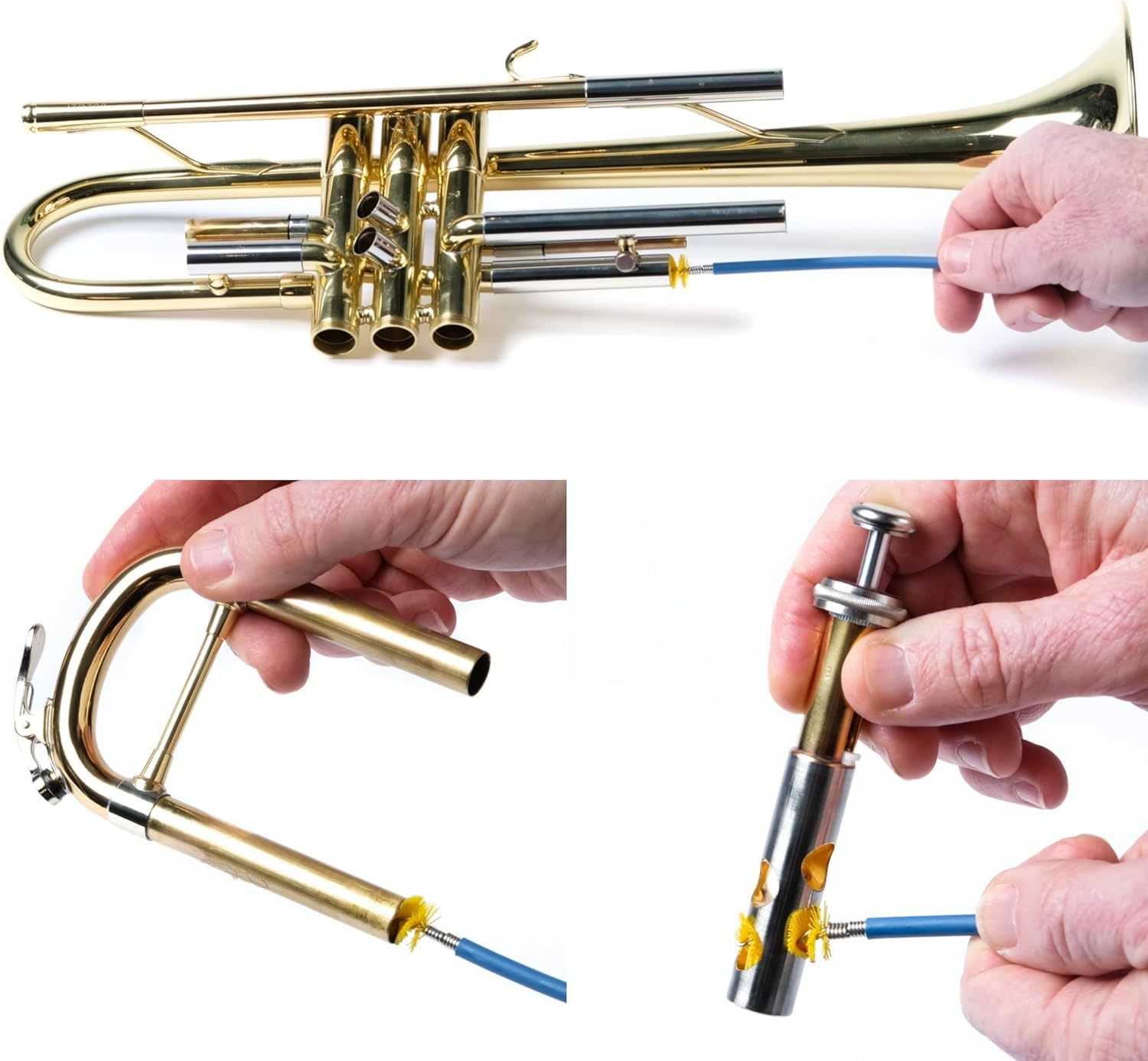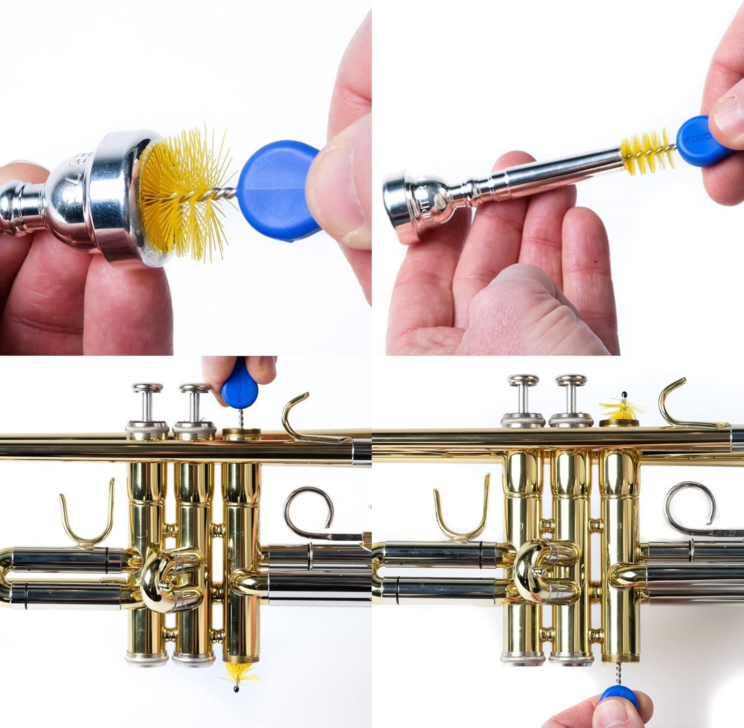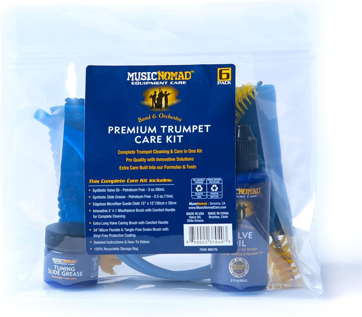 MusicNomad has set a new higher standard for what you should expect when you buy a trumpet cleaning care kit. Each product is so well thought out that you will appreciate each feature benefit it will bring you your trumpet EXCLUSIVE CLEANING TOOL DESIGNS: Designed by our team in Sonoma, CA (USA). Our 2 'n 1 Mouthpiece Cup Brush is like no other with our premium fibers ergonomic handle. Extra long Valve Casing Brush covers 100% of valve casing with premium fibers an ergonomic handle. 34"/86 cm Snake Brush with premium fibers, a Vinyl free innovative waterproof protective liner that uncoils straight. Premium large 12" x 12" microfiber suede cloth with 90,000 fibers per square inch MADE IN USA PRO STRENGTH FORMULAS: Our premium synthetic Valve Oil (2 oz) is scientifically designed to provide long lasting, fast valve action. Our premium synthetic Tuning Slide Grease (.5 oz) is the ideal viscosity long lasting to help lubricate your slides. Both formulas are odorless used worldwide by beginners, pros repair shops DETAILED VIDEO PRINTED INSTRUCTIONS: We include step-by-step printed instructions anybody can follow making cleaning caring with this kit a breeze. We even have detailed how-to videos for more guidance an in-house tech if you need further help EXTRA CARE INITIATIVES: Comes with a convenient resealable storage bag that is made with recyclable PET/PE material. Since 2010, MusicNomad, located in Sonoma, CA (USA) designs engineers best in class instrument care products used by countless musicians repair techs in over 40 countries. Our One For Music program gives a percentage of each sale to music non-profits