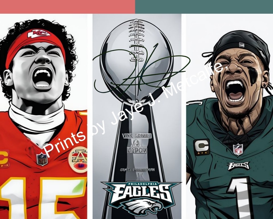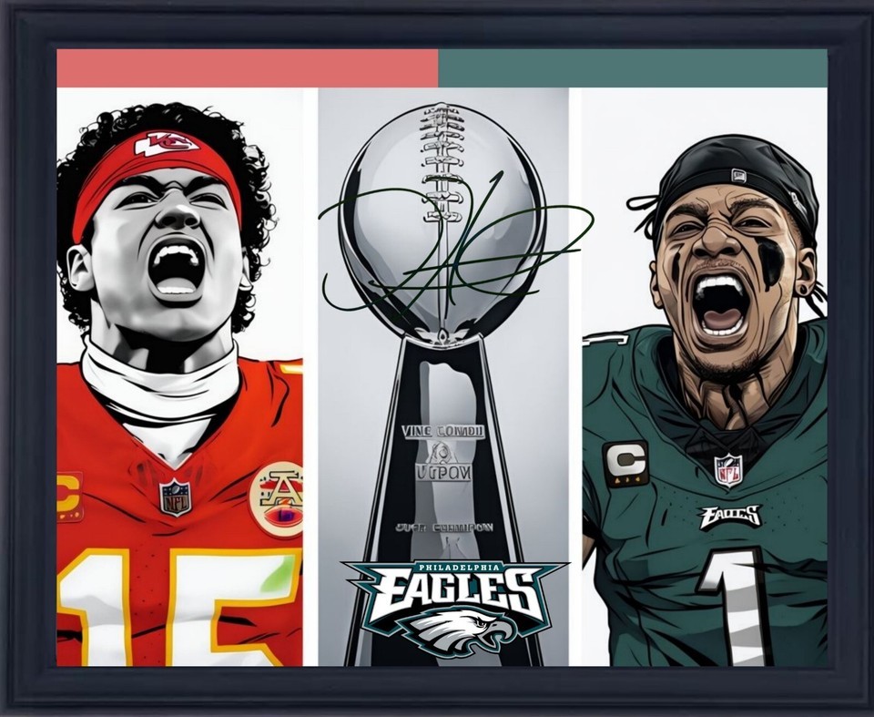 Celebrate the Philadelphia Eagles' remarkable 2025 Super Bowl victory with this commemorative 11x14 poster featuring quarterback Jalen Hurts. The poster, elegantly framed, is a must-have for fans and collectors alike, capturing the essence of the team's triumph and the player's prowess on the field.