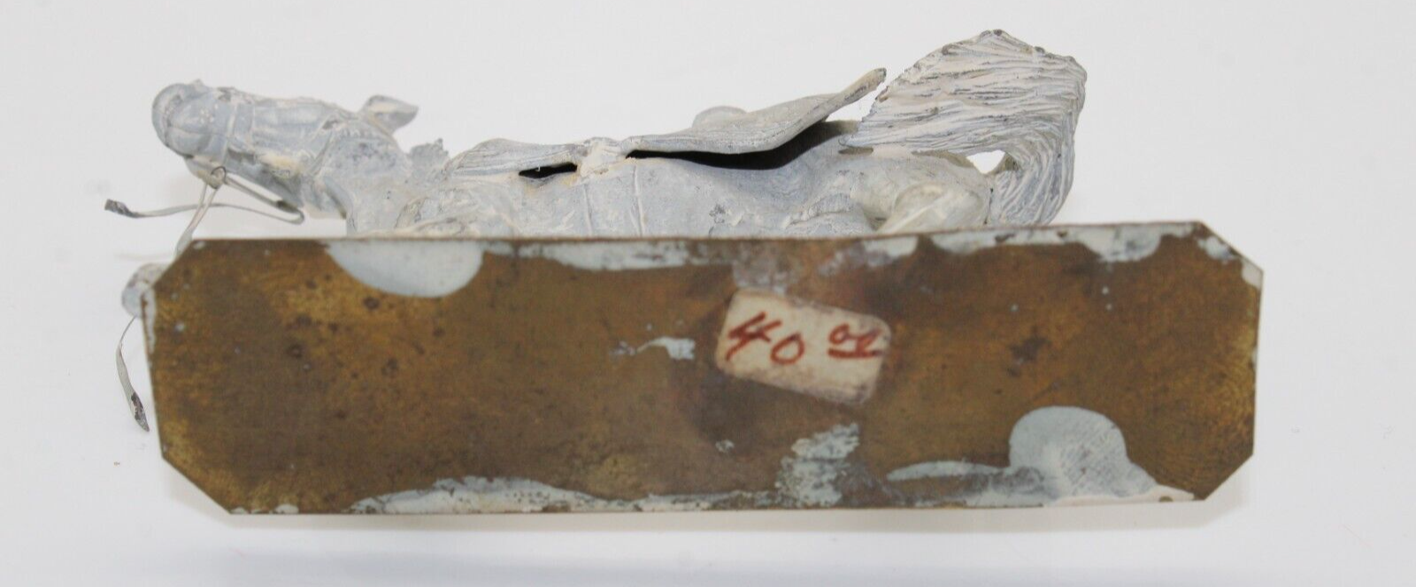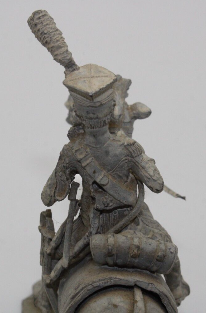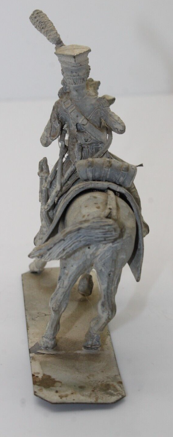 The vintage lead horse and cavalry soldier toy stands at 3 3/4 inches tall, featuring intricate details and craftsmanship. This unpainted toy is designed to represent a cavalry soldier riding a horse, making it a part of the soldier type cavalry category. Suitable for individuals aged 17 years and up, this pre-1970 toy soldiers set is a collector's item that showcases historical military figures. The lead material used in its construction adds to its authenticity and vintage charm.