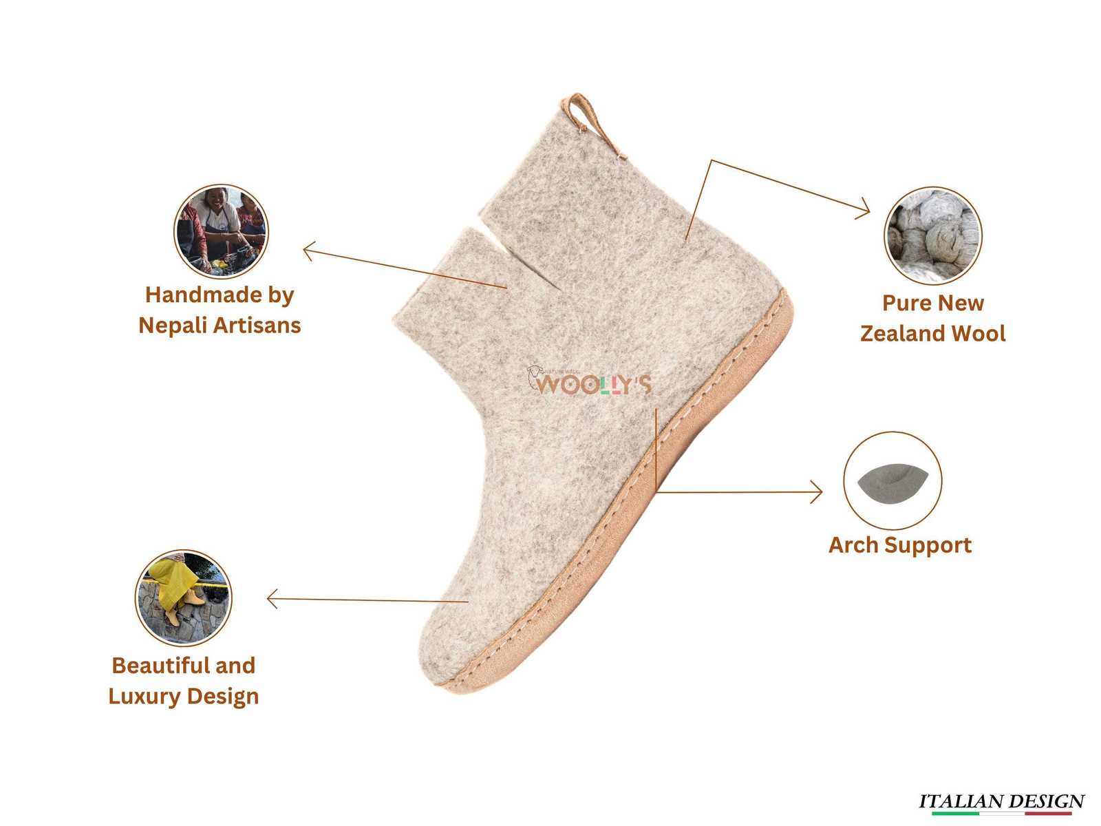 The Woollyes handmade wool felt indoor boots are crafted from the finest quality New Zealand wool, known and appreciated worldwide for its superior quality. These boots are ideal for indoor wear, offering excellent breathability, moisture control, and all-day comfort. The durable suede leather sole provides stability and support on any indoor surface.