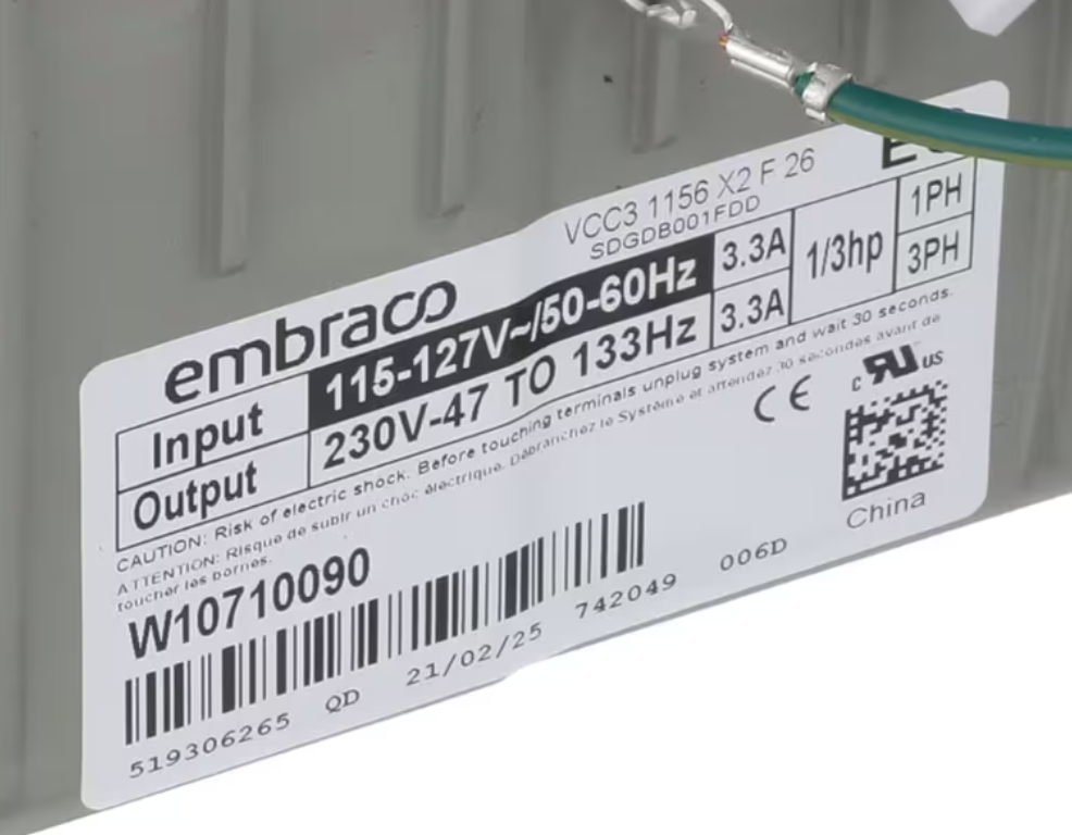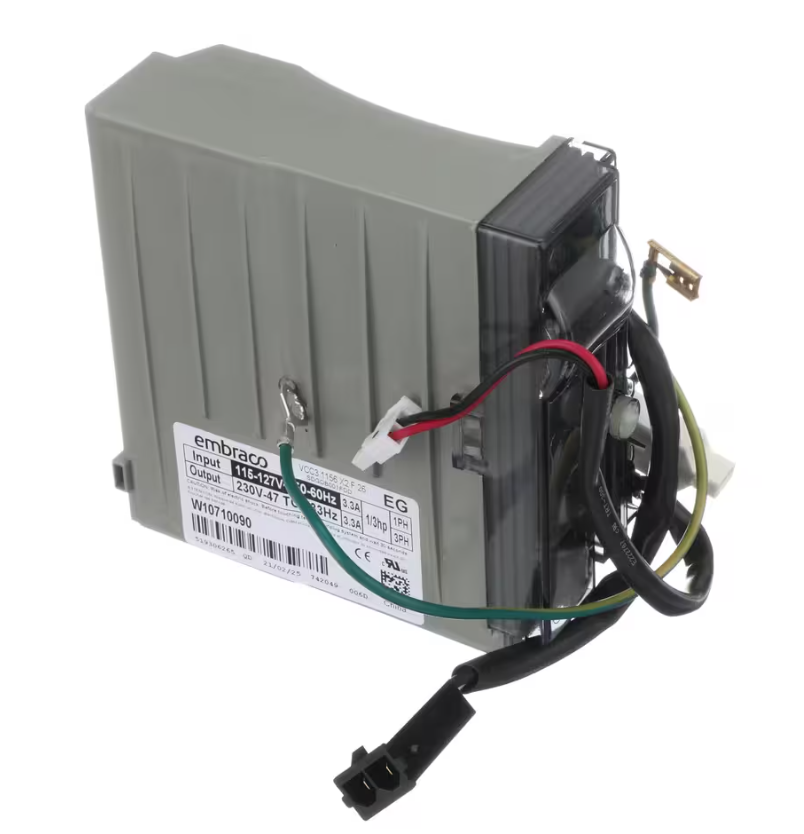 Restore the cooling performance of your refrigerator with the Whirlpool W10710090 Power Inverter (VCC3 1156 X2 F 26 / SDGDB001FDD). This power inverter module converts standard 115?127V AC input to high-efficiency 230V AC output, powering variable-speed compressors used in modern refrigerators. A faulty inverter can cause cooling failures, unusual compressor operation, or complete non-functionality. This replacement ensures quiet, energy-efficient, and consistent operation.
