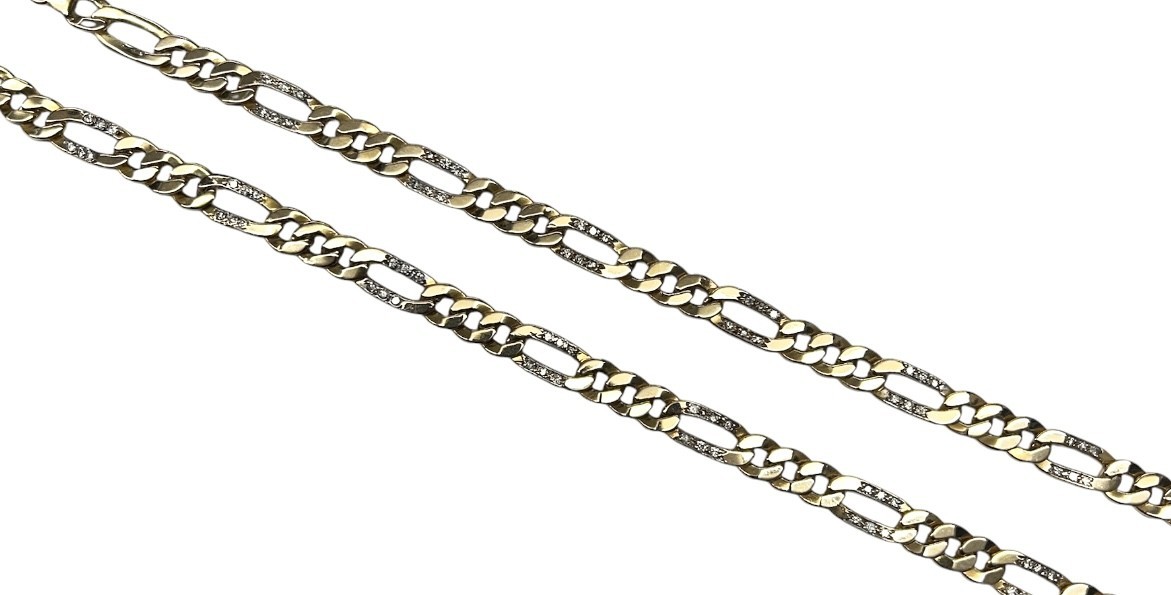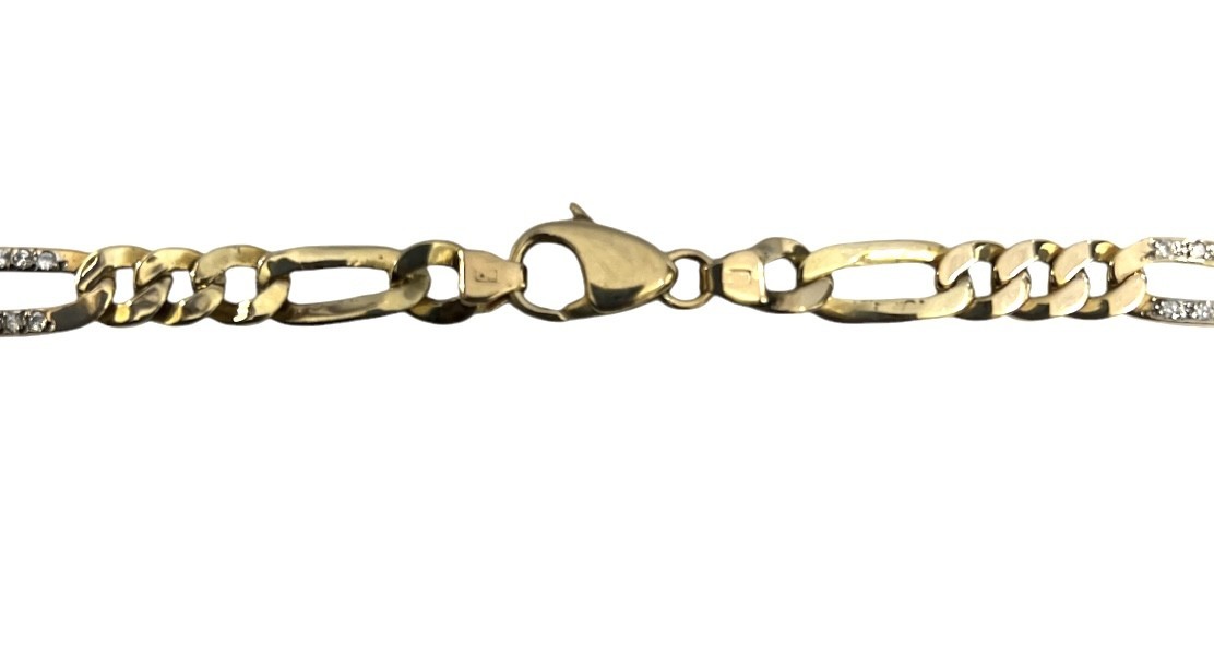 Type: ChainWeight: 23.3Karat: 14ktMetal: Yellow GoldGender: UnisexStyle: FigaroSize / Length: 18"Owner applied: 14k ITALYStone 1 quantity: 90Stone 1 shape: RoundStone 1 color: ClearStone 1 weight (total): 1Width: 7mmStone 1 type: DiamondCondition:Used