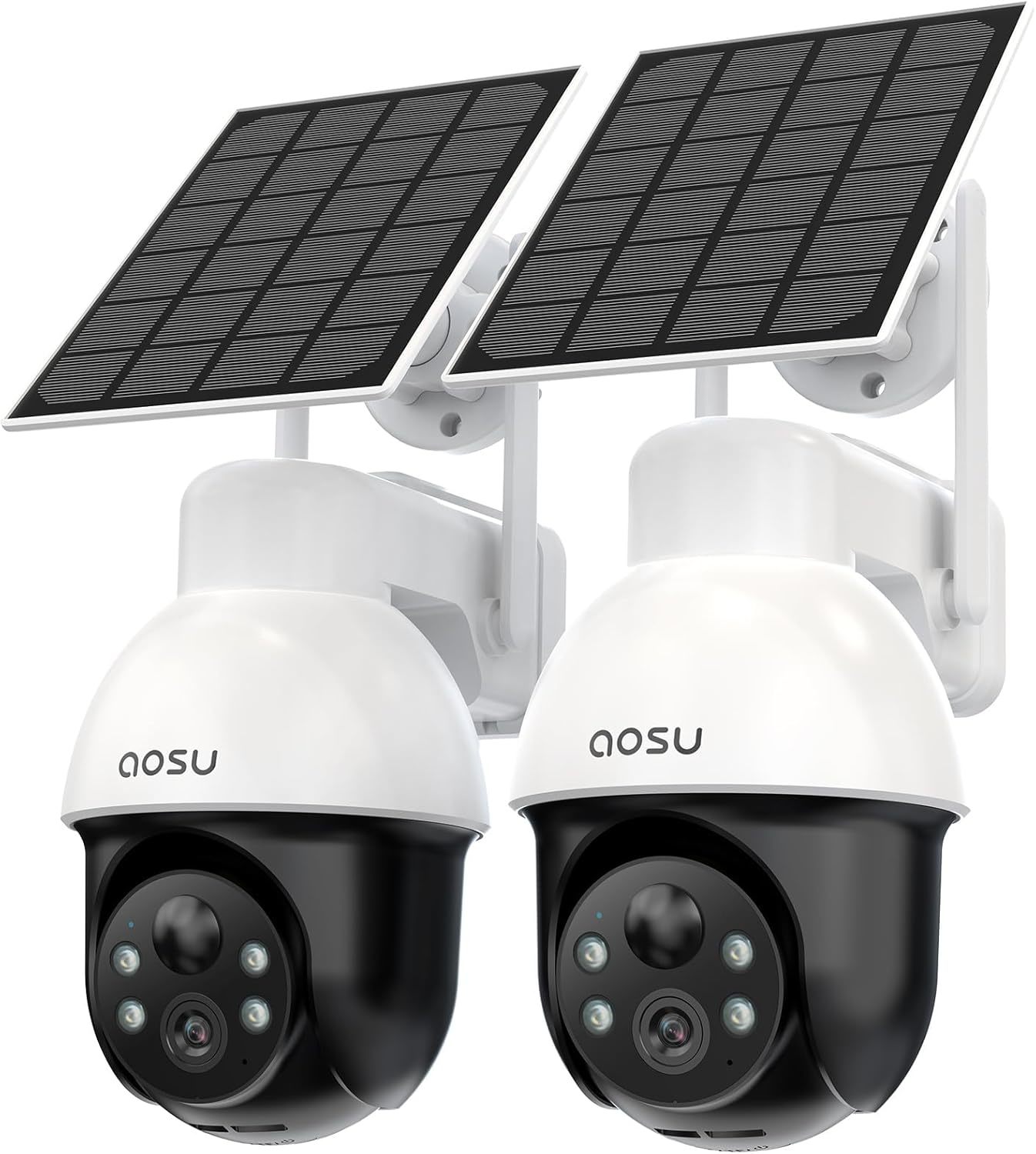 AOSU 3K/5MP Solar Security Cameras System Wireless Outdoor, Battery Powered WiFi Camera for Home Security, Panoramic PTZ, Auto Tracking, Human/Vehicle Detection, Color Night Vision (2 Pack)