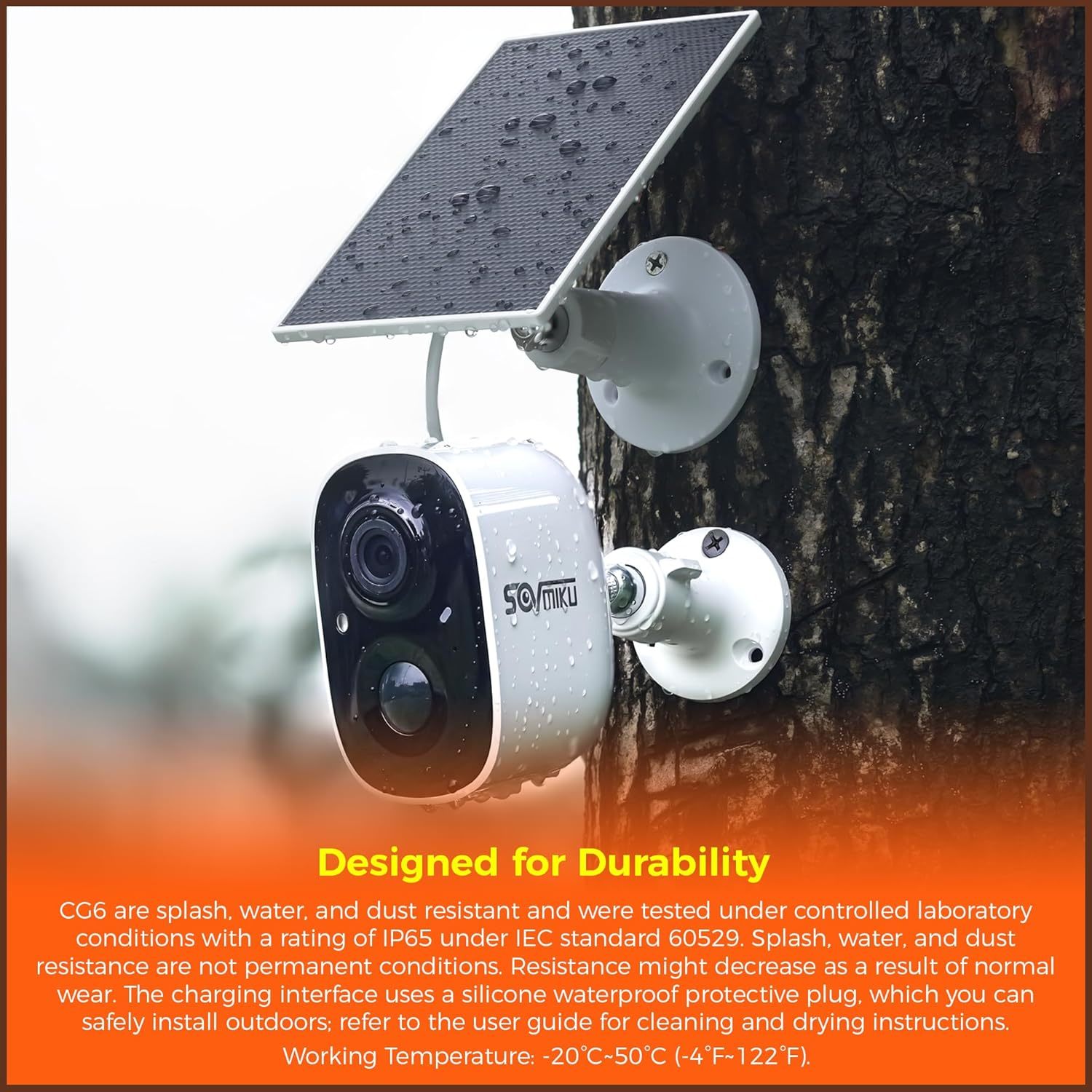 %, , : Monocrystalline silicon solar panels with an energy conversion rate of up to 23%, Built-in high-capacity 5200mah batteries, A complete charge can make the camera work for two months or more, High quality battery and less charging times enable the camera to be used for more than 8 years. , - : The advanced quad-pixel sensor on the Main camera makes the most of 3 megapixels by adapting to what you?re shooting, Shooting in 3MP delivers 4x the resolution for jaw-dropping cropping. : CG6 are splash, water, and dust resistant and were tested under controlled laboratory conditions with a rating of IP65 under IEC standard 60529. Splash, water, and dust resistance are not permanent conditions. Resistance might decrease as a result of normal wear. The charging interface uses a silicone waterproof protective plug, which you can safely install outdoors; refer to the user guide for cleaning and drying instructions. ?Always-On detection, Audible Flashlight Alarm?With CG6 camera, the Passive Infrared Sensor is always on,When a warm body like a human or animal passes by,It will first trigger the PIR sensor, and then the PIR will activate the camera in a period of more than 10 milliseconds. If it is at night, it will also activate spotlight. If the Alarm Flash feature and Alarm Siren is on, device will automatically flash and sound an alert when the motion sensor is triggered. : Sovmiku grow up with you, We invest a lot of personnel and time in the pre-sales, in-sales and after-sales process. You can contact us by telephone and email. If we miss your call, please email us. We promise to reply to you within 12 hours. This is an important way for us to collect customer suggestions. We also offer new cameras and extra cameras as gifts for these suggestions. We always endeavor to assist our customer with the best of our service?