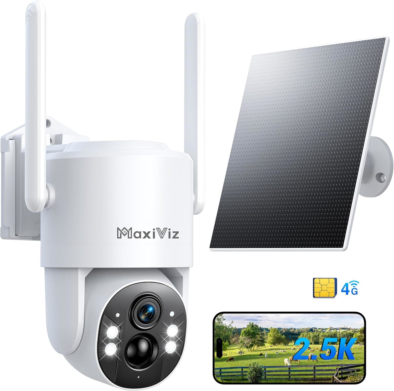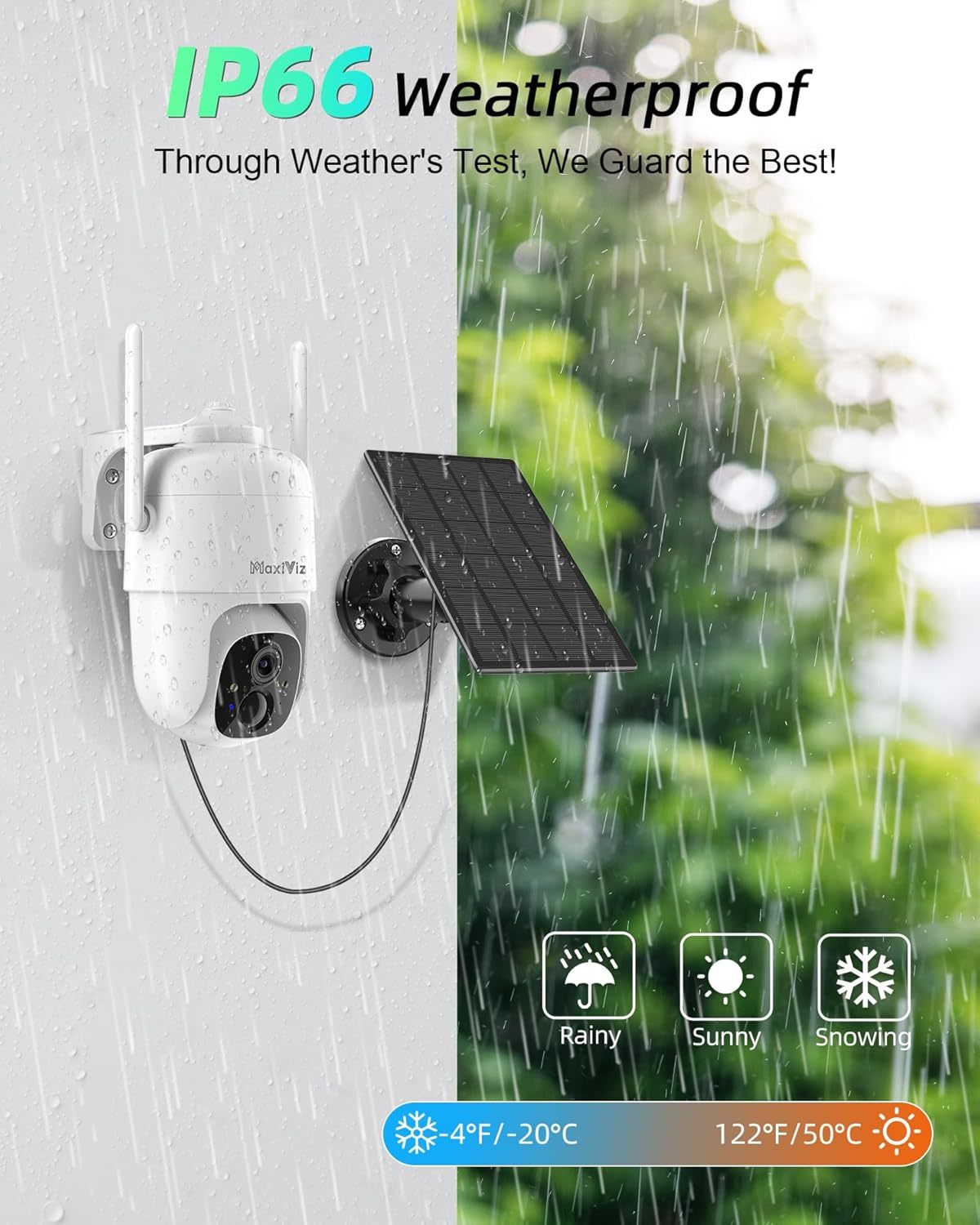 Compatible Devices: Smartphone Power Source: Solar Powered Connectivity Protocol: Wi-Fi Controller Type: Smartphone Mounting Type: Wall Mount Video Capture Resolution: 2K Color: White-2K Number of Items: 1 Included Components: Solar Security Camera with Solar Panel x 1, Bracket for camera Bracket for solar panel x 1, Mounting Kit x 1, Power Cable x 1, User Manual x 1 Number of Channels: 2 Wireless Communication Technology: Wi-Fi Form Factor: Bullet Night Vision Range: 33 Feet Material: Acrylonitrile Butadiene Styrene (ABS) Wattage: 6 watts Item dimensions L x W x H: 8 x 6.2 x 5.3 inches Batteries Required?: Yes Optical Zoom: 4 x Focus Type: Auto Focus Low light technology: Night Color Alert Type: Audio and Motion Room Type: Garden, Frontdoor, Garage, Hallway Video Capture Format: MP4 Specific Uses For Product: Outside; Professional Unit Count: 1.0 Count International Protection Rating: IP66 Product Dimensions: 8 x 6.2 x 5.3 inches Item Weight: 2.42 pounds Item model number: CQ1 Batteries: 1 Lithium Polymer batteries required. (included) Manufacturer: MaxiVIz Recommended Uses For Product: Outdoor Security Brand: MaxiViz Connectivity Technology: Wireless Special Feature: Color Night Vision, 365 Day Non-Stop Powered, 360 PTZ Technology, IP66 Weatherproof, 2K HD Resolution Color Night Vision, 365 Day Non-Stop Powered, 360 PTZ Technology, IP66 Weatherproof, 2K HD ResolutionColor Night Vision, 365 Day Non-Stop Powered, 360 PTZ Technology, IP66 Weatherproof, 2K HD Resolution See more Indoor/Outdoor Usage: Outdoor