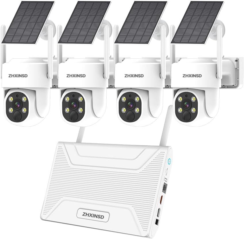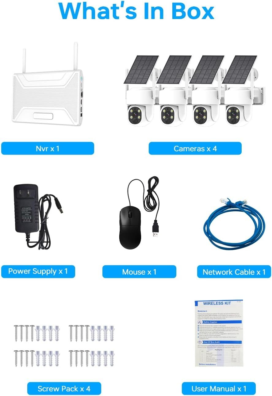 (Get 355 Wide Vision Wire-Free Security): Elevate your security with our Solar-Powered Outdoor Wireless Camera. Effortless setup,with no wires needed. crystal-clear day and night views, and 355 panoramic horizontal and 140 vertical coverage make it perfect for safeguarding your home, office, or garage. (4MP UHD Two-Way Audio): Get four 4MP/2.5K outdoor security cameras solar powered with the option to add up to 10 more, ensuring top-notch HD quality for detailed monitoring. Greet visitors directly from your phone using built-in microphones and speakers on all cameras. Stay connected effortlessly (Enhanced PIR Motion Detection Color Night Vision): Our CCTV camera system features PIR detection sensors for intelligent mobile tracking. When motion is detected, it automatically follows moving objects and sends instant alerts to your phone. Each camera is equipped with built-in floodlights, activating color night vision recordings upon motion detection. (Remote Access No Monthly Fees): Enjoy remote viewing anytime, anywhere with our solar PTZ camera system. Compatible with PC and phone devices, it supports multiple users viewing simultaneously, and you can easily share access with family and friends. Say goodbye to monthly fees - this system comes with a preinstalled 64GB TF card for recording, allowing you to view motion recordings on your smart device.