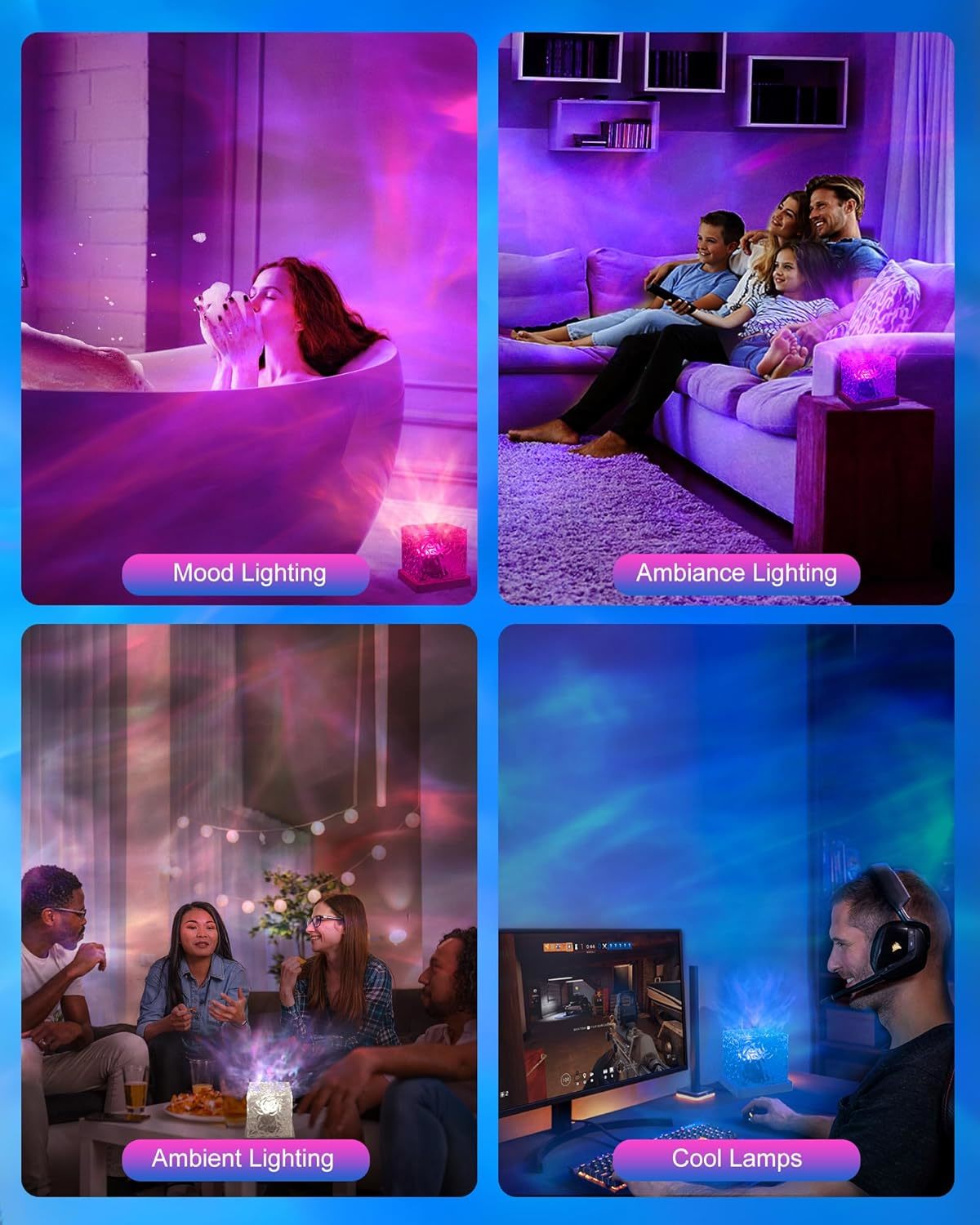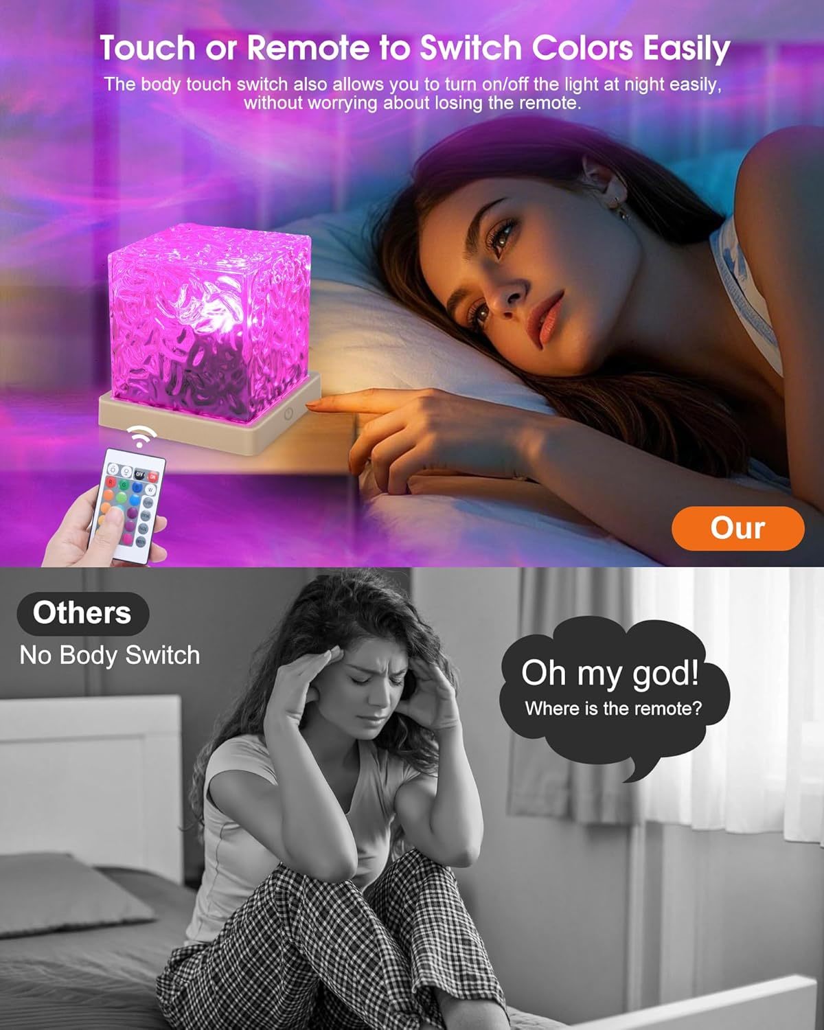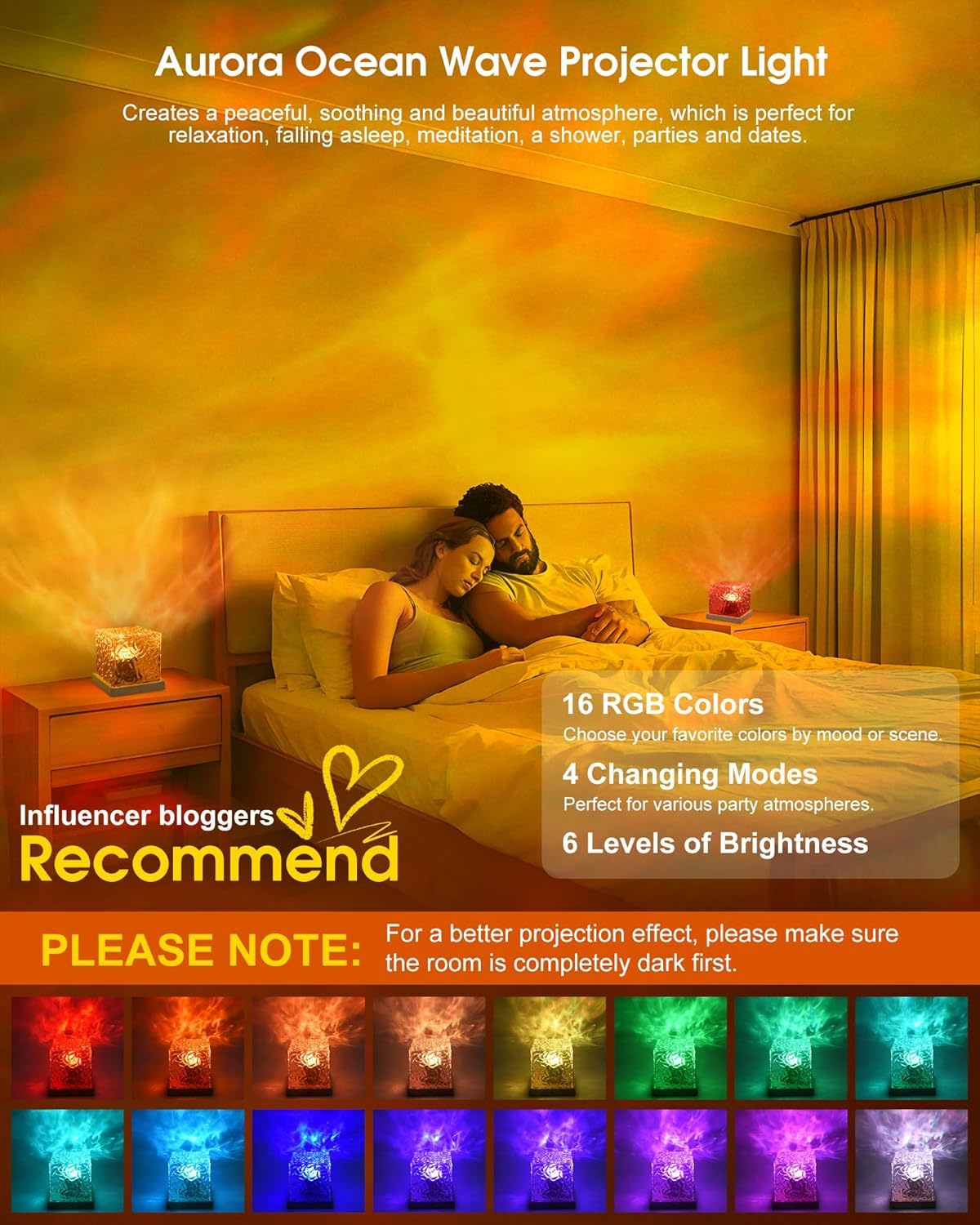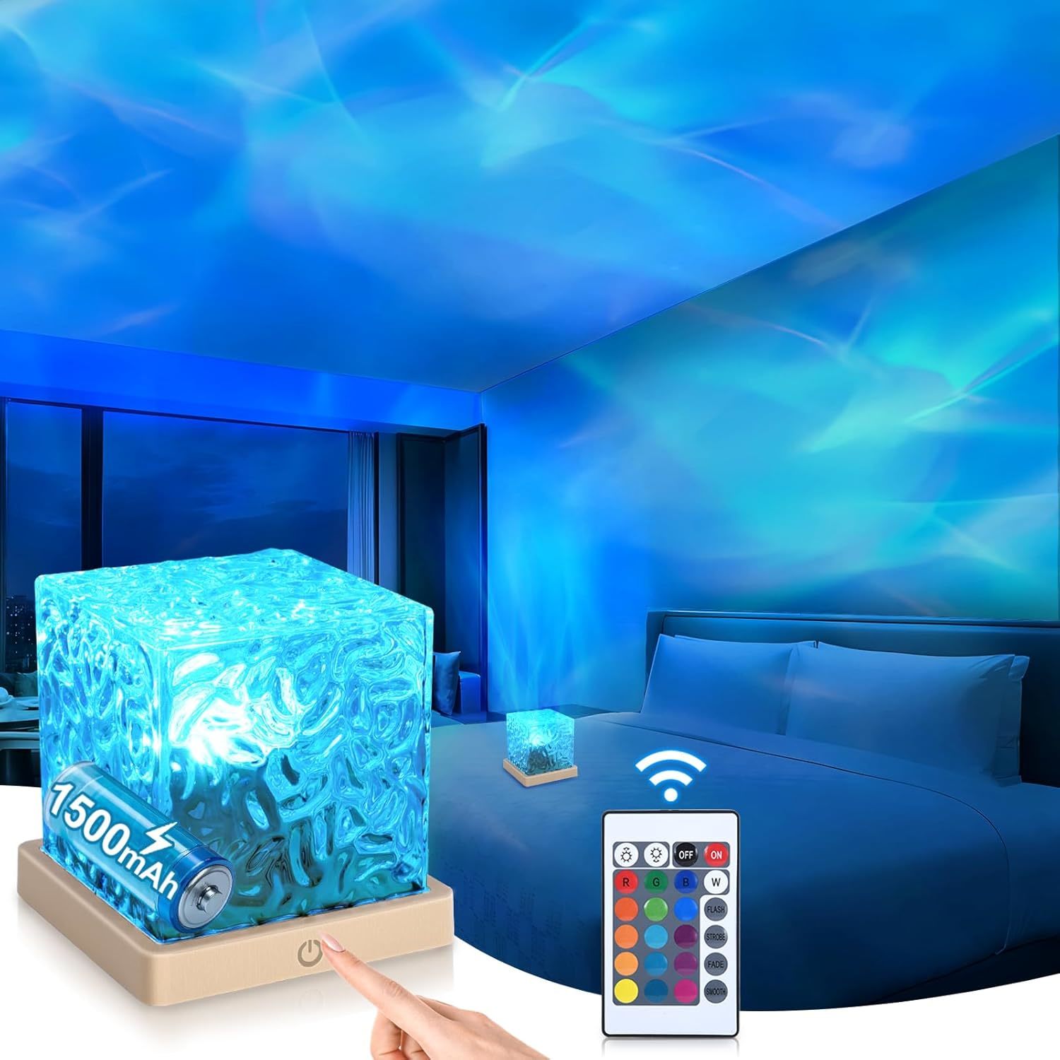 ?16 RGB Colors, 6 Brightness Levels 4 Modes?- Our ocean lamp, with its gentle water wave projections and a variety of colors, creates a peaceful, soothing, and beautiful atmosphere. You can choose your preferred colors to match your mood. It's ideal for relaxation, sleep, meditation, shower, listening to music, parties, dates, etc. and perfect for mood lighting, ambient lighting, and room decor in bedrooms, kids' rooms, living rooms, bathrooms, game rooms, studios, etc. It fits various themes ?Cordless Rechargeable?- Our ocean wave projector light features a built-in 1500mAh rechargeable lithium battery that lasts for 4-6 hours when fully charged. With its wireless design, it's easy to place anywhere. You can place the kids night light in the center of the bedroom, allowing the light to project onto the ceiling, then enjoy a sweet dream under the blue ocean waves or the gorgeous Northern Lights ?Convenient Touch Remote Control?- The water ripple projector light allows you to easily adjust colors, brightness and changing modes via the remote control or adjust colors and modes through the body touch switch. The body switch also allows you to easily turn off the light before bed or turn it on at night, without worrying about losing the remote control ?Noise-Free Memory Function?- Our aura water lamp is newly upgraded with a high-quality silent motor, running almost silently without disturbing your rest. The LED cloud lights for ceiling also has a memory function, resuming the previous light settings upon restart. (Note: Resets to default when the battery is drained.) ?The Heartwarming Gift for Your Beloved Ones?- This northern lights projector luminorthe cube lamp is an ideal gift for occasions like birthdays, housewarmings, Valentine's Day, anniversaries and so on. It's also great for decorating girls' rooms, passing on the soothing and dreamy warmth to your children, family, lovers and friends ?Worry-Free Service Guarantees?- We prioritize your satisfaction and offer a 3-year quality guarantee for our aurora light projector. If you're not satisfied with your purchase or have any questions, please feel free to contact our customer service team. We'll make every effort to provide satisfactory solutions and reply within 24 hours