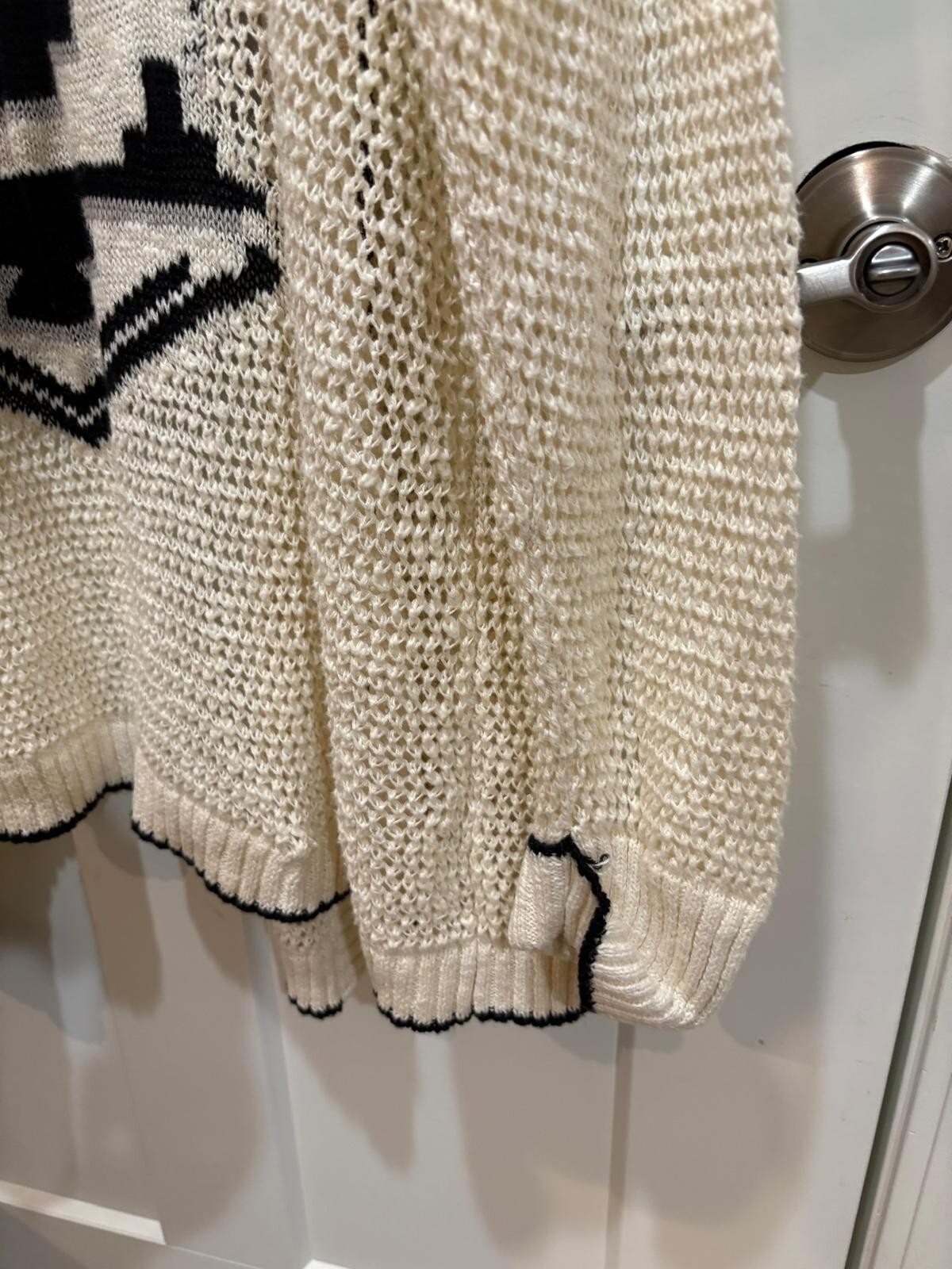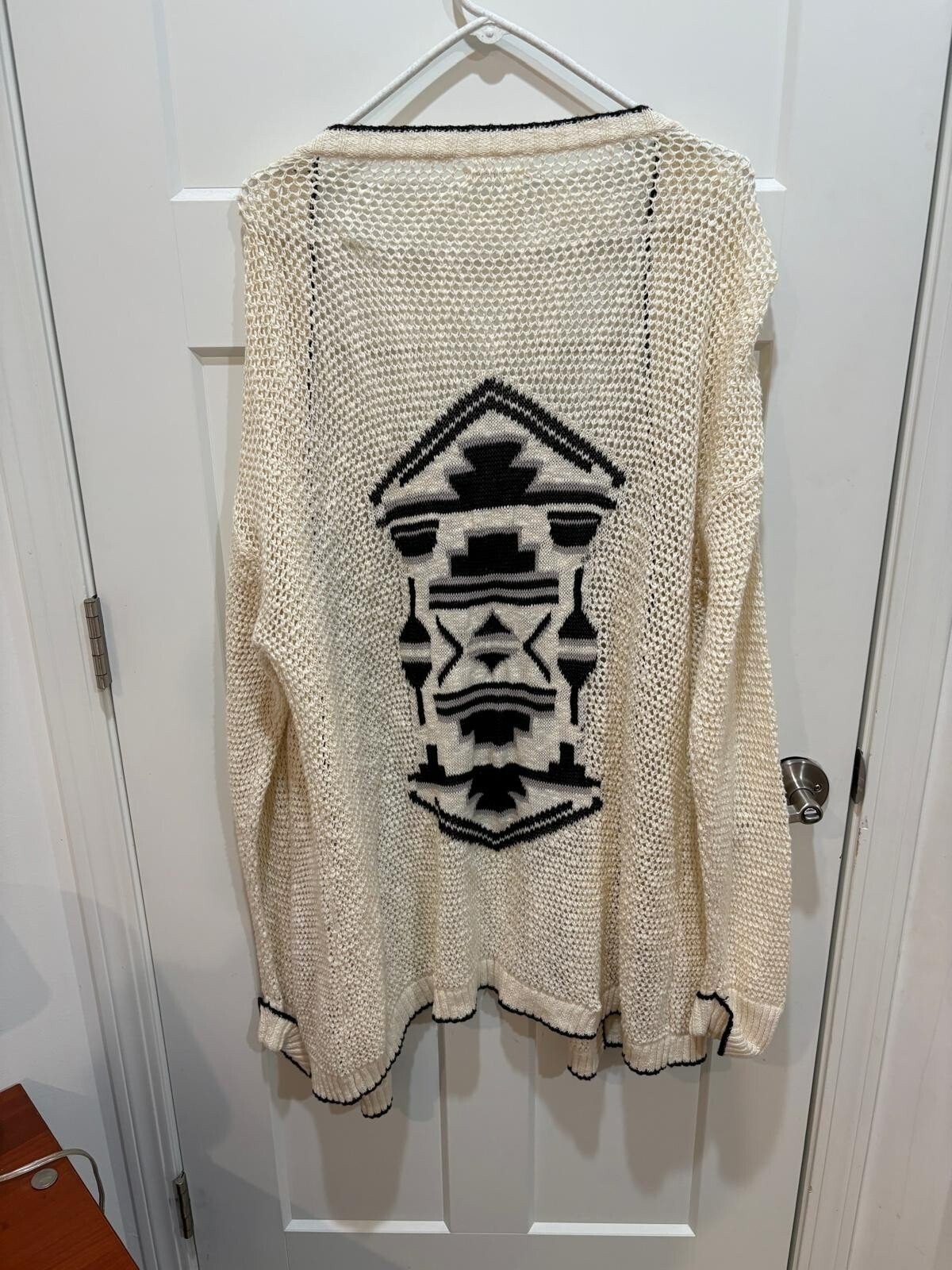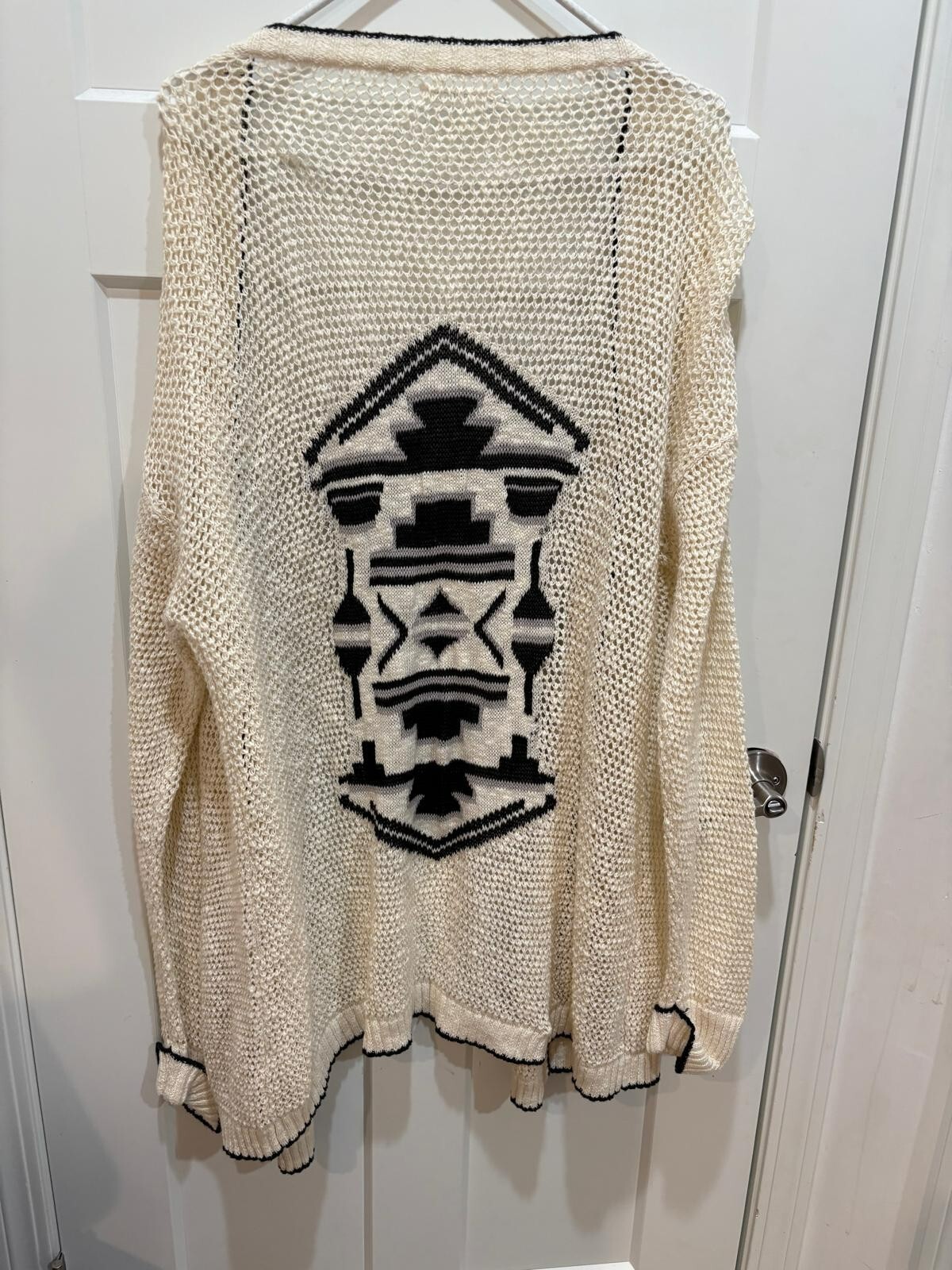 Add a bold and cozy layer to your wardrobe with this Maunces Open Knit Cardigan Sweater in women?s size 3. Designed with a soft cream base, contrasting black trim, and a stunning Aztec-inspired back design, this stylish cardigan is perfect for transitional weather, layering, or making a statement with your outfit.