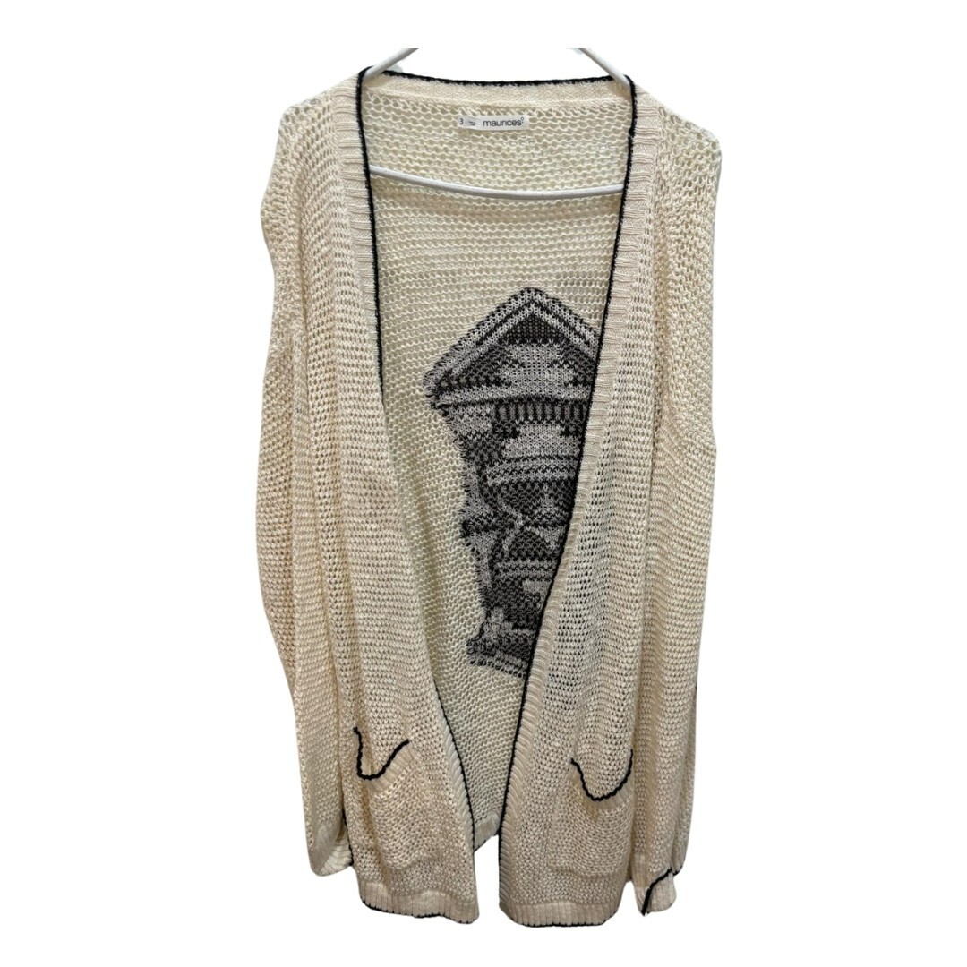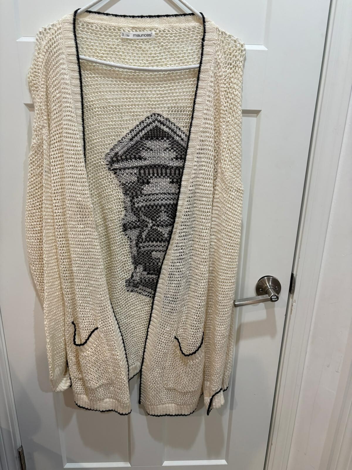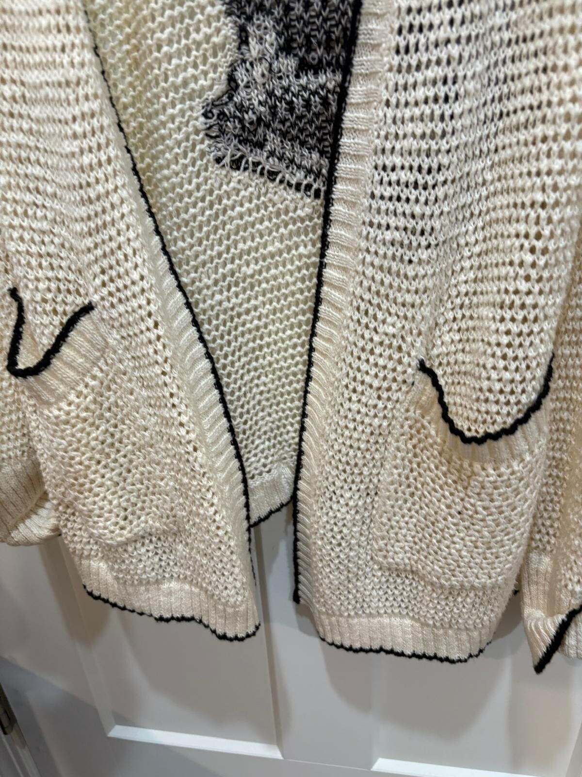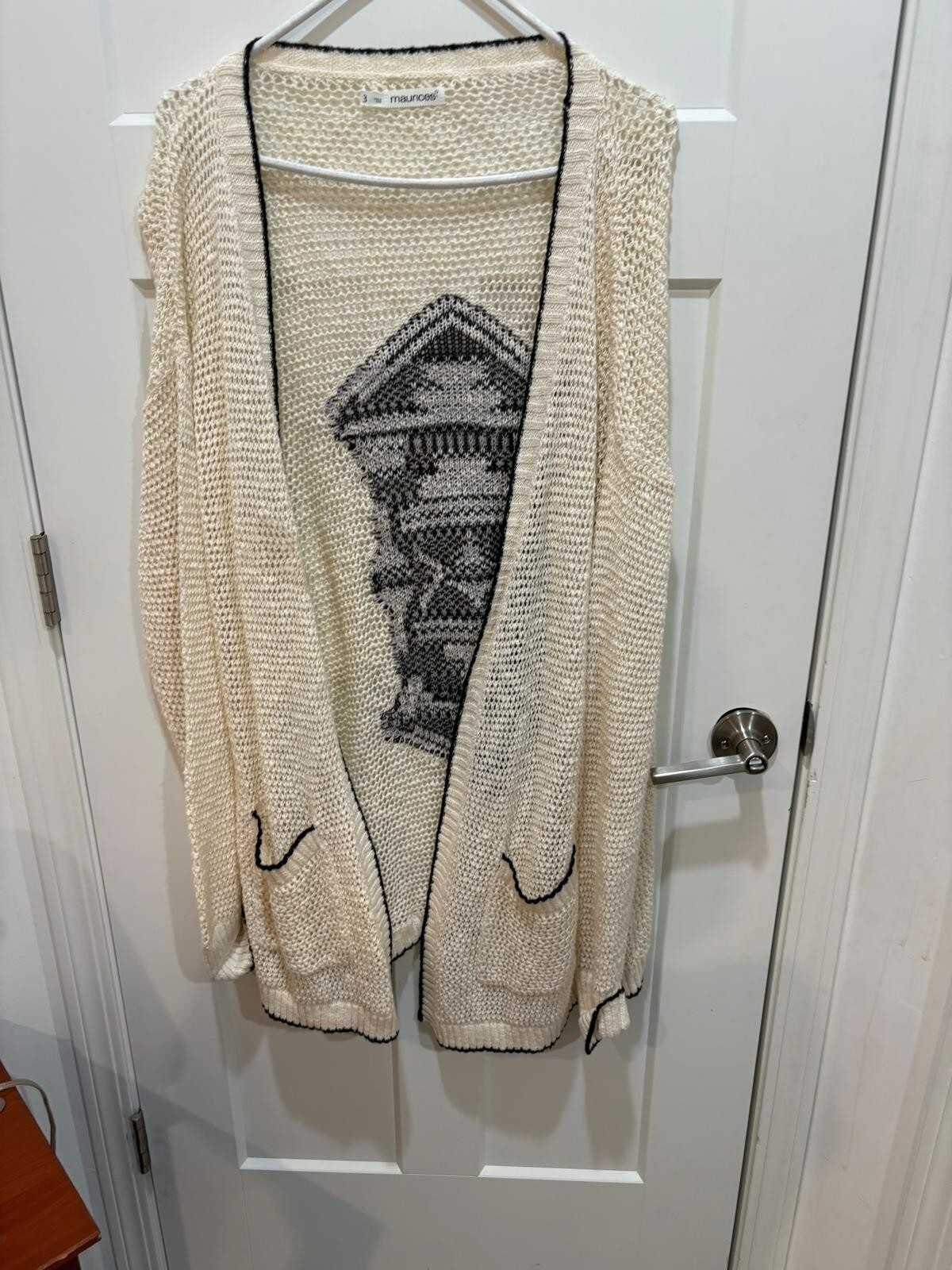 Add a bold and cozy layer to your wardrobe with this Maunces Open Knit Cardigan Sweater in women?s size 3. Designed with a soft cream base, contrasting black trim, and a stunning Aztec-inspired back design, this stylish cardigan is perfect for transitional weather, layering, or making a statement with your outfit.