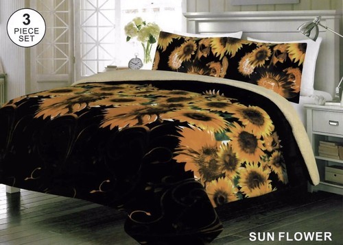 SUNFLOWERS DARK BROWN BLANKET WITH SHERPA VERY SOFTY THICK & WARM 3 PCS QUEEN