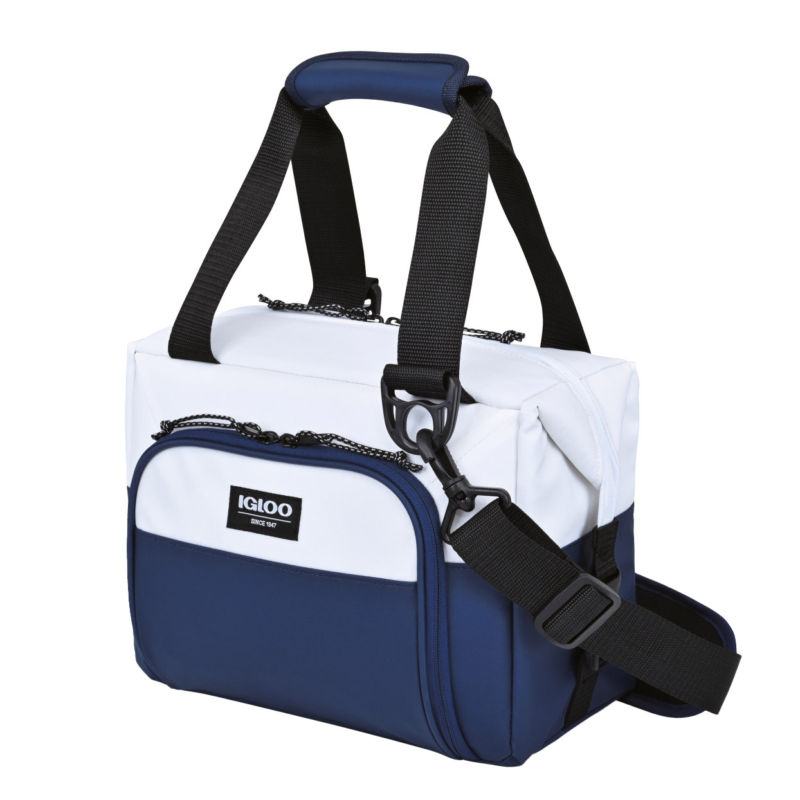 Features include a leak-resistant antimicrobial liner, 36-can capacity, wide doctor bag style opening for easy packing and side buckles to secure, dual carry handles with an adjustable shoulder strap, front storage pocket, and is PVC and Phthalate free.