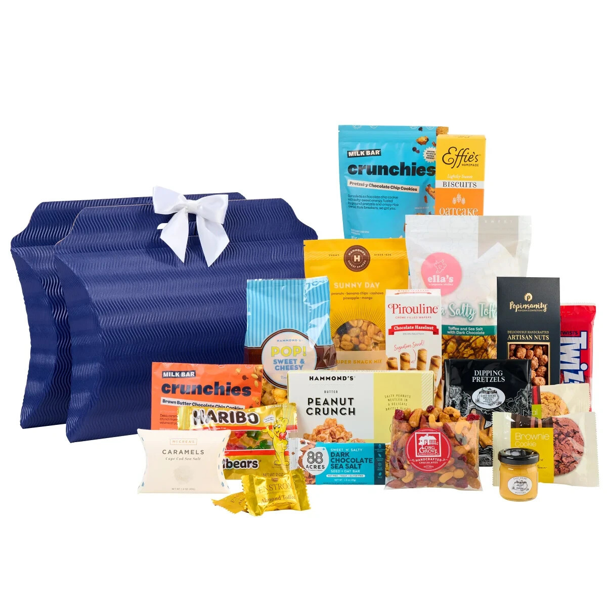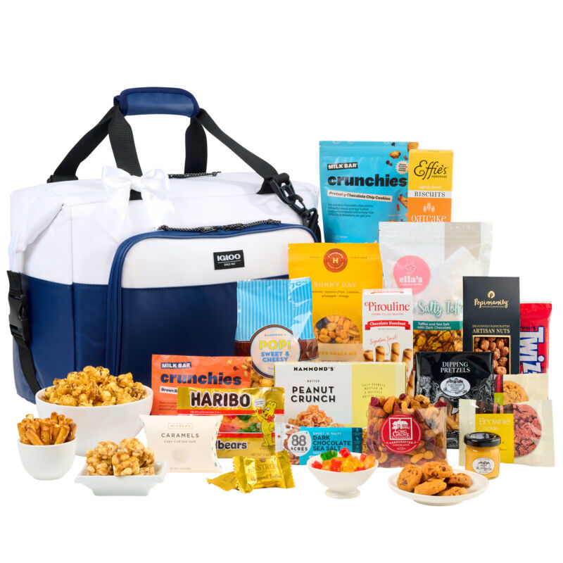 Includes: 1 (1.4 oz) McCrea?s Cape Cod Sea Salt Caramels 1 ( 2.5 oz.) Taza Dark Chocolate Cornflake Crunch Bar 1 (1.0 oz) J M Brownie Cookie 1 (1.0 oz) J M Cranberry Oatmeal Cookie 1 (4.5 oz) Ella?s Atelier Sea Salty Toffee Popcorn 1 (3.0 oz) Long Grove Confectionary Berry Nut Mix 1 (2.0 oz) East Shore Specialty Foods Dipping Pretzels 1 (1.4 oz) East Shore Specialty Foods Sweet and Tangy Mustard 1 (1.5 oz) Milk Bar Brown Butter Chocolate Chip Cookies 2 (0.55 oz) Enstrom Milk Chocolate Almond Toffee 1 (5.0 oz) Hammond?s Pop! Sweet Cheesy Caramel Corn Sharp Cheddar 1 (7.5 oz) Hammond?s Sunny Day Super Snack Mix 1 (3.0 oz) Hammond?s Peanut Crunch 1 (6.5 oz) Milk Bar Chocolate Chip Pretzel-y Cookies 1 (3.5 oz) Pirouline Creme Filled Chocolate Hazelnut Wafers 1 (7.2 oz) Effie?s Homemade Oatcake Biscuits 1 (1.6 oz) 88 Acres Dark Chocolate Sea Salt Seed + Oat Bar 1 (2.5 oz) Twizzlers Strawberry Licorice 1 (2.0 oz) Haribo Gold Bears Gummy Candy Food Net Weight 3.6 lbs All Food is Made in USA White Satin Bows included. 2 Navy Eco Paper Totes Dimensions: 15?L x 12?H x 3.5?W 1 Igloo Cooler Dimensions: 17?L x 12?H x 8.5?W *Bowls Plates are not included. Eco totes are for gift pack only, not a cooler accessory.