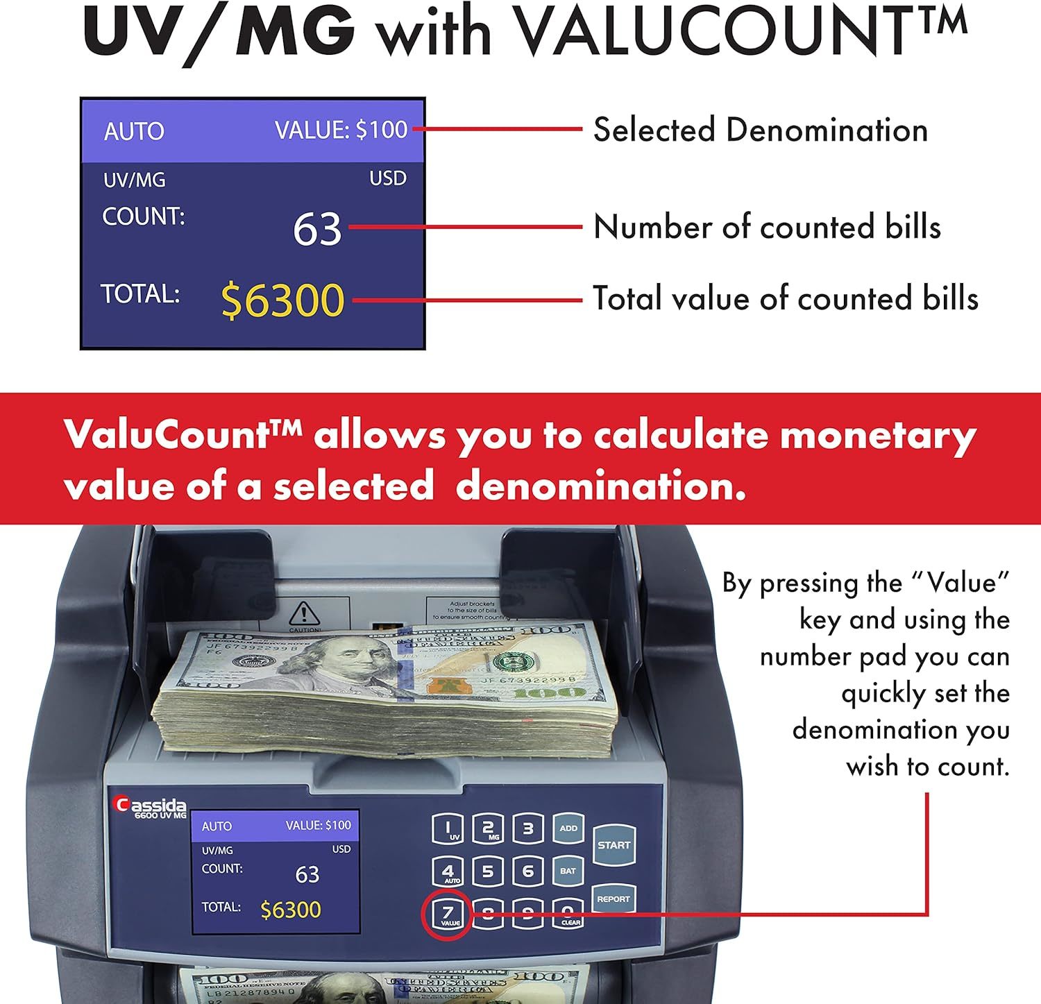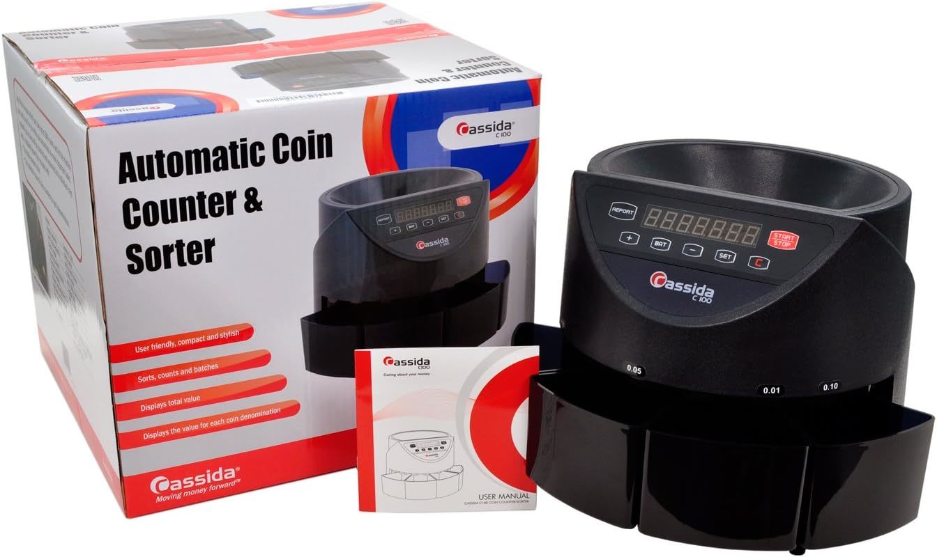 Cassida C100 Electronic Coin Sorter/Counter, Countable coins 1, 5, 10, 25, 250 coins/min, 110 VACA convenient and affordable coin counter, the Cassida C100 is the lowest cost business-grade coin counter/sorter from America's #1 Manufacturer in Cash Handling. The medium-duty C100 counts the main four US Coins: Pennies, Nickels, Dimes, and Quarters. The Cassida C100 has a counting speed of 250 coins per minute, and the hopper holds 900 dimes. All Cassida products come standard with a 1-year parts and service executed by our Portland Oregon service team. The Cassida C100 also comes standard with a 30 day defective policy: If there are manufacturer defects with the C100 within 30 days of purchase, Cassida will ship a replacement at zero cost to you, and a prepaid label will be provided to you to return. Buy with confidence, buy Cassida.Cassida 6600 UV/MG ? USA Business Grade Money Counter with UV/MG/IR Counterfeit Detection ? Top Loading Bill Counting Machine w/ ValuCount?, Add and Batch Modes ? Fast Counting Speed 1,400 Notes/MinA feature-packed high-speed currency counter, the Cassida 6600 is a professional money counter machine designed to tackle a wide variety of counting jobs. Fast, accurate, and equipped with a host of smart features, it is a reliable all around performer. Cassida specializes in business-grade cash counting machines, and the 6600 is no exception as a currency counting machine you can rely on for all your professional money handling needs. The feature calculates the dollar value of a denomination, as selected by the user. By activating in the add mode, users can count different denominations while keeping track of the total value. The 6600 has add, count, batch, and add + batch modes, making it the perfect choice when all around performance is a requirement. When detected by its infrared sensors, half, double and chain notes will stop the count, alert the user with beep, and display the error type on its screen. The counterfeit detection sensors are able to detect a wide range of counterfeit bills. Once a counterfeit is detected, the 6600 stops the count and dispenses the suspect bill into its stacker for removal. Pressing the start button continues the count and automatically deducts the counterfeit from the overall total. An intelligent bill density recognition system eliminates time-consuming stops common in conventional bill counters. An innovative mechanism combines the smooth counting of a back loading machine with the convenient hopper of a front loader. A built in handle makes transporting the unit easy. If you count cash for your business, or are a discriminating consumer looking for durability, reliability, and features to make your currency counting experience effortless, look no further than Cassida 6600 series bill counters.