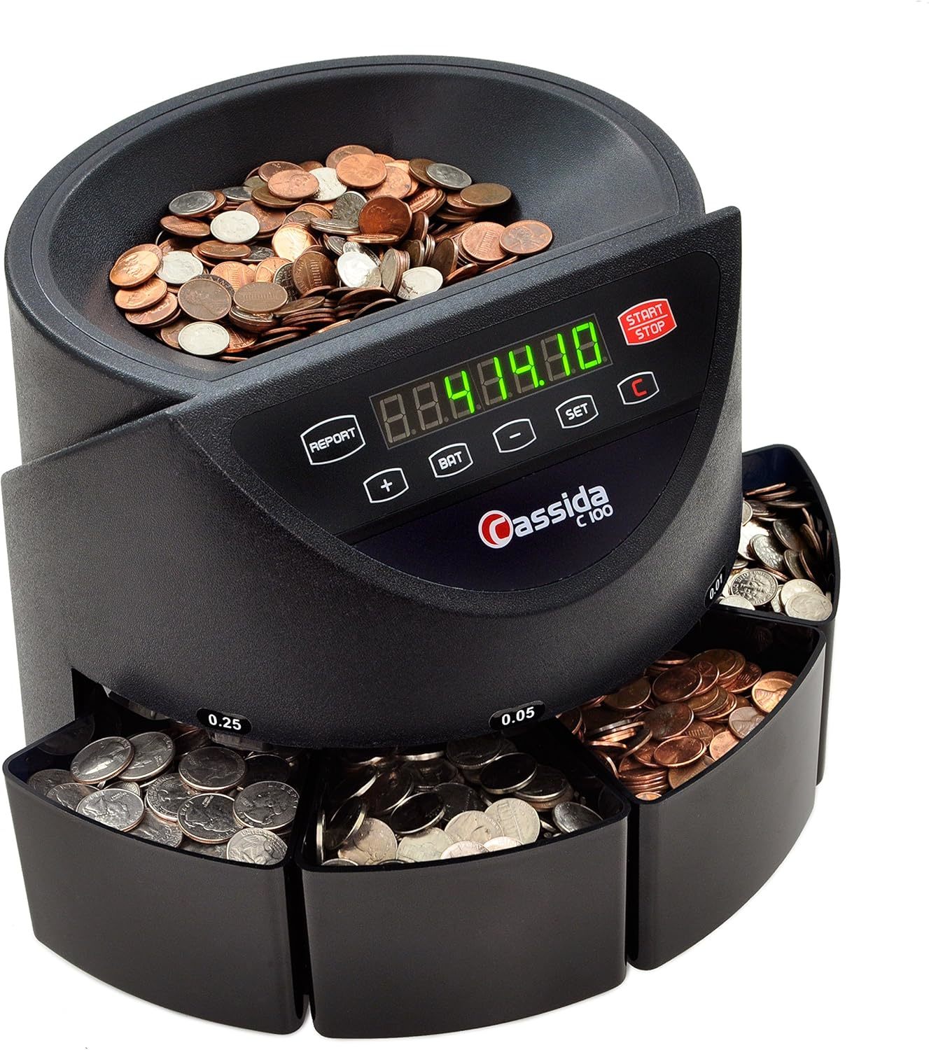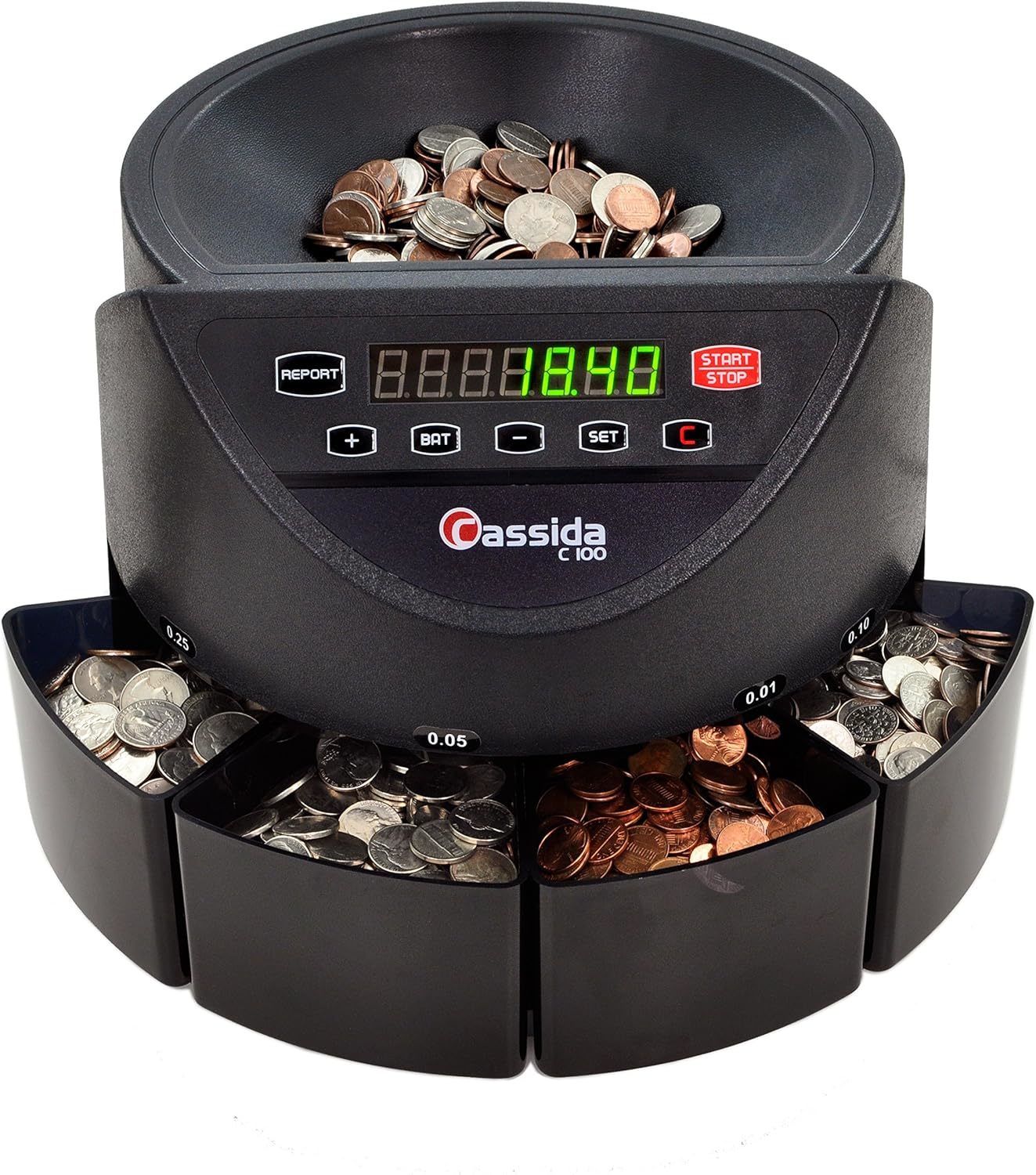Cassida C100 Electronic Coin Sorter/Counter, Countable coins 1, 5, 10, 25, 250 coins/min, 110 VAC 6600 UV/MG ? USA Business Grade Money Counter with UV/MG/IR Counterfeit Detection