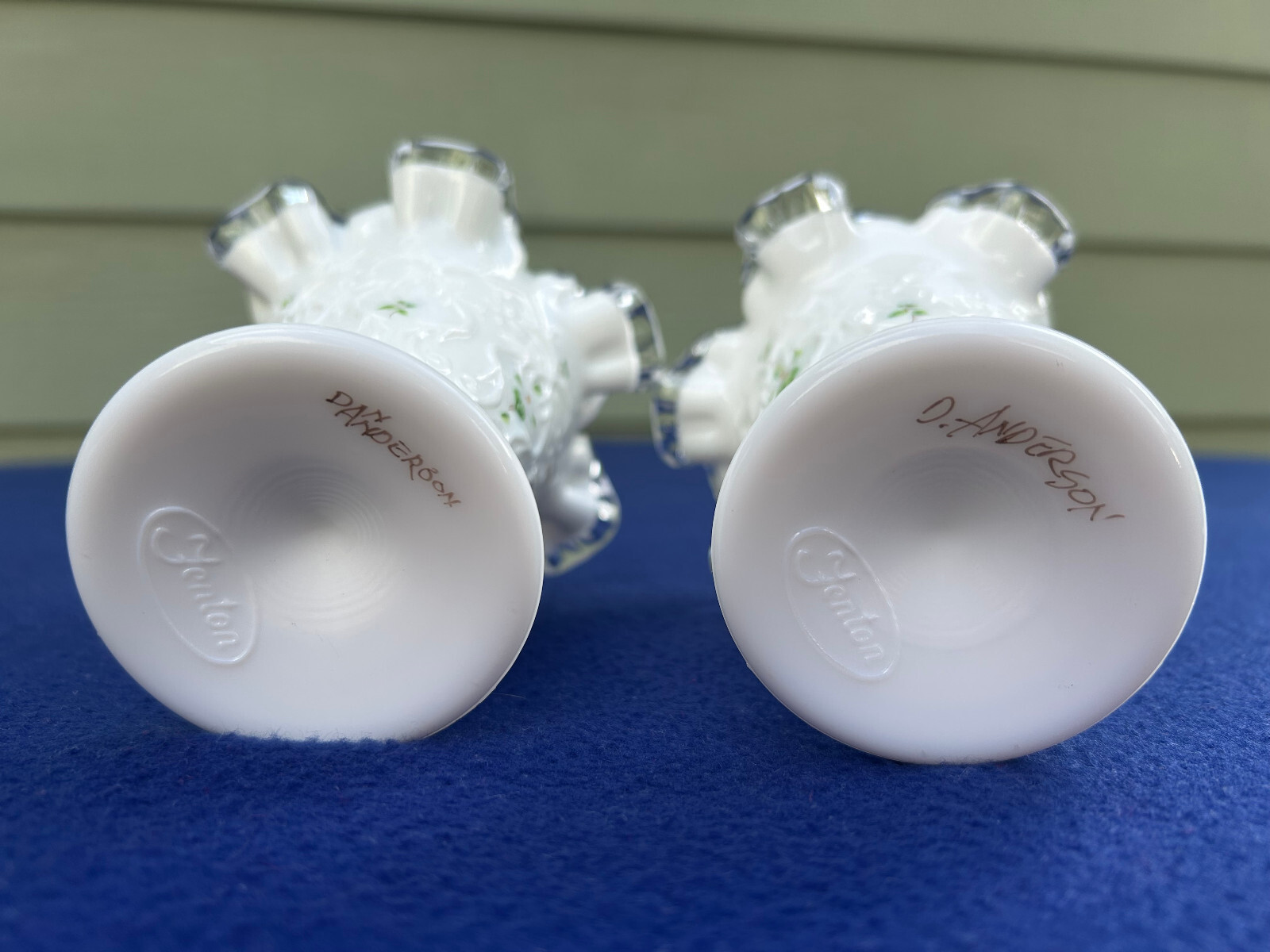 Two Fenton Art Glass ruffled vases signed by Dan Anderson, hand painted Violets in Snow on Spanish Lace mold, 4 1/4" x4" wide across the top, with the silver crest top, no damage at all.