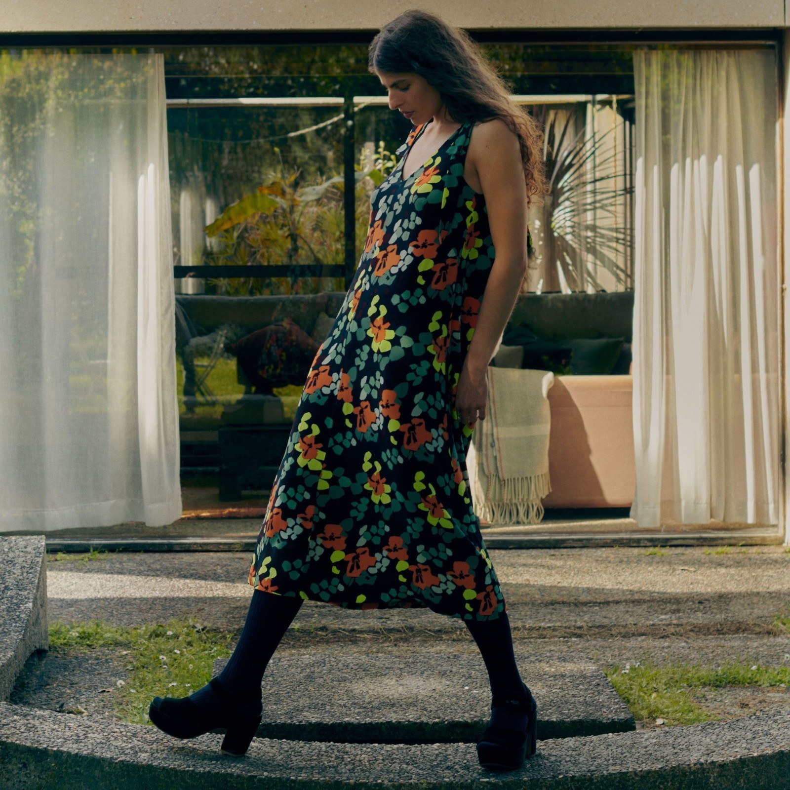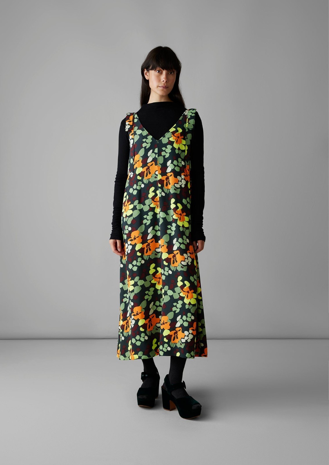 Description: Wide ties tumble down the shoulders of our dress for a romantic impression. Crafted from FSC-certified viscose illustrated by a floral pattern with a slender bodice, falling to a lower-calf length.
