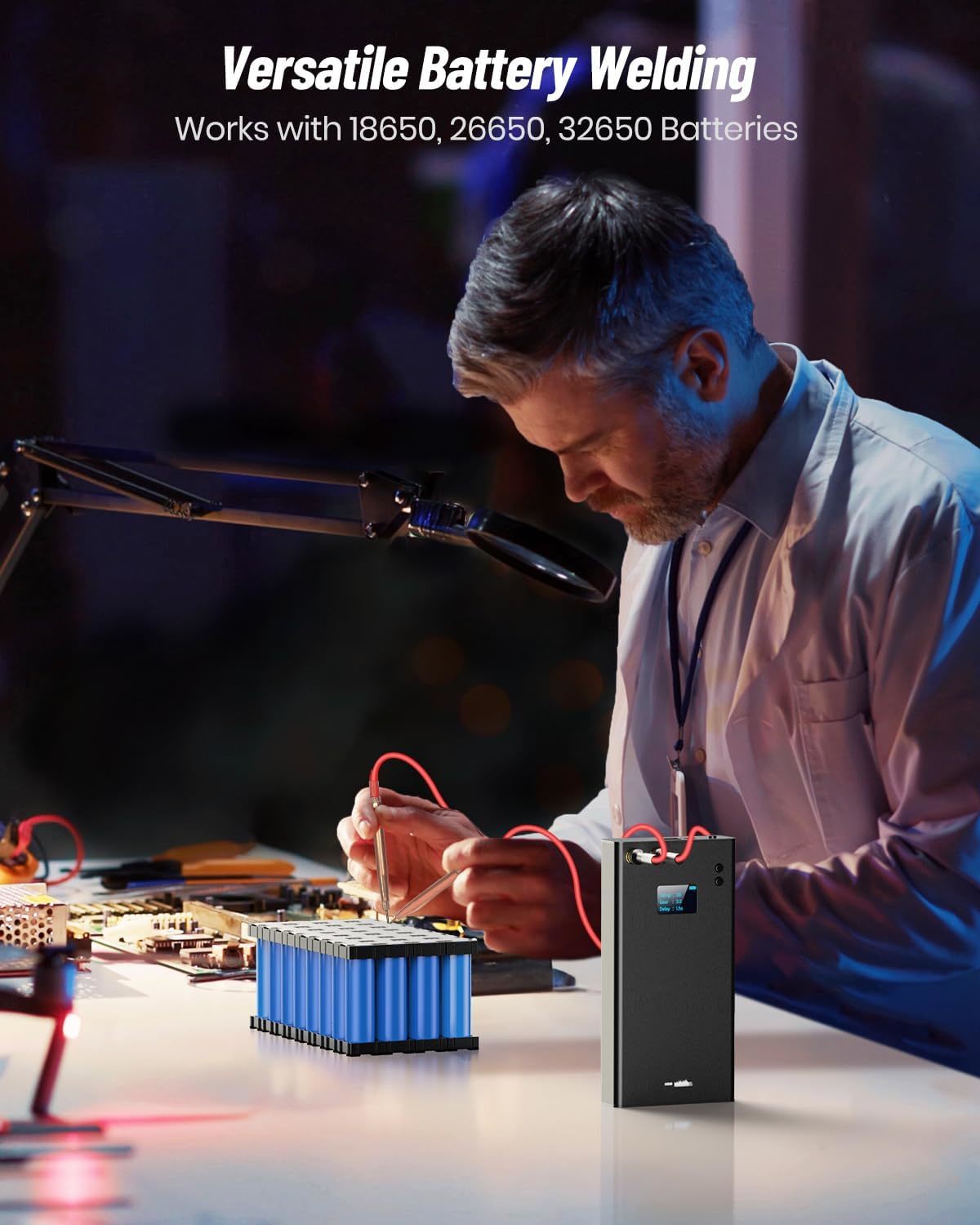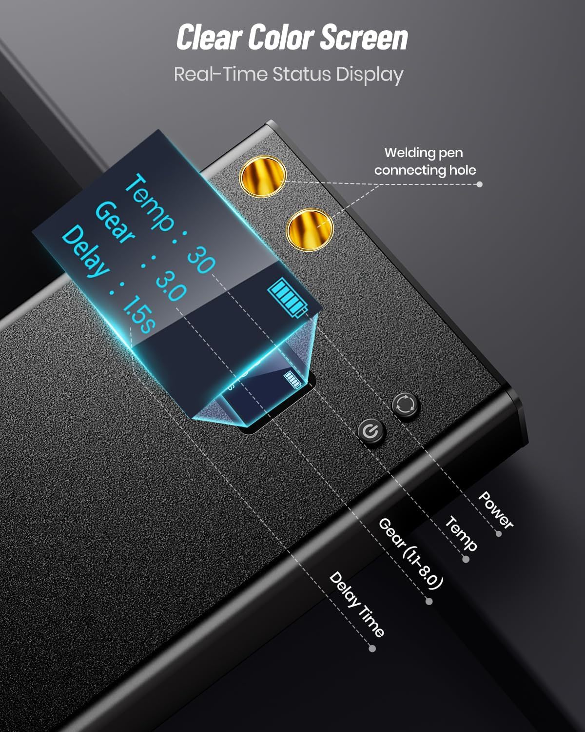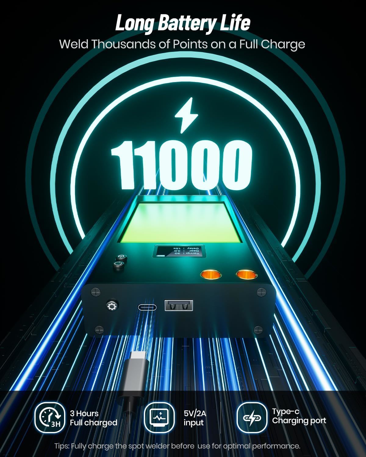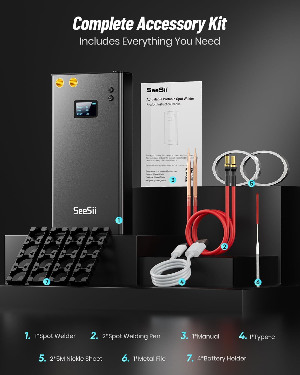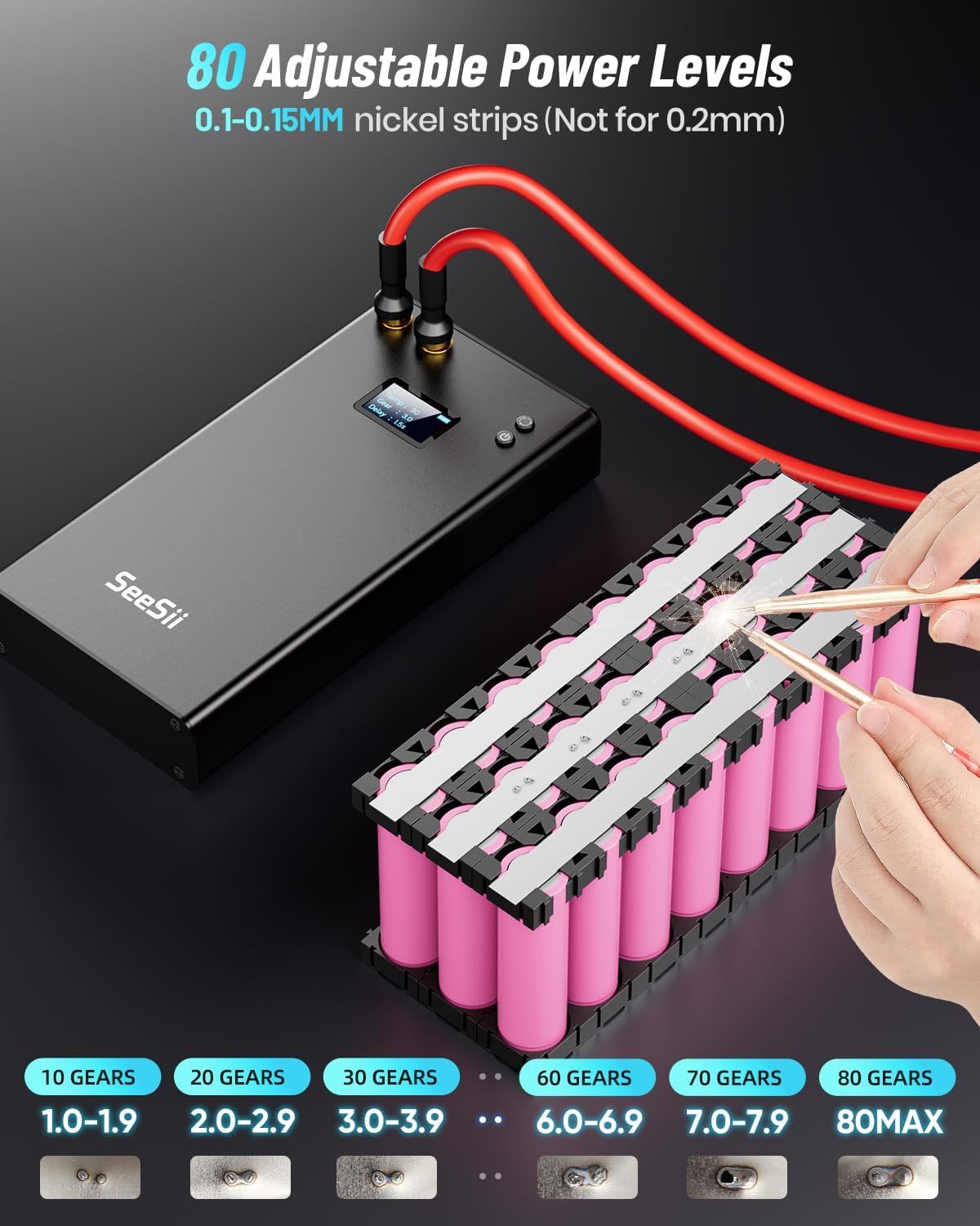 SE003 Upgraded Spot Welder: Features an 11000mAh battery and charging design; Fully charges in 3-5 hrs with Type-C cable; Welds thousands of points on a full charge; Uded for 0.1-0.15mm nickel sheets, ideal for battery packs (Note: Not for 0.2mm nickel strips) 80 Adjustable Power Levels: Seesii SE-002 mini battery spot welder with 80 adjustable power levels; Fine-tune between 1-8 and 1.1-5.4-8.0 levels for precise welding; Delay time can be adjusted from 1-5 seconds, making it useful for beginners LCD Visible Screen Display: Our spot welder for battery designed with a colorful LCD screen; Displays remaining battery, delay time, temperature, and gear level; Monitor working conditions at a glance for a safer, more efficient welding practice Intelligent and Safe: The 18650 spot welder kit features upgraded chip for convenient operation; The spot welder will automatically stops when temperature exceeds 60?/140F to prevent damage. Note: Practice several times to find the right welding strength Wide Application: The mini spot welder is mainly used in the welding of nickel sheets of battery, which can be used for spot-welding cylindrical lithium batteries such as 18650/21650 and etc, nickel-metal hydride /cadmium nickel batteries and etc