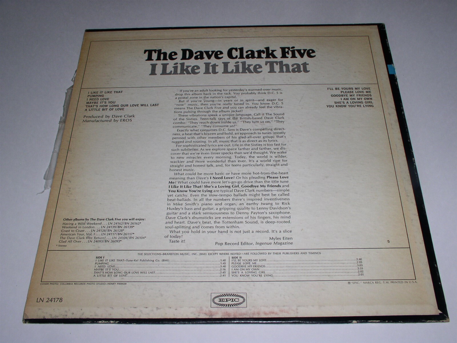 This is a vintage phonograph record album by The Dave Clark Five, entitled, "I Like It Like That". Record label Epic LN 24178 (Mono).