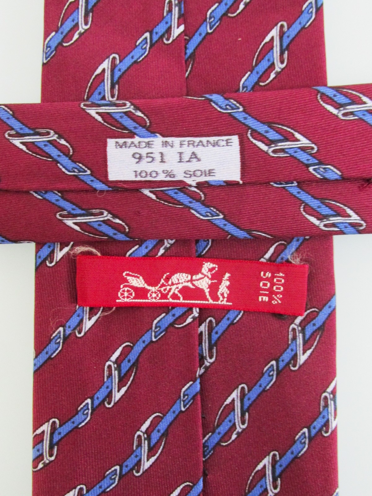 Description: Up for sale is a Hermes men's vintage silk tie. The print number is 951 IA. Hermes ties are handmade and hand-finished in France of 100% silk. Dimensions are approximately 55" long x 3.25" wide. It has a multicolored striped pattern in purple, white lite gray on a burgundy background. This tie is in excellent condition.