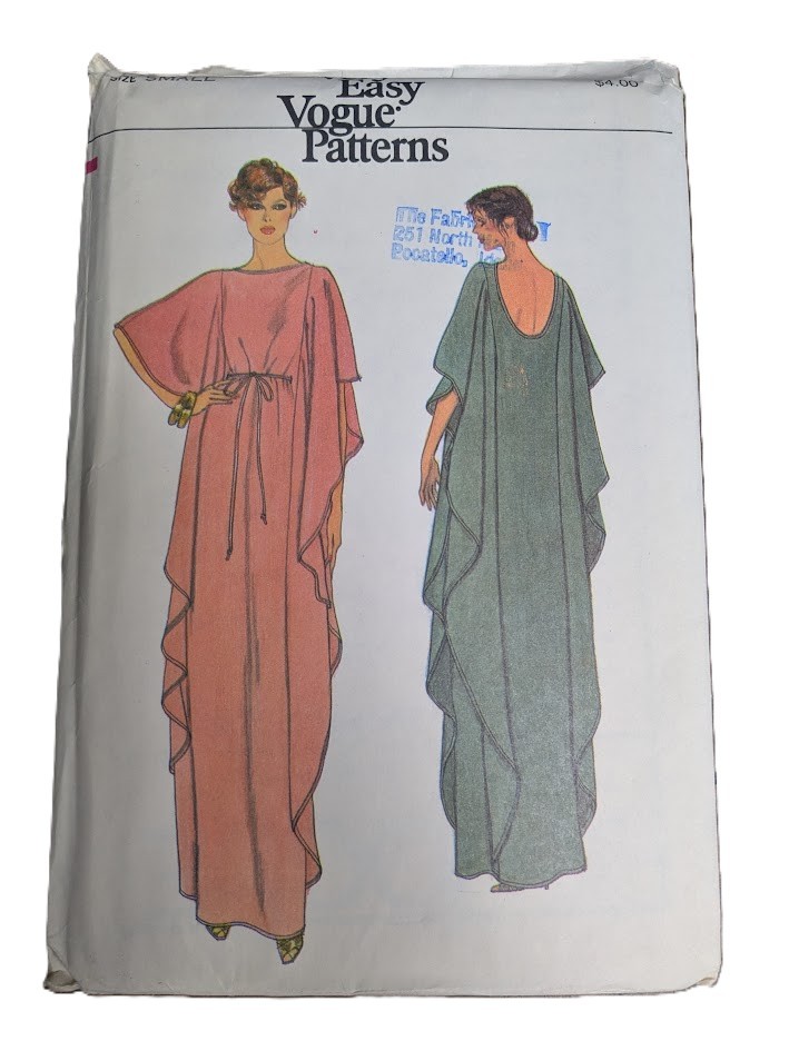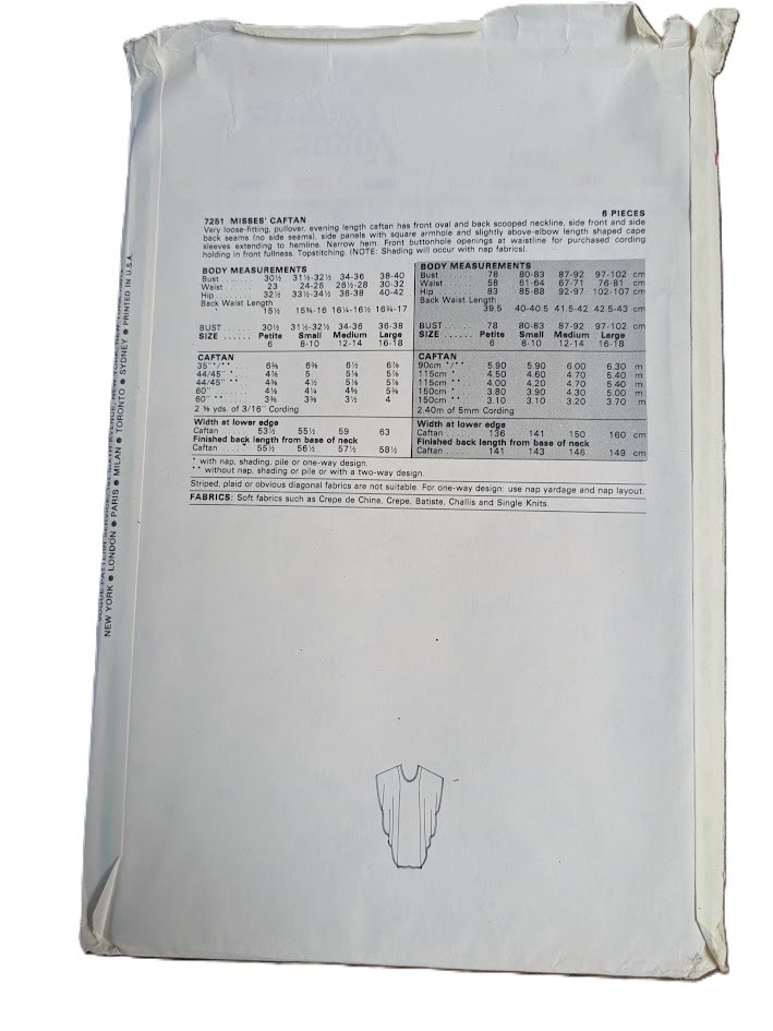 Small 31.5-32.5 Very Easy Vogue 7251; ca. 1979; Misses' Caftan. Very loose-fitting, pullover, evening length caftan has front oval and back scooped neckline, side front and side back seams (no side seams), side panels with square armhole and slightly above-elbow length shaped cape sleeves extending to hemline. Narrow hem. Front buttonhole openings at waistline for purchased cording holding in front fulness. Topstitching. (NOTE: Shading will occur with nap fabrics). *Like all vintage sewing patterns, these patterns may have envelope damage, creases, writing on envelope, tape on pattern pieces, and/or discoloration.