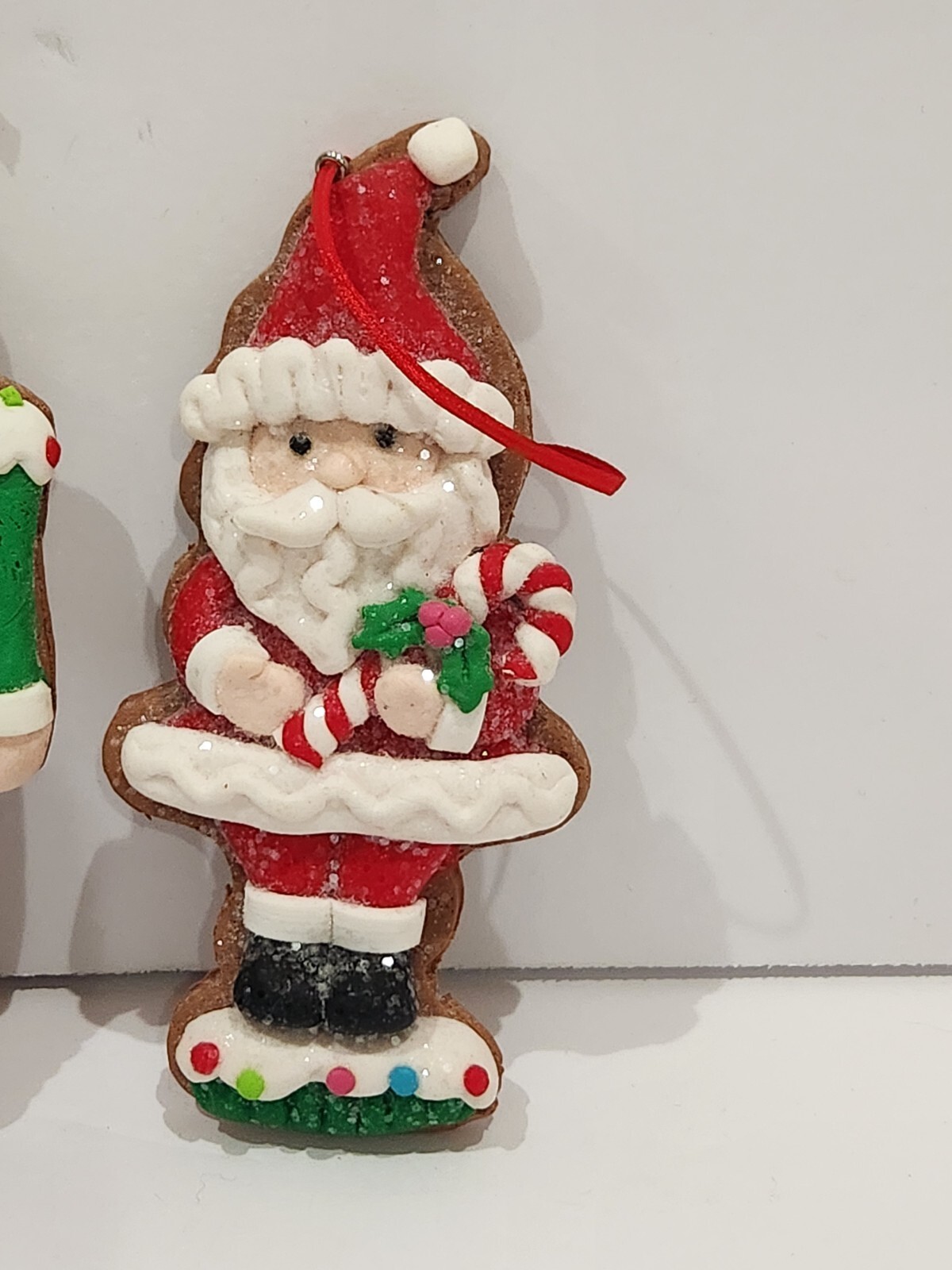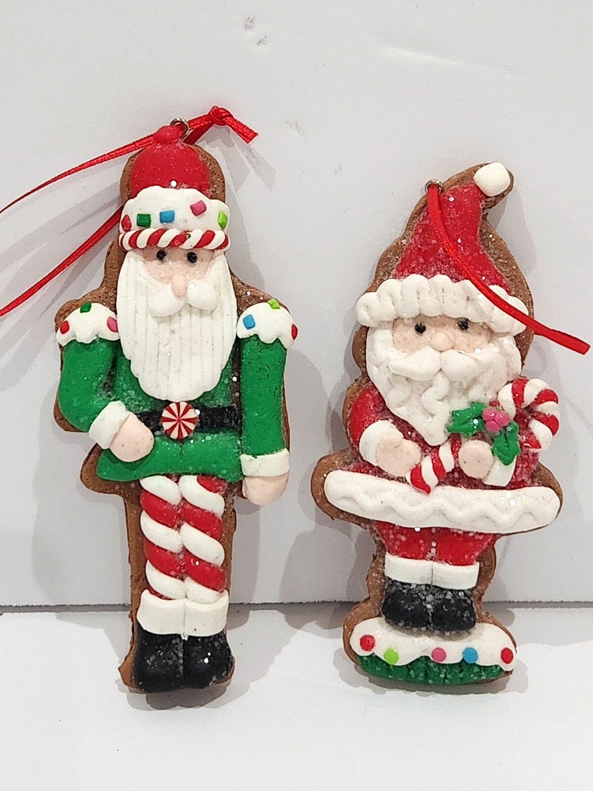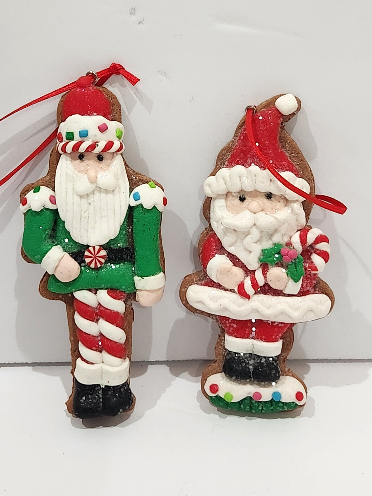 Up for sale is these adorable ornaments for your Christmas tree decor. The ornaments are made of claydough and there is a Santa and a Nutckracker. They stand approx 5.5" and 5" tall including round tip. Comes with the red ribbon for hanging. I have many more gingerbread decor in my store