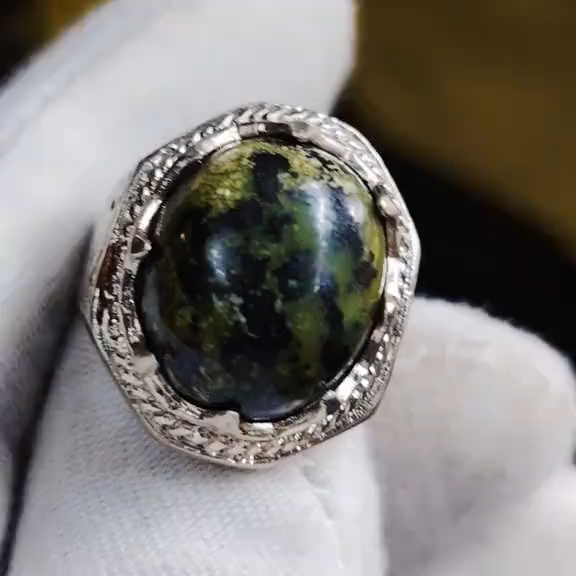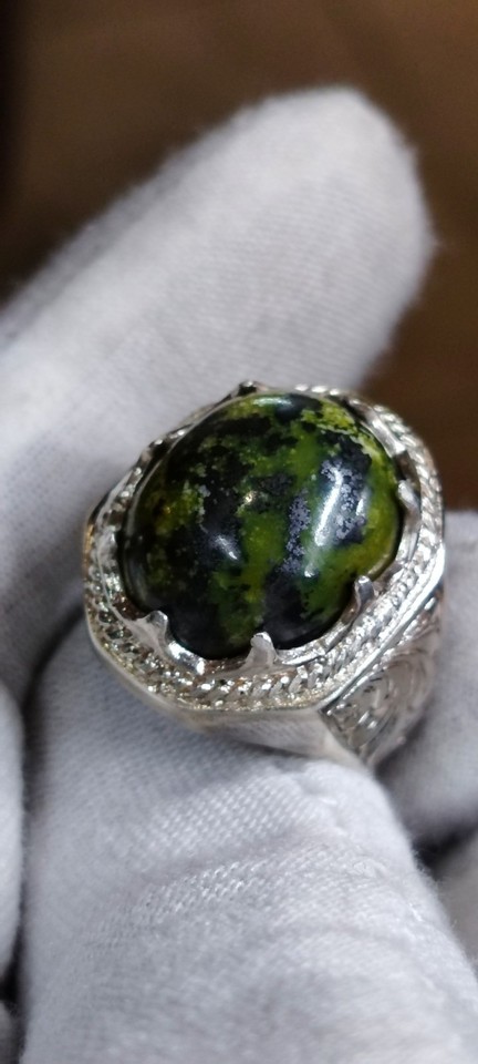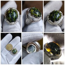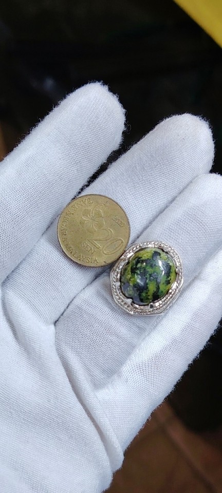 Authentic natural stone guaranteed from Mount Jerai. Grade type A features a green moss colour magnetic to iron. Ring with sterling silver band, sizes 16 Asia or 8 US able to resized and postage is worldwide. Available for purchase if interested. Thank you for your support ?.