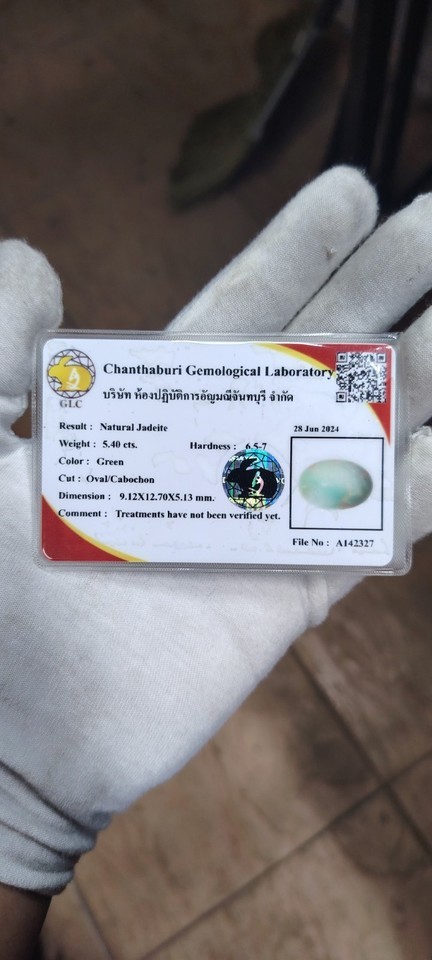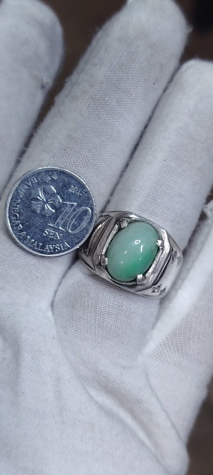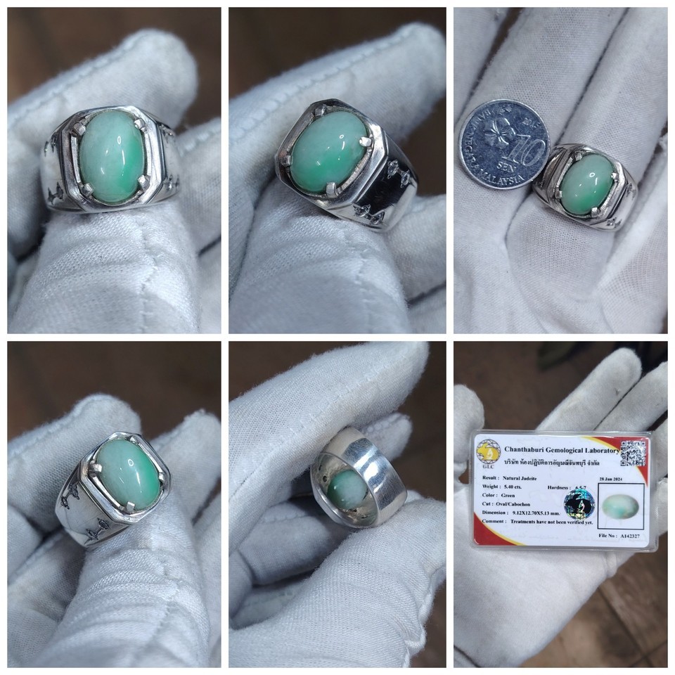 This stunning accessory features a natural, Jade with a total carat weight of 5.4. The jewellery purchase include lab certificate as photo. The beautiful green white cobochon-shaped gemstone is set in a simple silver 960 handmade ring with excellent cut grade. The ring is perfect for any occasion and is a great addition to any jewelry collection. The gemstone fit perfectly and has a secondary stones include zirconia. The gemstone have high quality with certified lab and is available in size 18 Asia/9 US . The size able to be resize kindly direct message me for any confirmation. The natural and earthy theme of the ring makes it a unique and special piece. Thank you for your support ??