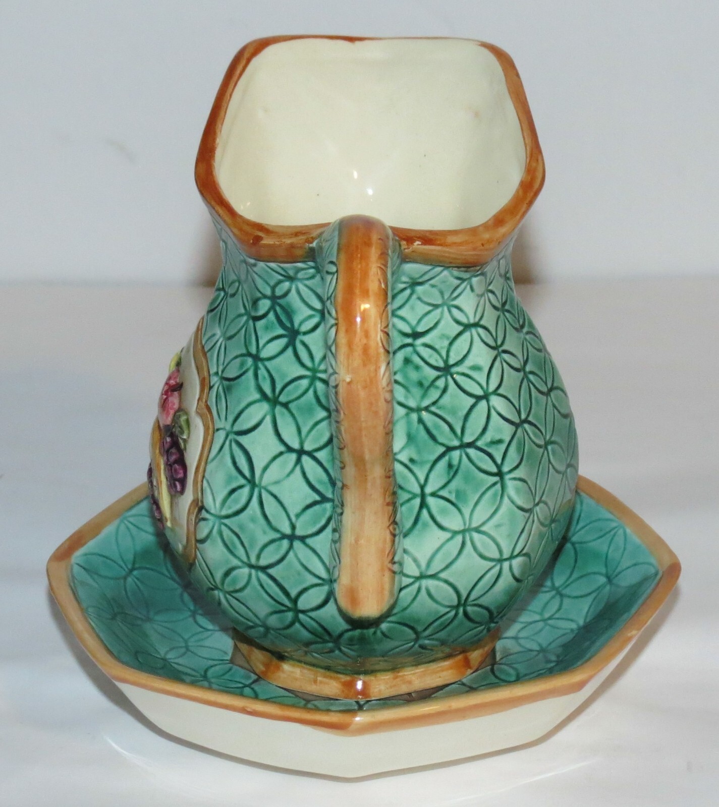 Vintage Enesco 5" Pitcher/Creamer & 5.5" Saucer, Molded Fruit Decor