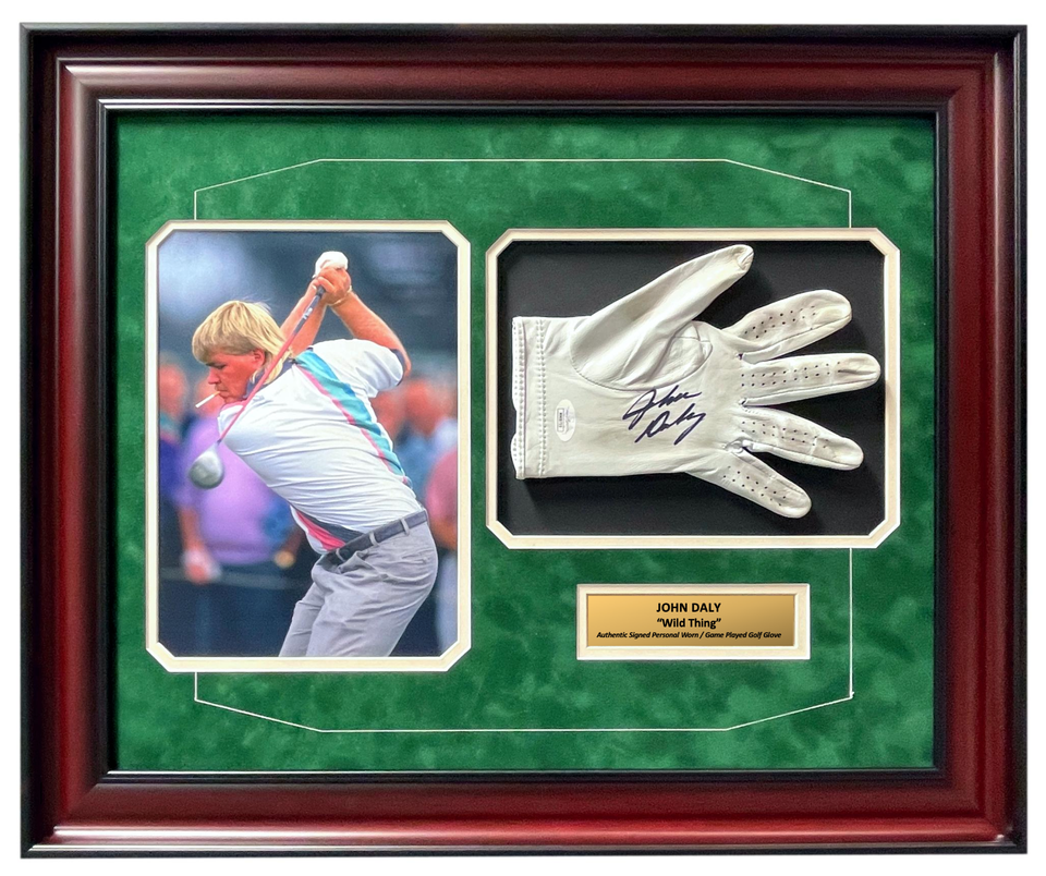 Golf Fans! This item is your calling featuring an autographed amp; personal worn / game played glove from John Daly!! It's rare that you find actual played golf equipment from big name golf pros as rarely do you see them offer great memorabilia like this! This glove was acquired directly from Mr. Daly as well as other gloves and signatures we have been getting from him directly for the past year or so. We include our Letter of Authenticity to guarantee it's the real thing you are buying and an authenticity guarantee from a big memorabilia brand in the industry. Included in this awesome framed collage is an iconic photo John Daly being John Daly on the golf course with a cigarette in his mouth! This photo was taken of "Wild Thing" at the 1992 British Open, cigarette in his mouth and all. This item is professionally museum quality custom framed in a cherry frame that features double matting throughout including a top suede green mat as well as a glass display and gold nameplate depicting information about John Daly and this autographed used collectible. This frame measures approximately 20" x 16". This is a must-have item for any fans or collectors of unique Golf or John Daly memorabilia! AUTHENTICITY: This autograph on this item has been certified authentic by one of the most reputable and recognized authenticators in the business today, James Spence Authentication. This item comes with a JSA numbered tamper-proof authentication sticker and matching COA card that can be reviewed on their website 24/7/365. Each golf glove will come with a Letter of Authenticity from Inscriptagraphs Memorabilia, guaranteeing the glove is authentic. On this letter, you will see an actual picture of the golf glove to directly correlate that glove to this letter of authenticity. Please note: The item listed in this listing is a stock photo and you will receive a comparable item to the one pictured. You will receive a different glove than what is pictured whereas the autograph location and pen color could change, as well as the amount of "use" on each glove from Mr. Daly does vary.