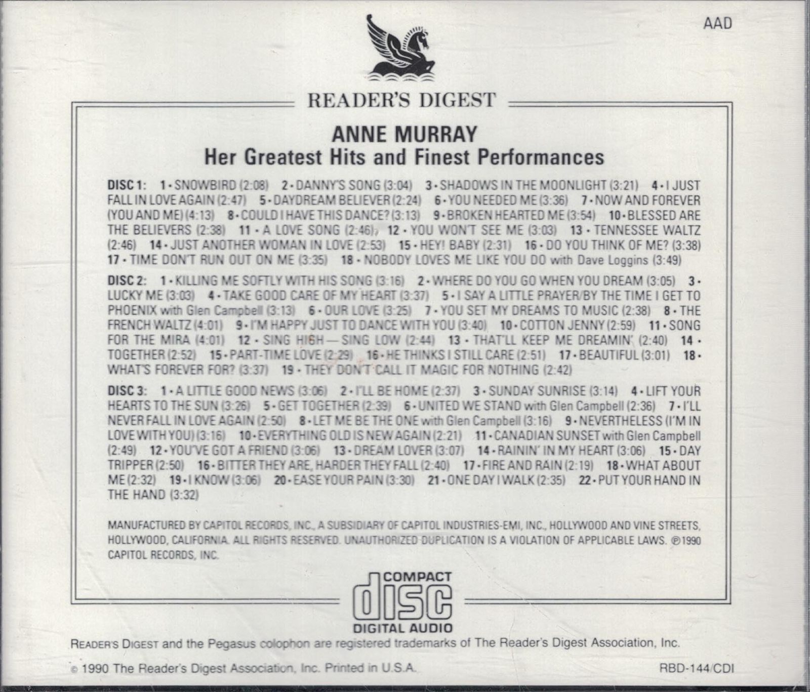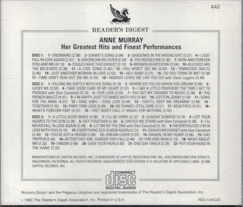 Product description: 3 CD set w/ 59 of Anne Murray's best songs. DISC 1: 1 (2:11) Snowbird, 2 (2:55) Danny's Song, 3 (3:22) Shadows In The Moonlight, 4 (2:49) I Just Fall In Love Again, 5 (2:26) Daydream Believer, 6 (3:37) You Needed Me, 7 (4:15) Now And Forever (You And Me), 8 (3:15) Could I Have This Dance , 9 (3:55) Broken Hearted Me, 10 (2:39) Blessed Are The Believers, 11 (2:49) A Love Song, 12 (3:06) You Won't See Me, 13 (2:47) Tennessee Waltz, 14 (2:55) Just Another Woman In Love, 15 (2:32) Hey Baby, 16 (3:39) Do You Think Of Me, 17 (3:36) Time Don't Run Out On Me, 18 (3:48) Nobody Loves Me Like You Do (w/ Dave Loggins) DISC 2: 1 (3:17) Killing Me Softly With His Song, 2 (3:06) Where Do You Go When You Dream, 3 (3:05) Lucky Me, 4 (3:38) Take Good Care Of My Heart, 5 (3:13) I Say A Little Prayer/By The Time I Get To Phoenix (W/ Glen Campbell), 6 (3:27) Our Love, 7 (2:40) You Set My Dreams To Music, 8 (4:02) The French Waltz, 9 (3:41) I'm Happy Just To Dance With You, 10 (3:01) Cotton Jenny, 11 (4:02) Song For The Mira, 12 (2:45) Sing High--Sing Low, 13 (2:41) That'll Keep Me Dreamin', 14 (2:53) Together, 15 (2:31) Part-Time Love, 16 (2:53) He Thinks I Still Care, 17 (3:02) Beautiful, 18 (3:39) What's Forever For, 19 (2:41) They Don't Call It Magic For Nothing DISC 3: 1 (3:07) A Little Good News, 2 (2:38) I'll Be Home, 3 (3:15) Sunday Sunrise, 4 (3:26) Lift Your Hearts To The Sun, 5 (2:40) Get Together, 6 (2:38) United We Stand (W/ Glen Campbell, 7 (2:51) I'll Never Fall In Love Again, 8 (3:17) Let Me Be The One (W/ Glen Campbell), 9 (3:16) Nevertheless (I'm In Love With You), 10 (2:22) Everything Old Is New Again, 11 (2:50) Canadian Sunset (W/ Glen Campbell), 12 (3:06) You've Got A Friend, 13 (3:09) Dream Lover, 14 (3:07) Rainin' In My Heart, 15 (2:51) Day Tripper, 16 (2:41) Bitter They Are, Harder They Fall, 17 (2:21) Fire And Rain, 18 (2:39) What About Me, 19 (3:15) I Know, 20 (3:49) Ease Your Pain, 21 (2:46) One Day I Walk, 22 (3:32) Put Your Hand In The Hand