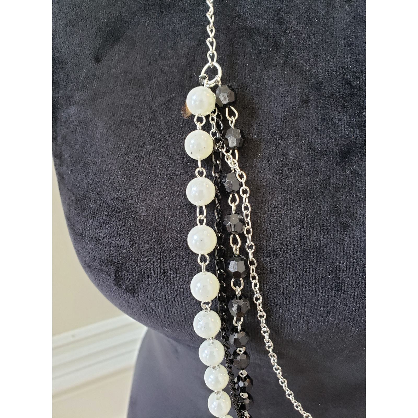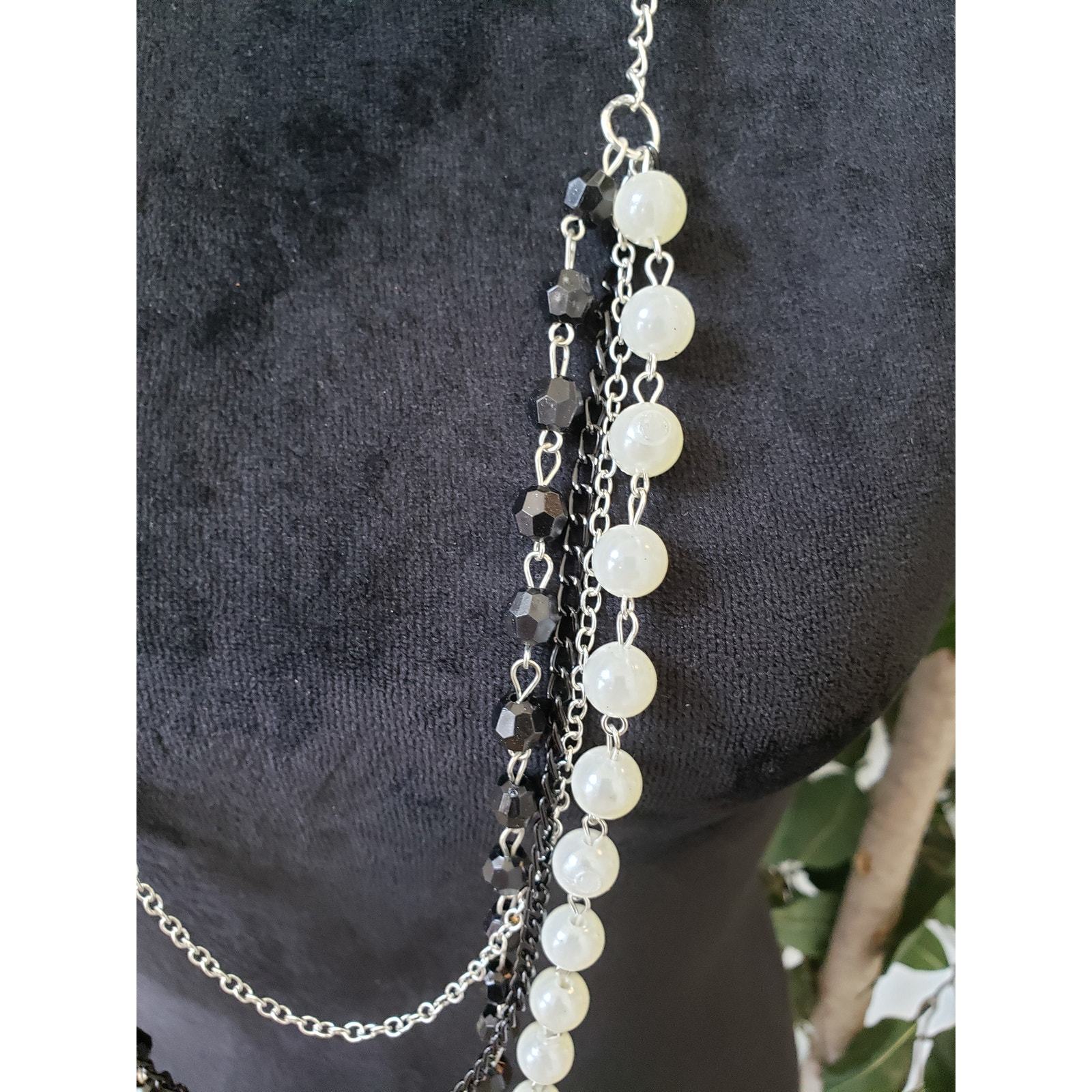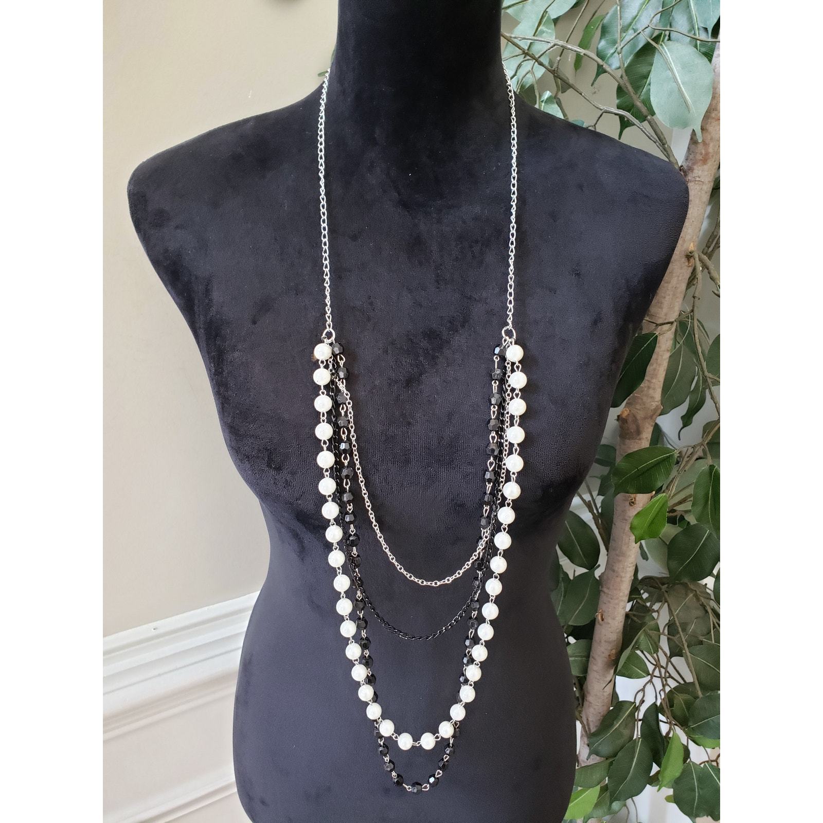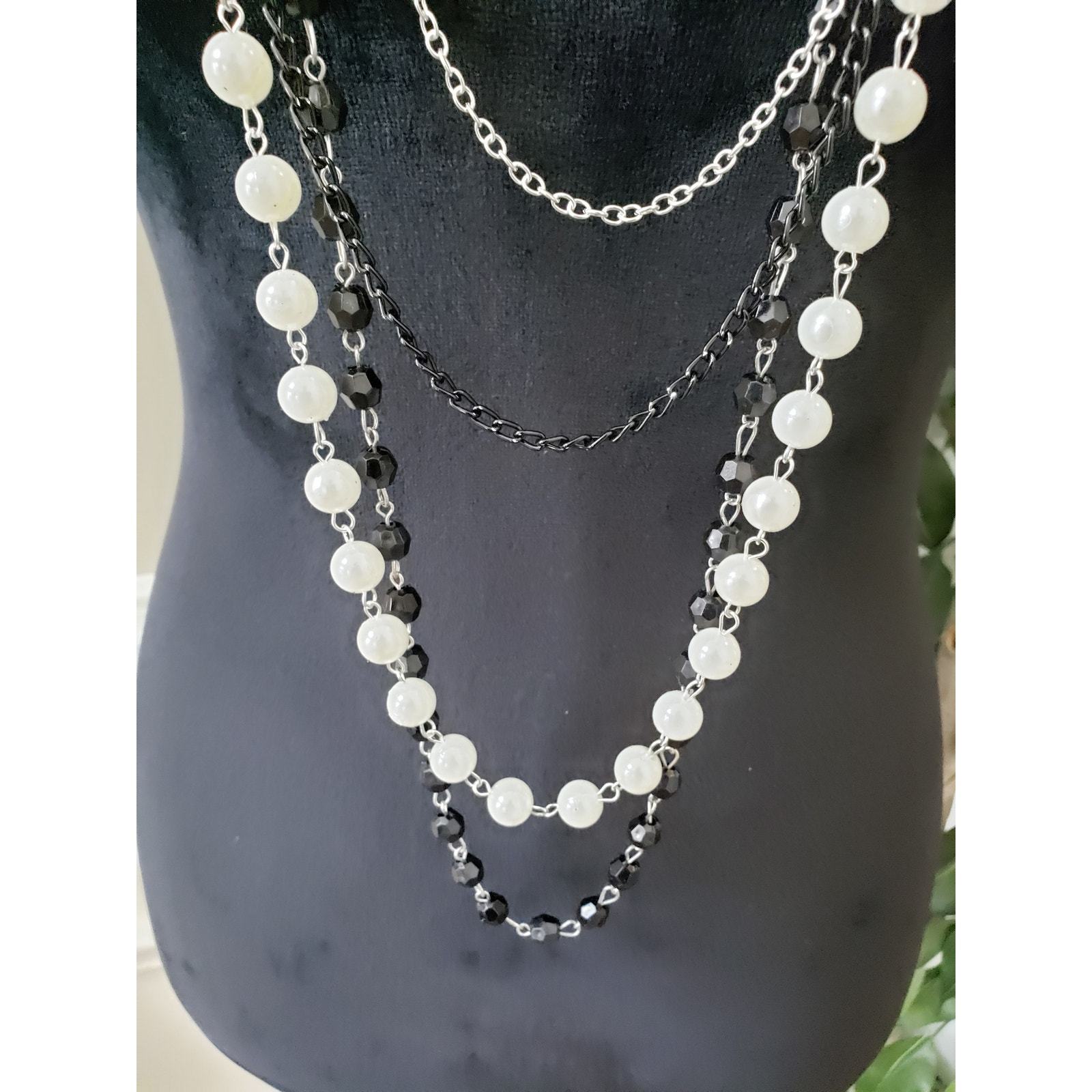 Women Two Tone Faux Pearls Faceted Round Beads Multi Strand Chains Long Necklace.