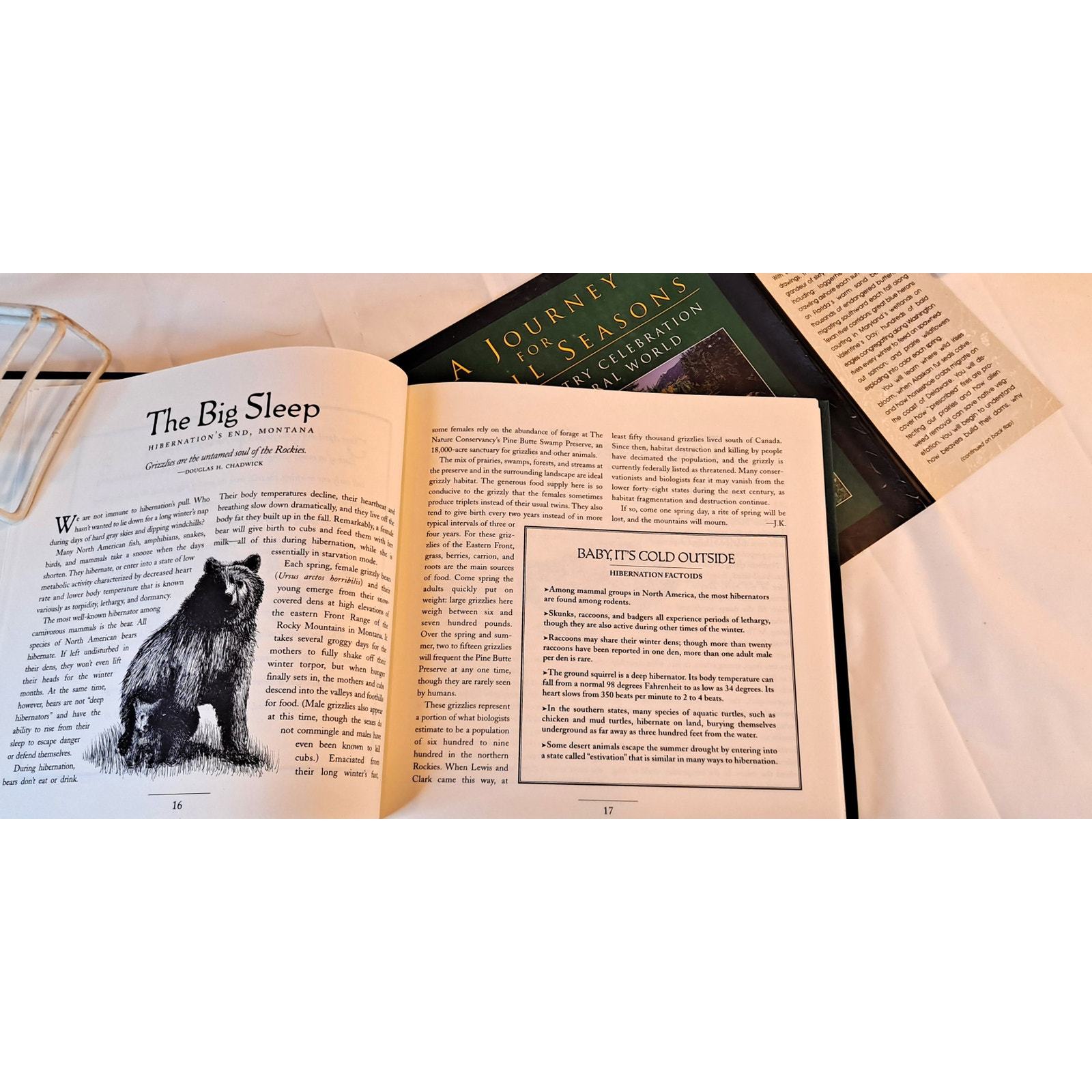 "The book begins with an examination of hibernation and focuses on the grizzly bears of the Rocky Mountains. The accompanying sidebar contains hibernation factoids, such as that the most hibernators found in North American mammal groups are rodents. The first summer entry is about bald cypress trees along the Black River of North Carolina. The sidebar explains about the cypress "knees." Autumn takes a look at the boreal bog, Cranesville Swamp, of West Virginia and its strange inhabitants. The sidebar provides an overview of types of wetlands. Winter includes taking winter identification walks and removing alien species in Hawaii. The sidebars tell how to fine-tune your senses to the natural world around you, why Hawaii is so vulnerable to alien species and what you can do to help.