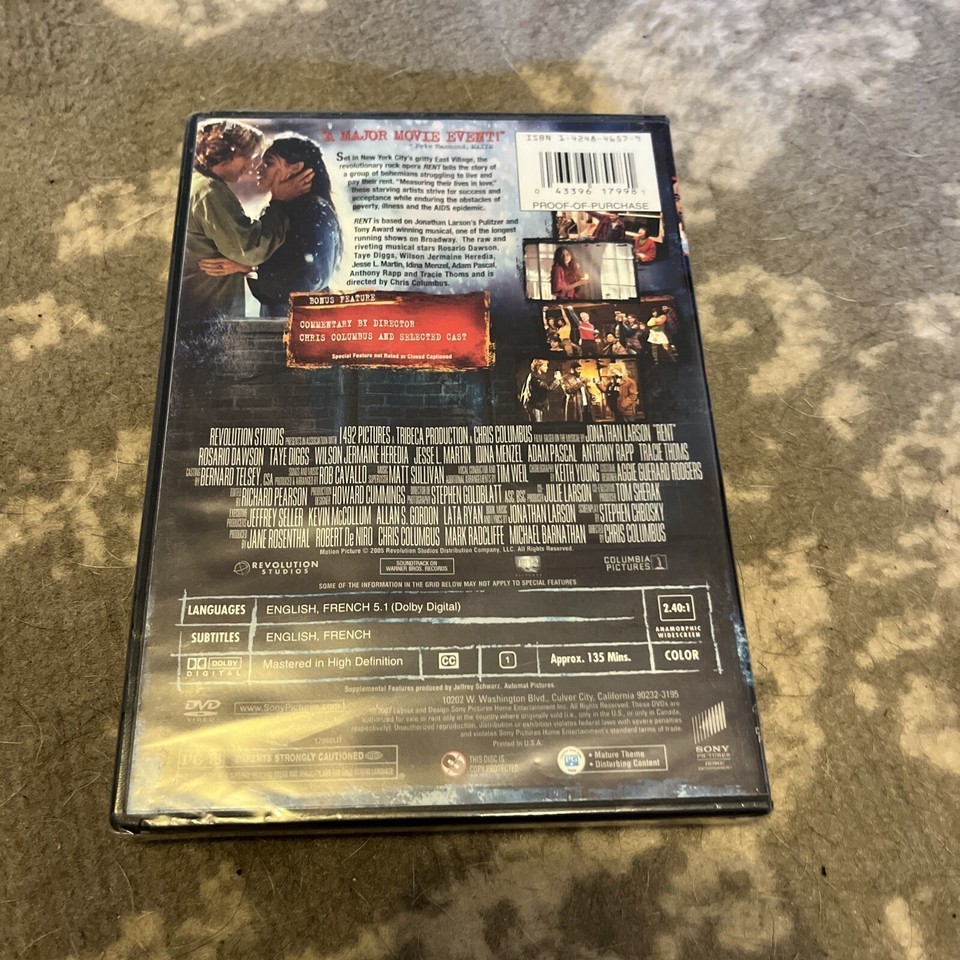 Experience the award-winning musical drama, Rent, with this brand new, factory-sealed DVD. Directed by Chris Columbus and starring Rosario Dawson, Taye Diggs, and Idina Menzel, this PG-13 rated film adaptation is a must-have for any fan of musicals. The 135-minute runtime will have you singing along to the beloved songs and following the heart-wrenching story of a group of struggling artists in New York City's East Village.