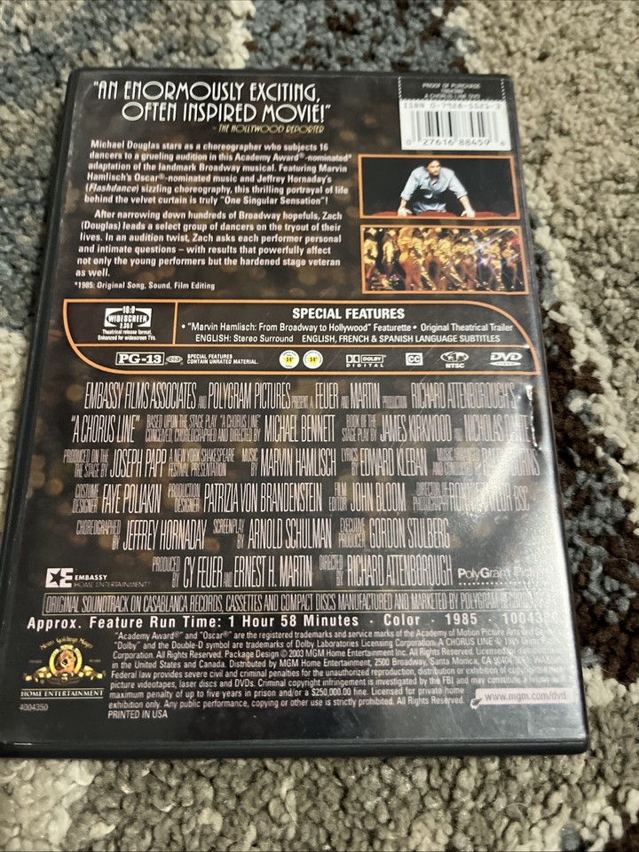 "A Chorus Line" is a 1985 DVD release of the Broadway musical directed by Richard Attenborough. The film features a score by Marvin Hamlisch and runs for 118 minutes in widescreen format. Produced by Cy Feuer, Ernest H. Martin, and Joseph Papp, the movie is rated PG-13 and offers subtitles in English, French, and Spanish. With a focus on drama within the musical genre, this production captures the essence of the original stage performance for viewers to enjoy at home.