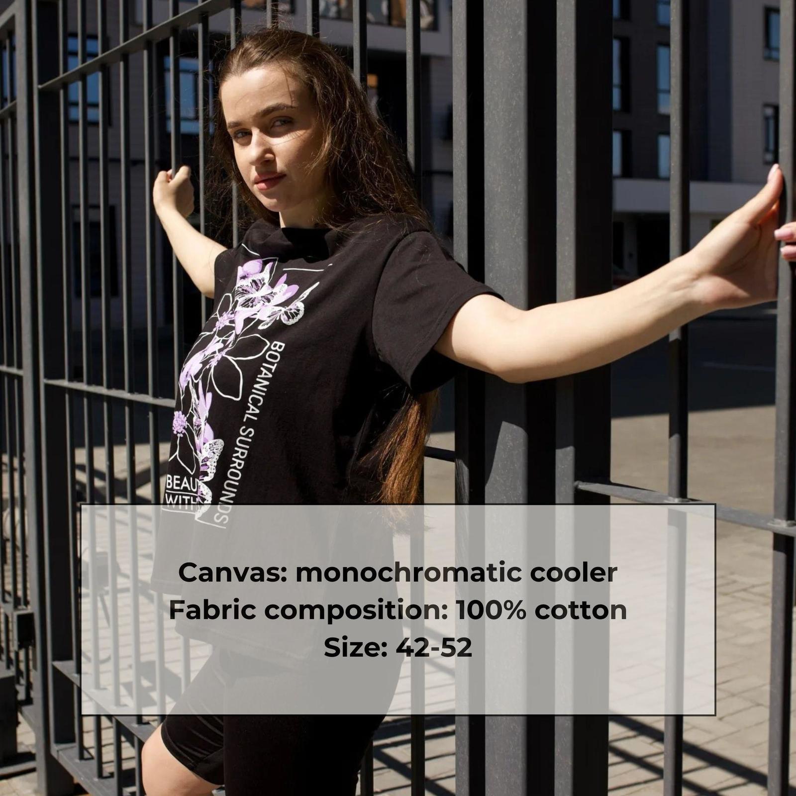 Check out our women's oversized t-shirt! Made of 100% cotton, available in sizes 42-52 and colors: white, lilac, mustard, emerald, purple, black. The T-shirt has dropped sleeves, a round neck and a contrasting print. Perfect for pairing with jeans, shorts, skirts and classic trousers.