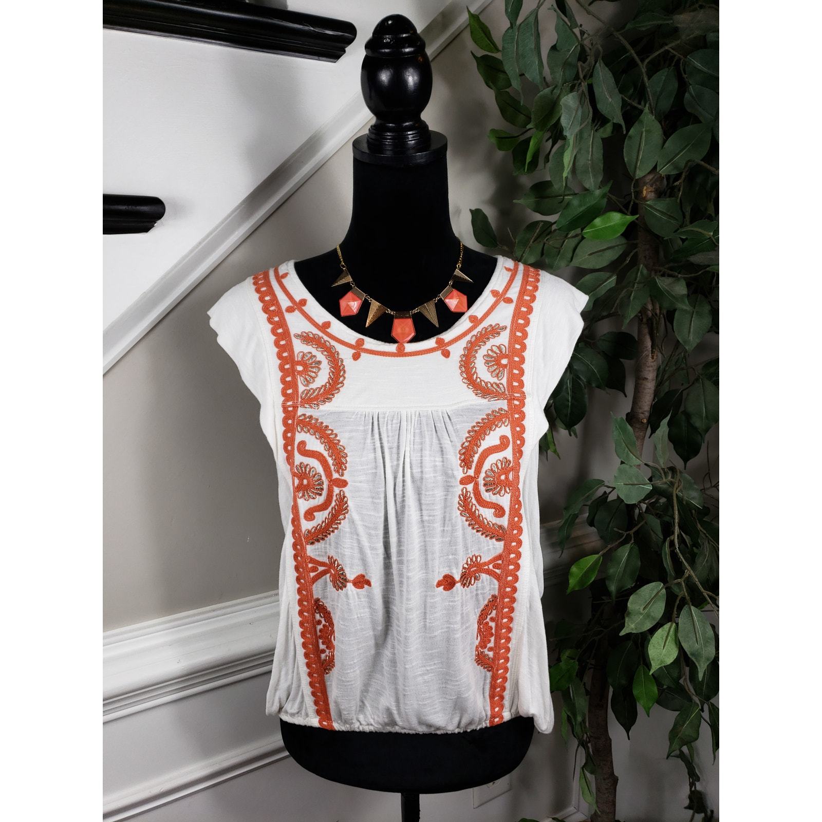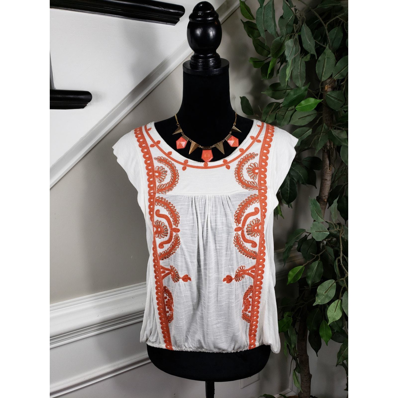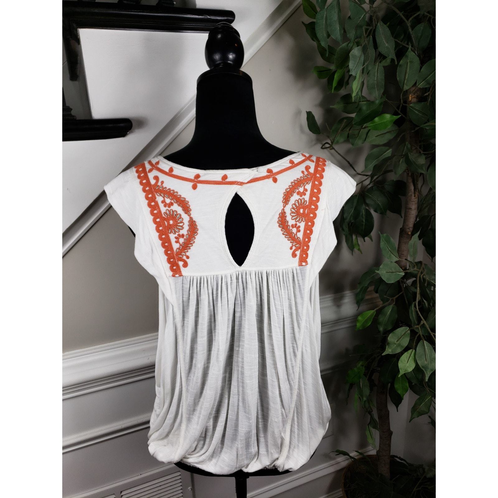 Free People Top Women XS White Orange Embroidered Boho Keyhole Cotton