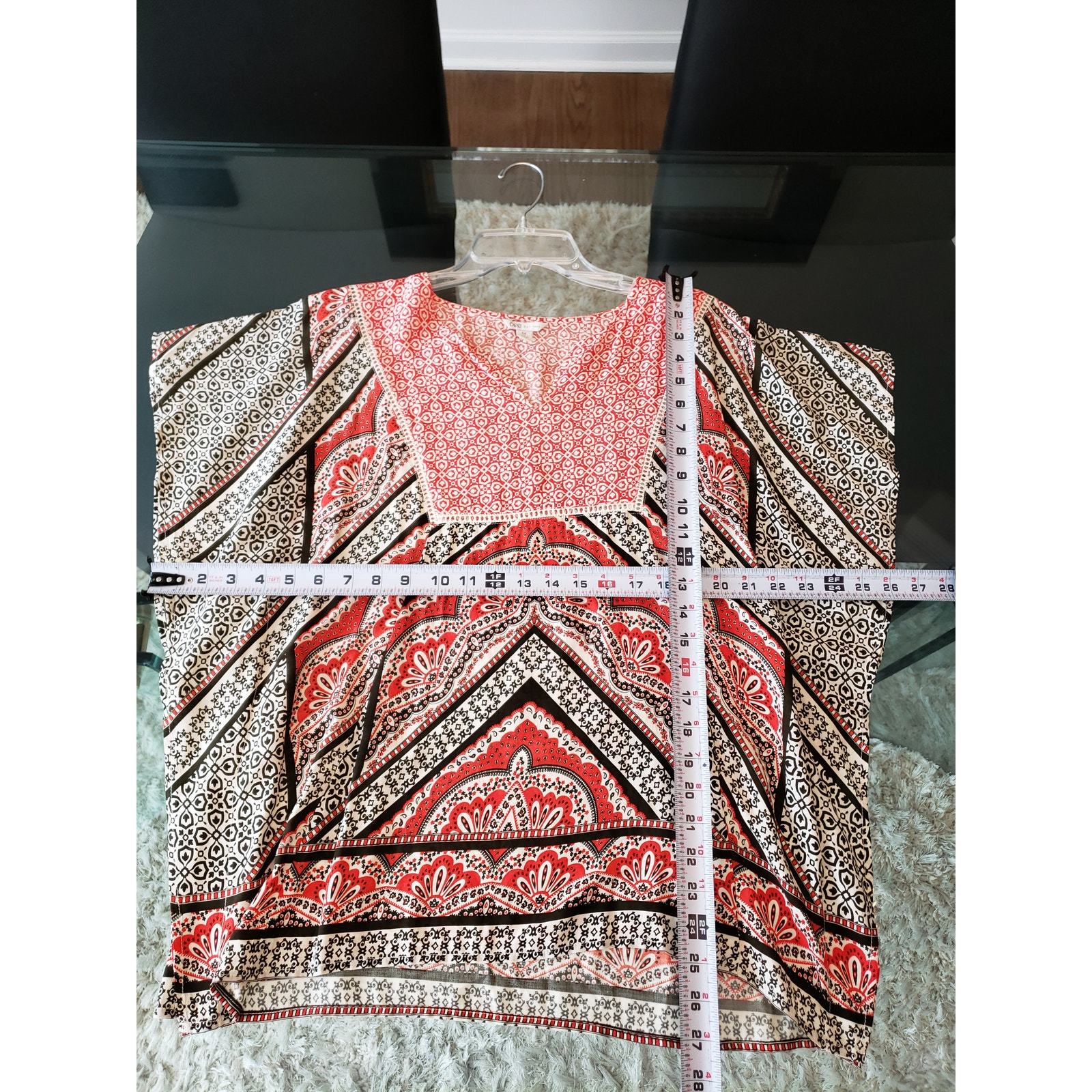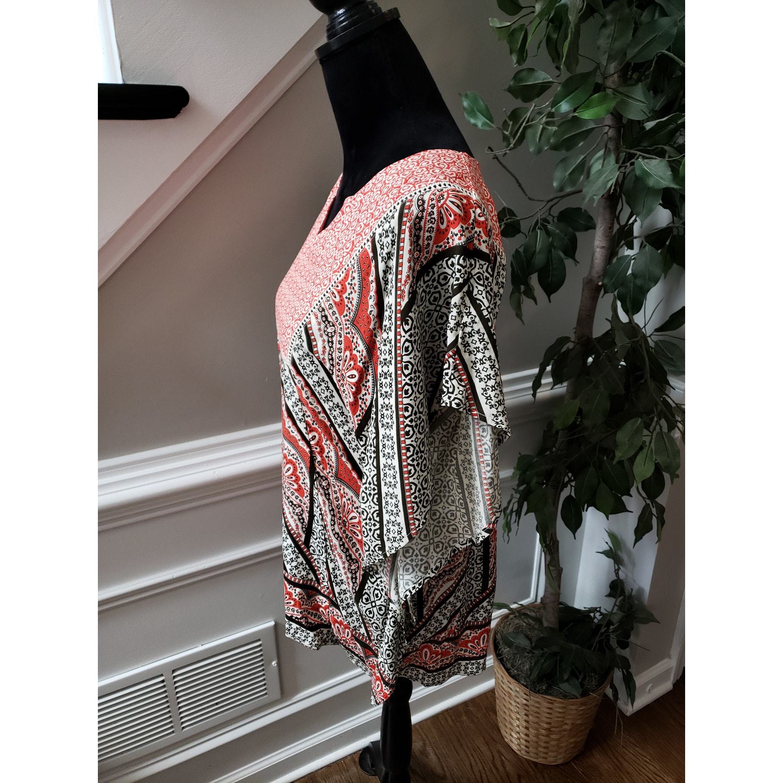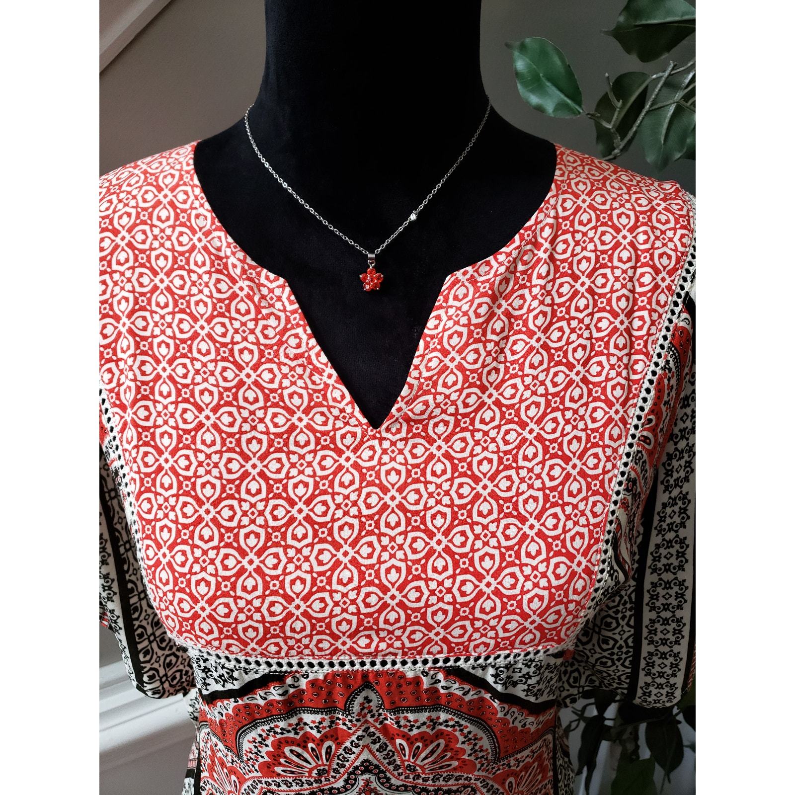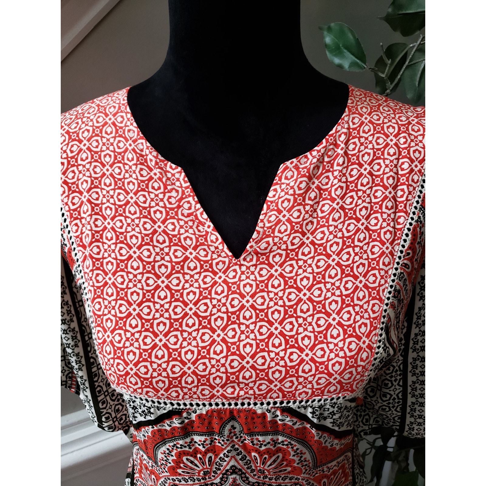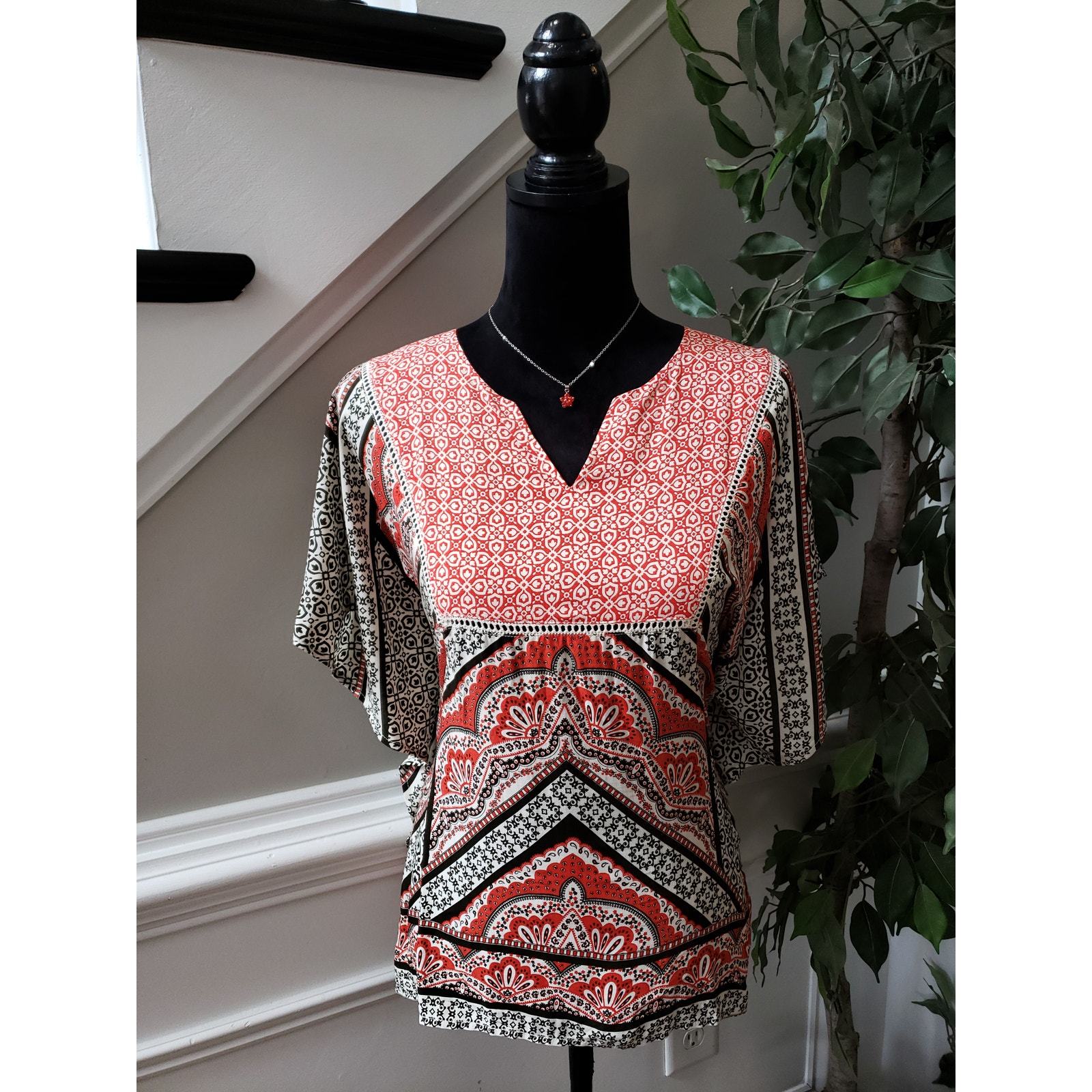 Elevate your wardrobe with this Cato women's medium blouse featuring a stunning red, white, and black geometric boho print. Made of soft rayon with cotton patch details, it's lightweight and perfect for warm weather. The relaxed fit and split neckline create an effortlessly stylish silhouette ideal for casual or office wear.
