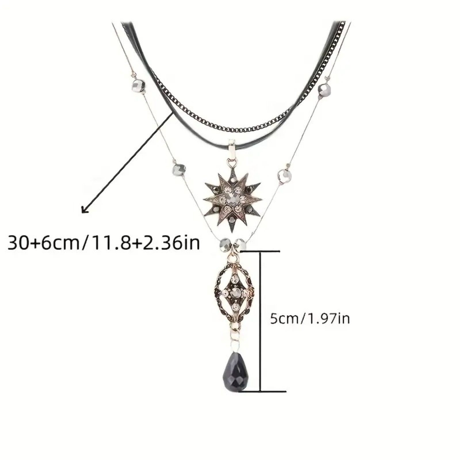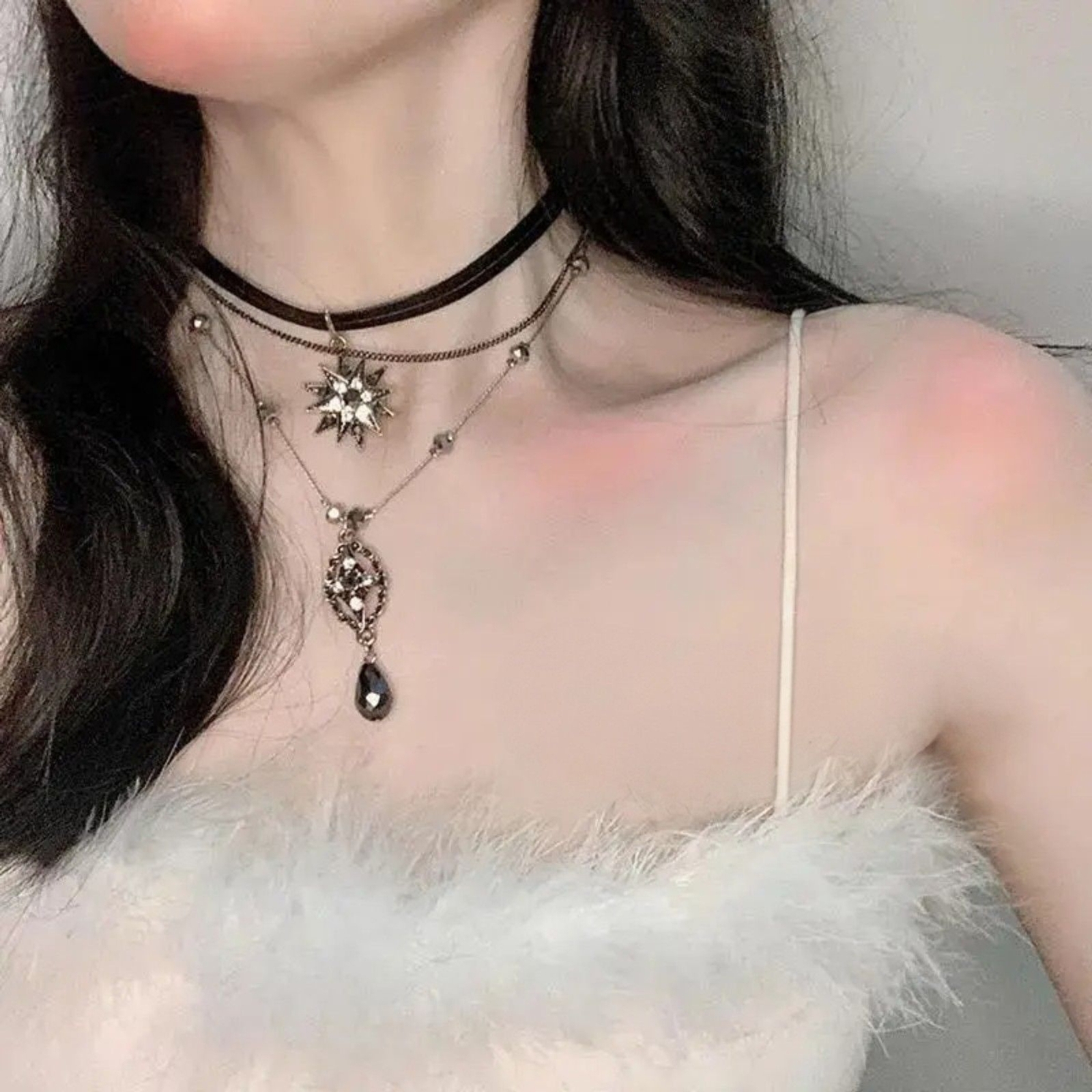 Add mystique and elegance to your outfit with this Gothic Celestial Layered Choker Necklace, a must-have statement piece for vintage, dark academia, and alt fashion lovers. This multi-layer necklace features a sleek black velvet choker, a starburst crystal charm centerpiece, and a beaded chain that leads to a dramatic antique-style teardrop pendant.