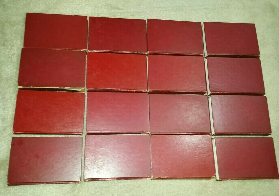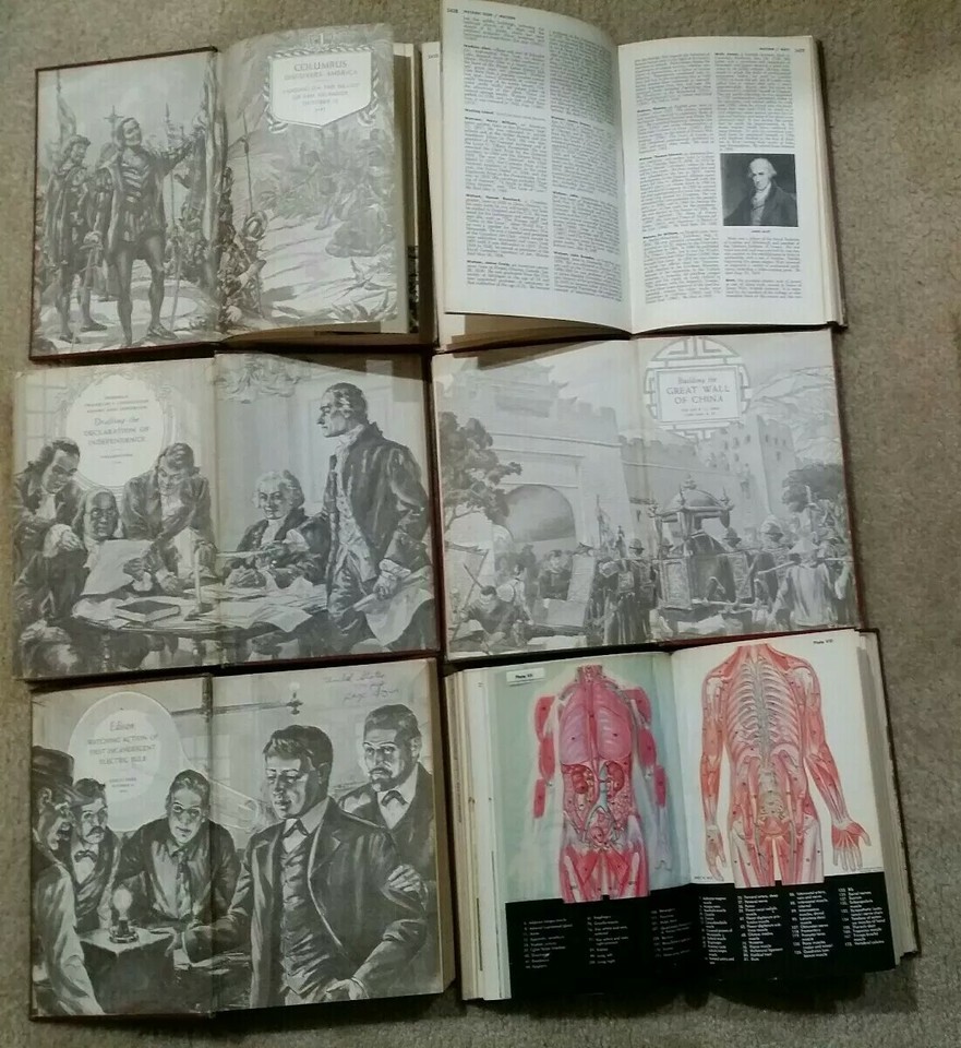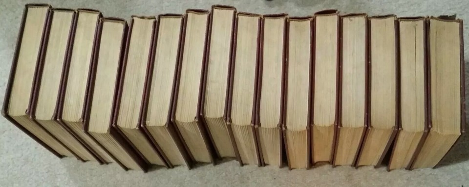 These were originally bought brand new and from years of heavy use, they have gotten damaged. Several volumes have damage to the spine of cover, stains, dust, rips, tears, faded, discolored, misc doodling and writing, dog eared pages from heavy use and studying growing up using these as children through adults in college until they sat on display in a bookcase for many years after.