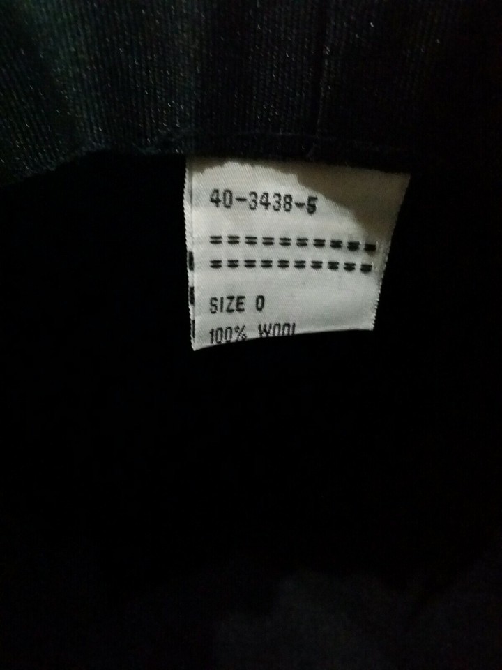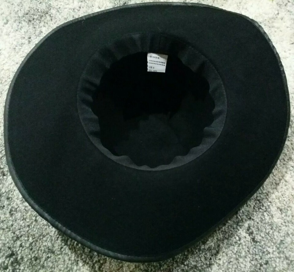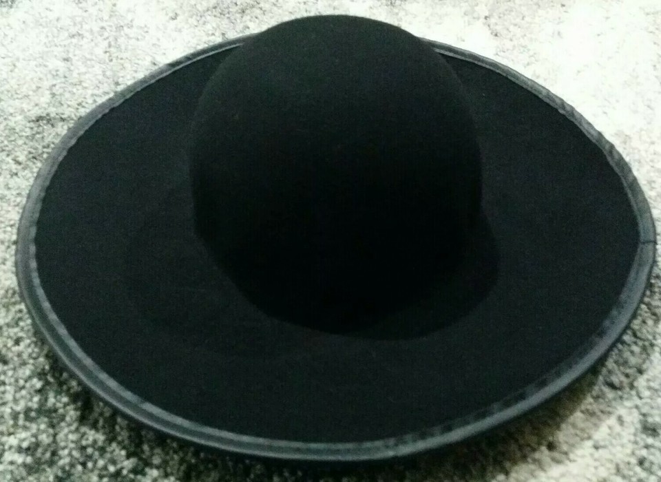 This is a listing for a pre-owned women's vintage Wide-Brim Black 100% Wool Felt Hat with Faux Leather around the brim as pictured.